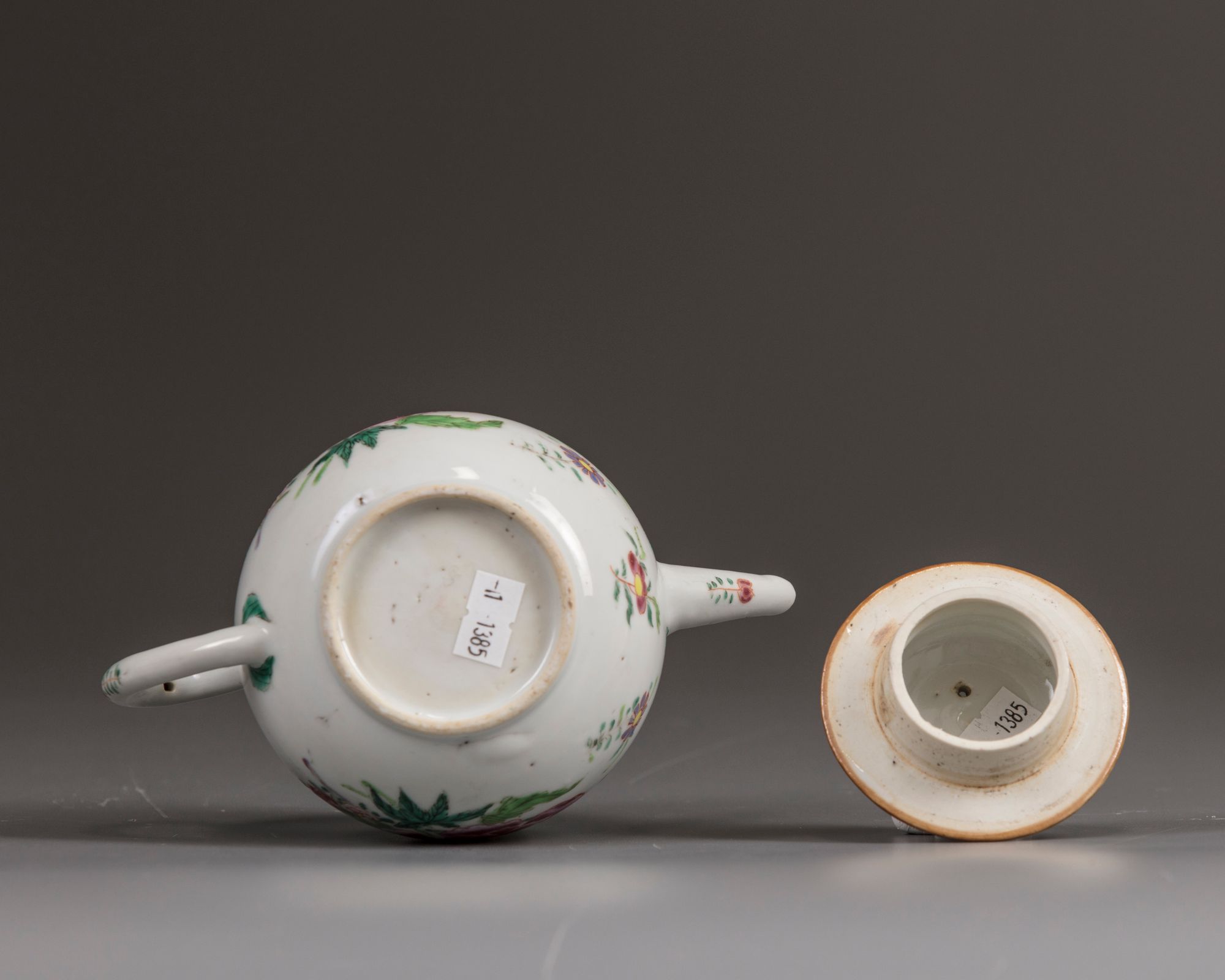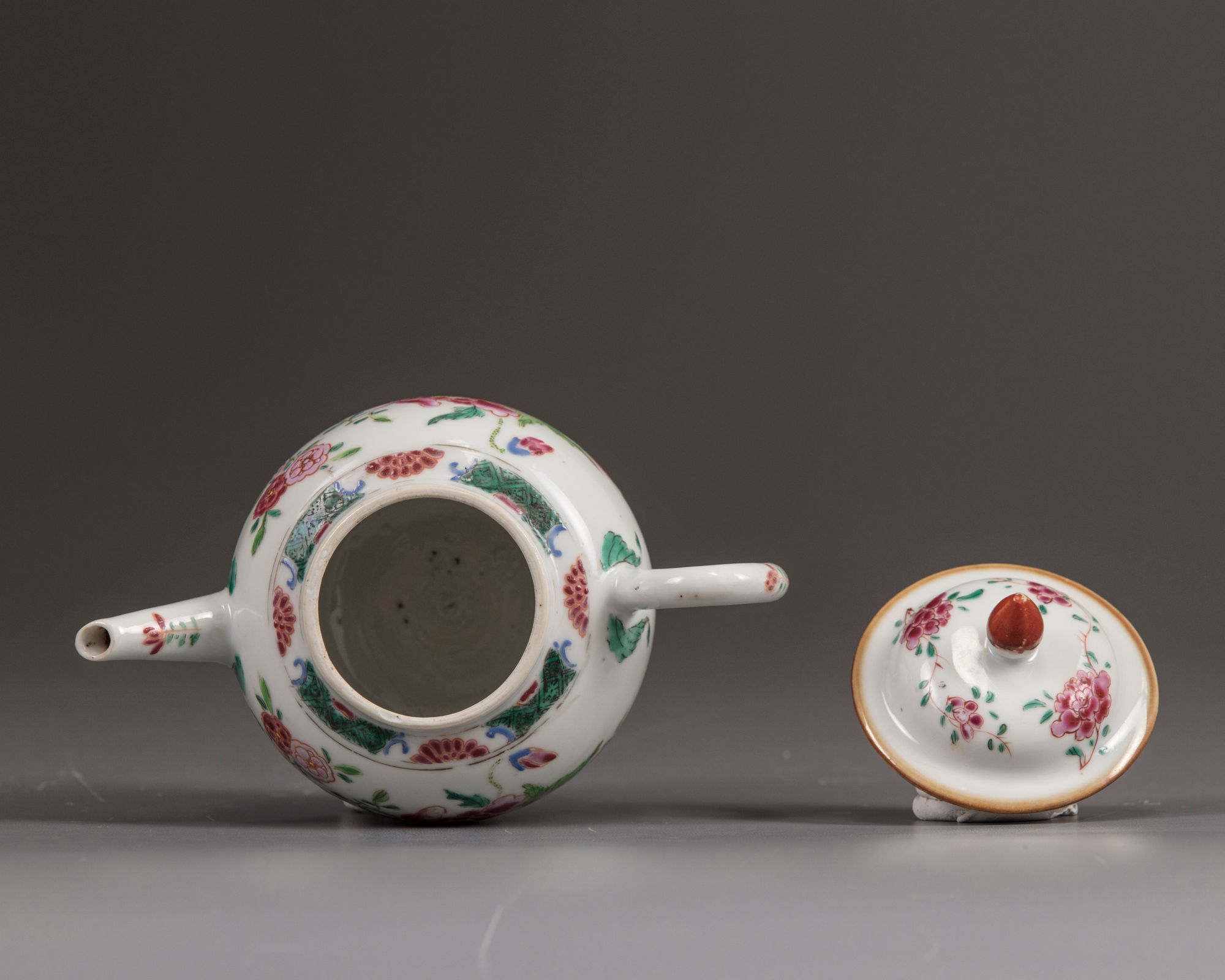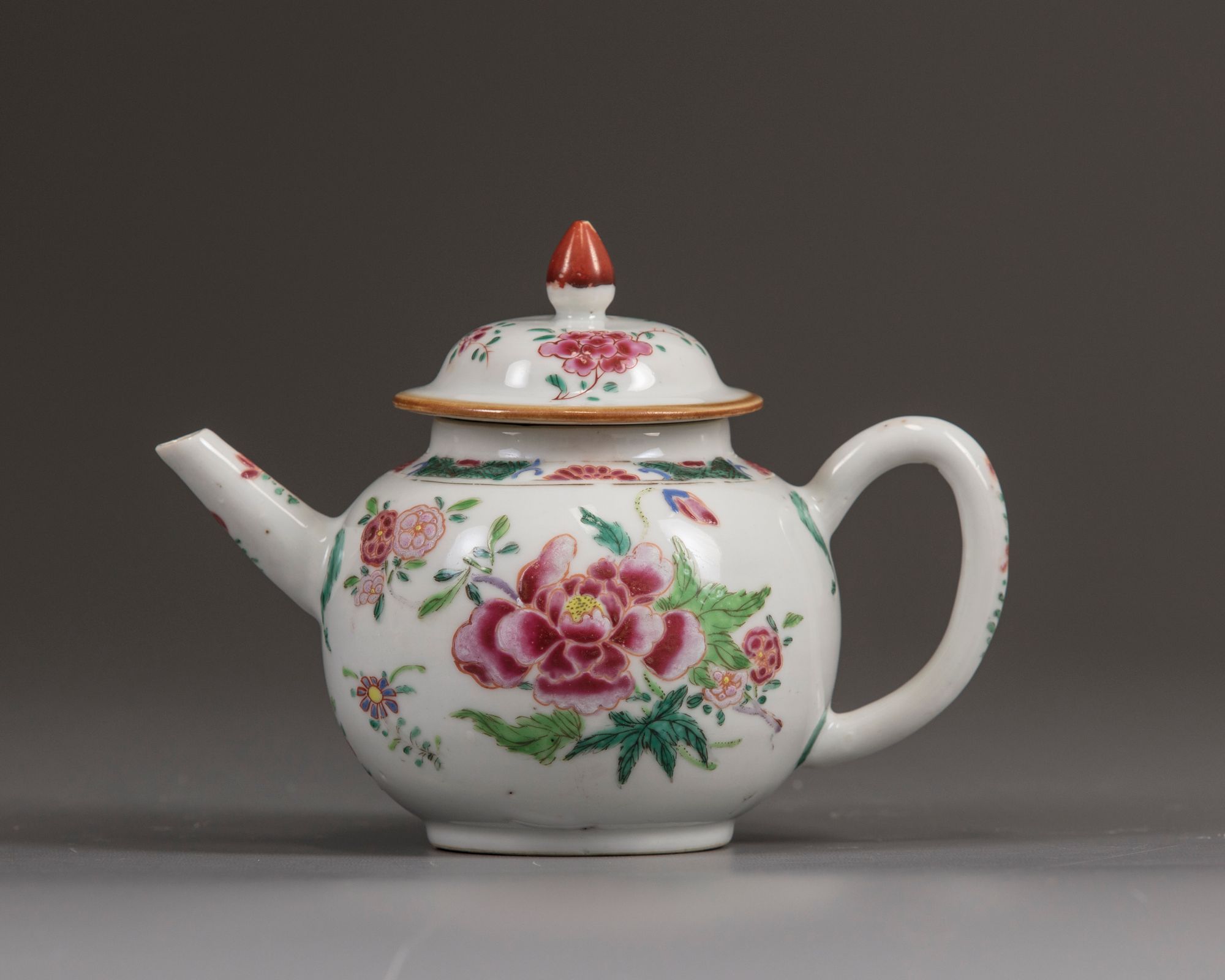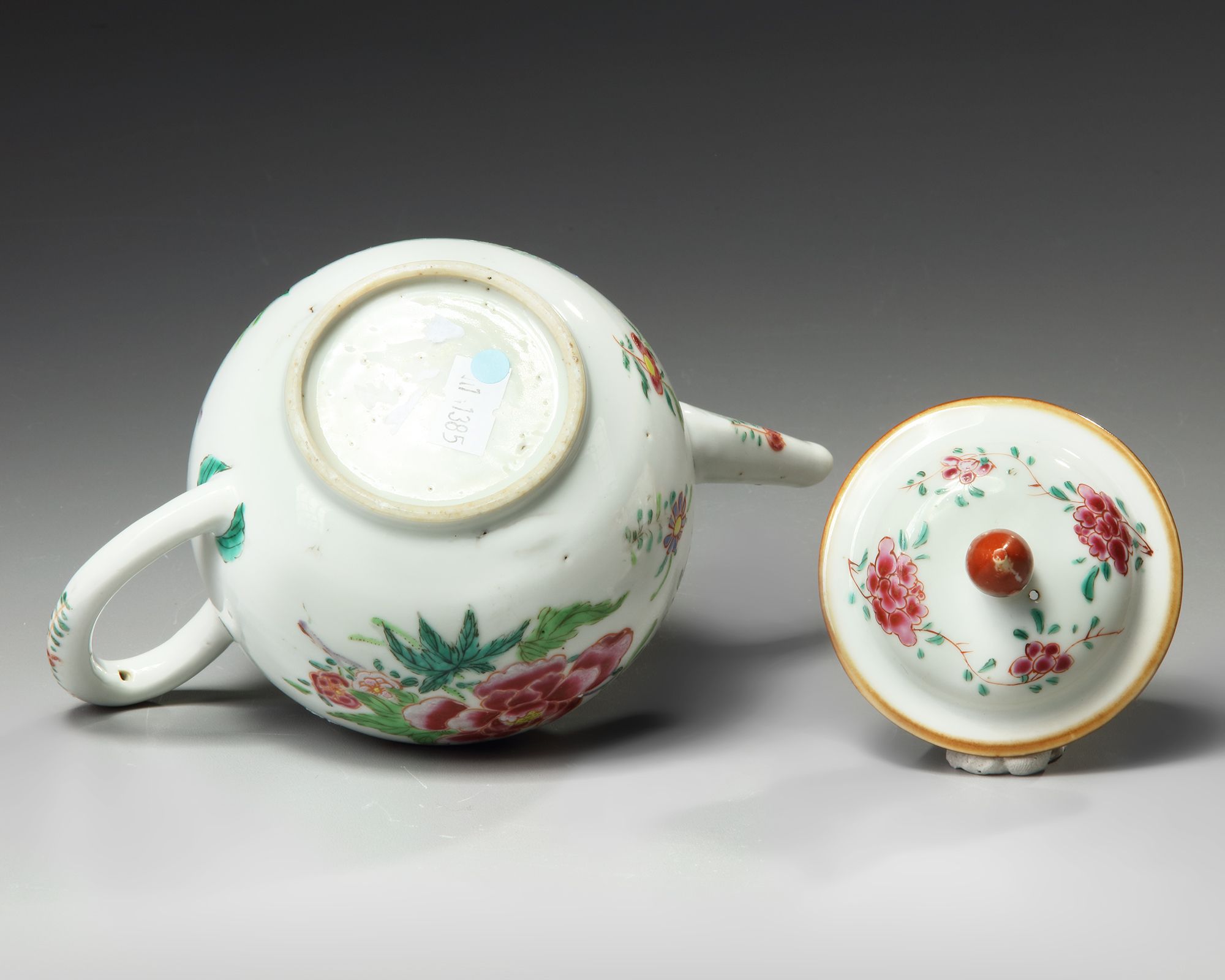 The teapot is boldly decorated with large scattered peony sprays amongst scattered flowers below a diaper band with half-floral cartouches. The rim is decorated with further flower sprays and is surmounted by an iron-red lotus bud finiai.