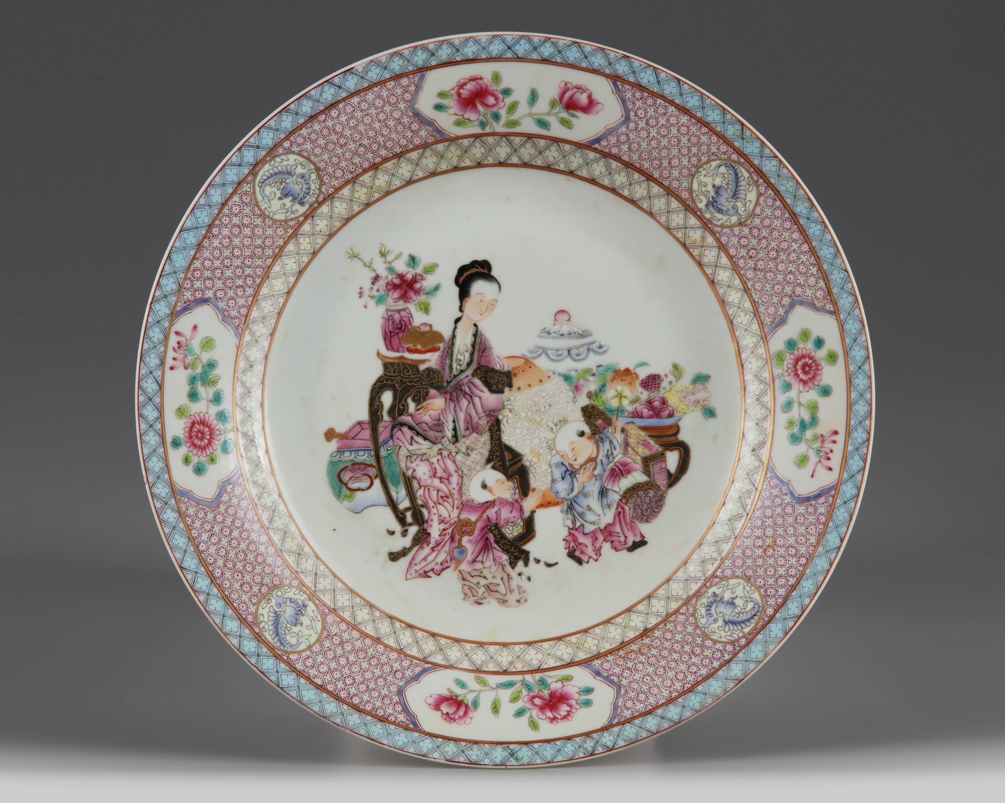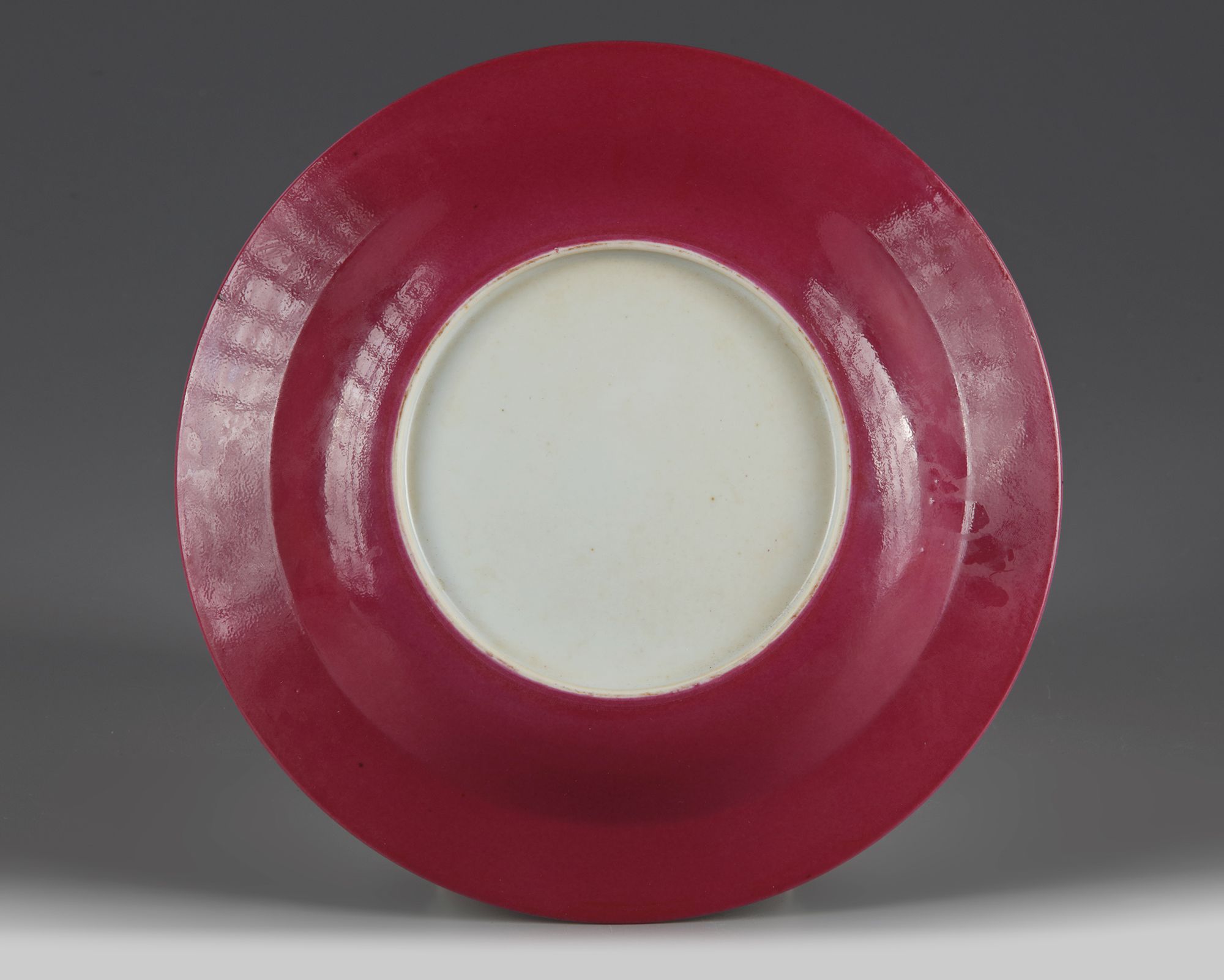 A Chinese famille rose ruby-back 'lady & boys' dish
