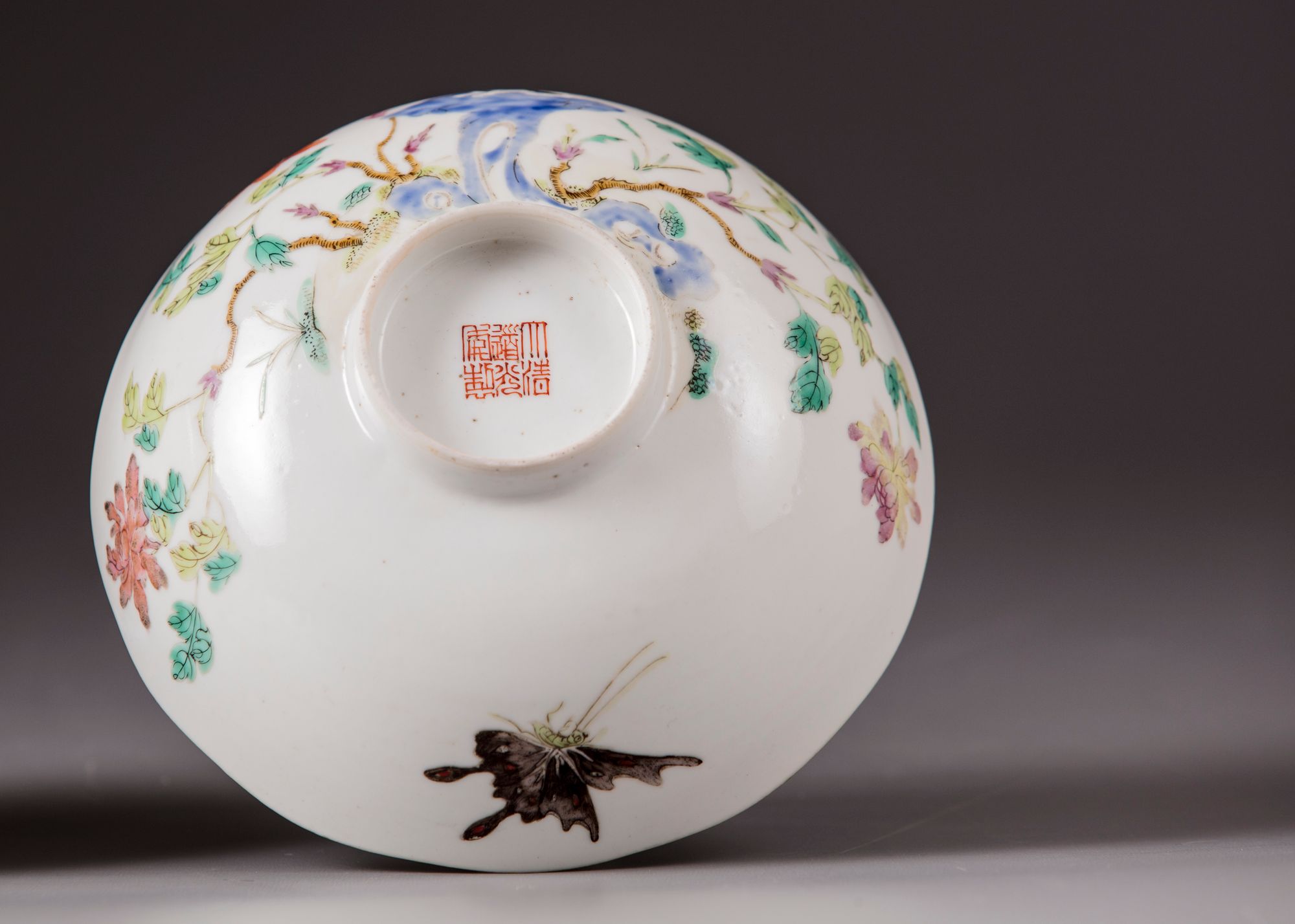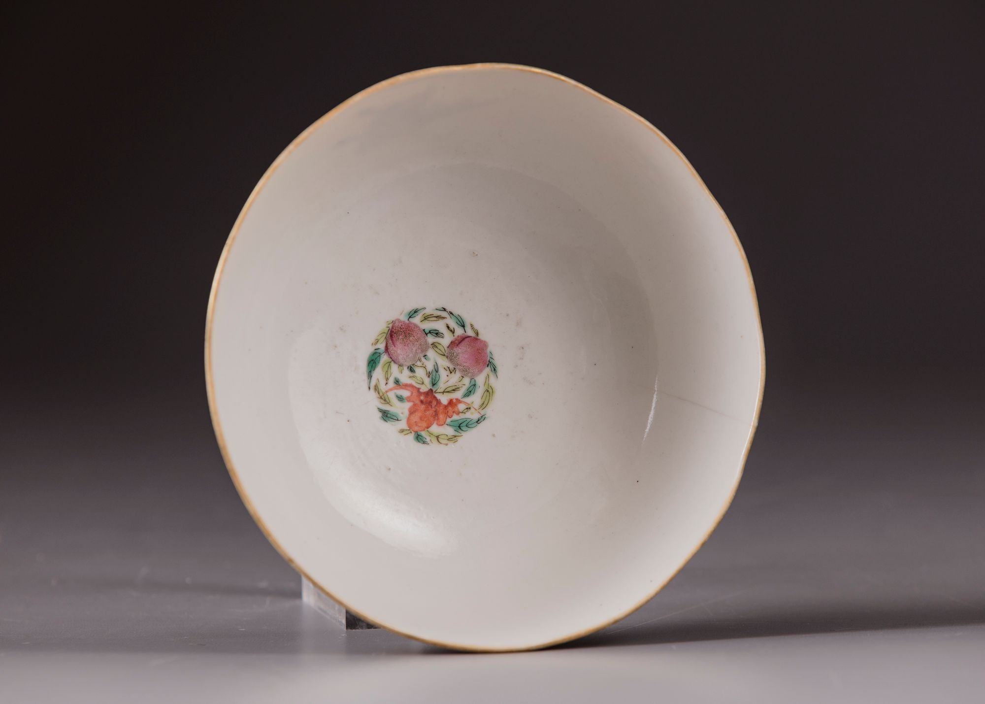 Decorated on the outside with various flowers, a cat and a butterfly in flight. The interior is decorated with peaches and a bat amongst leaves. With a Daoguang seal mark to the base.