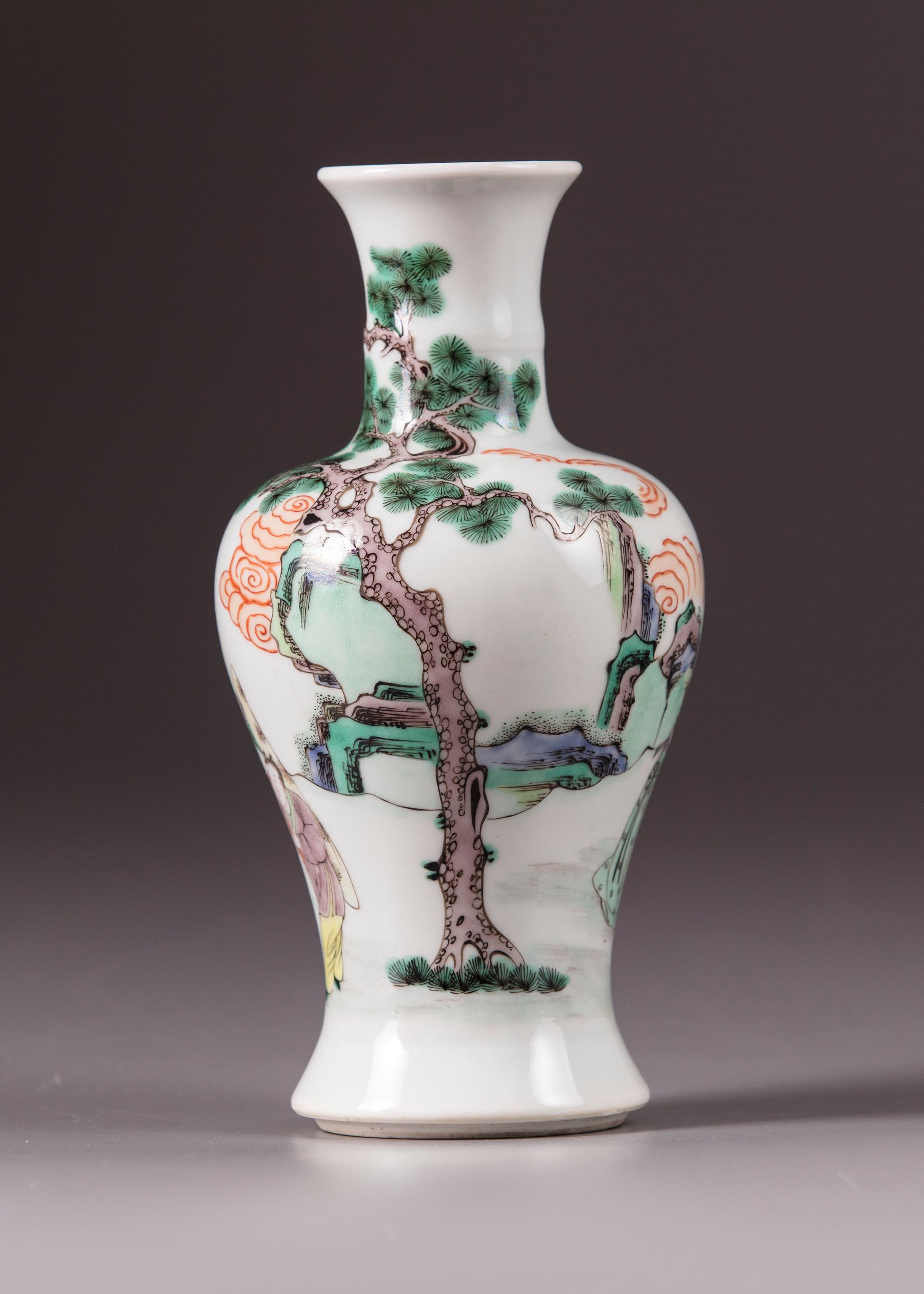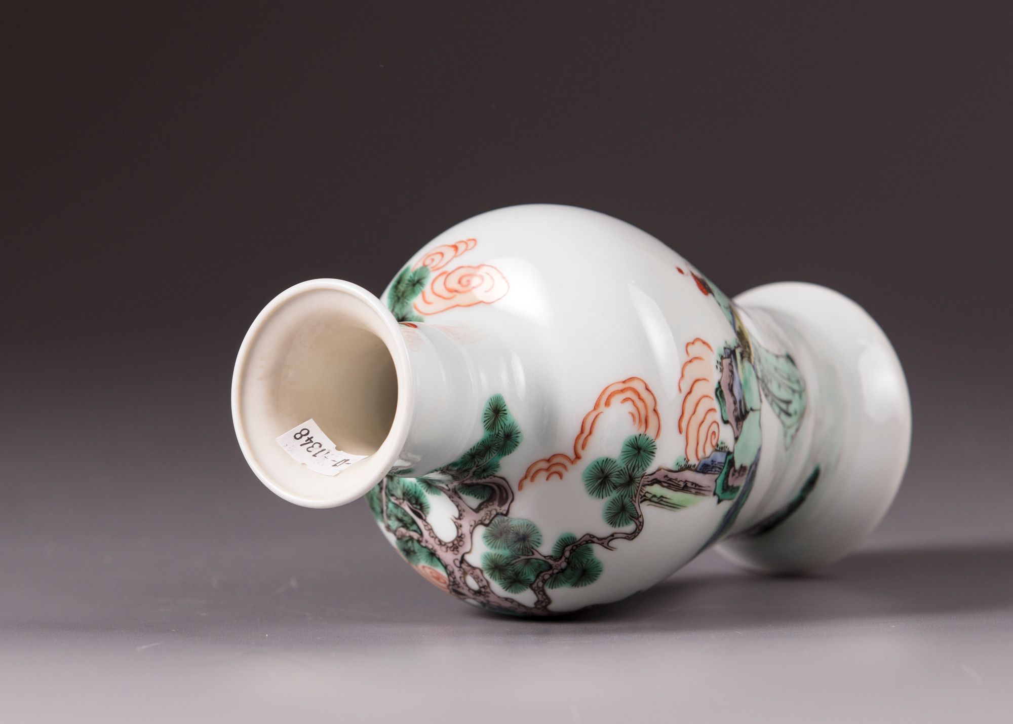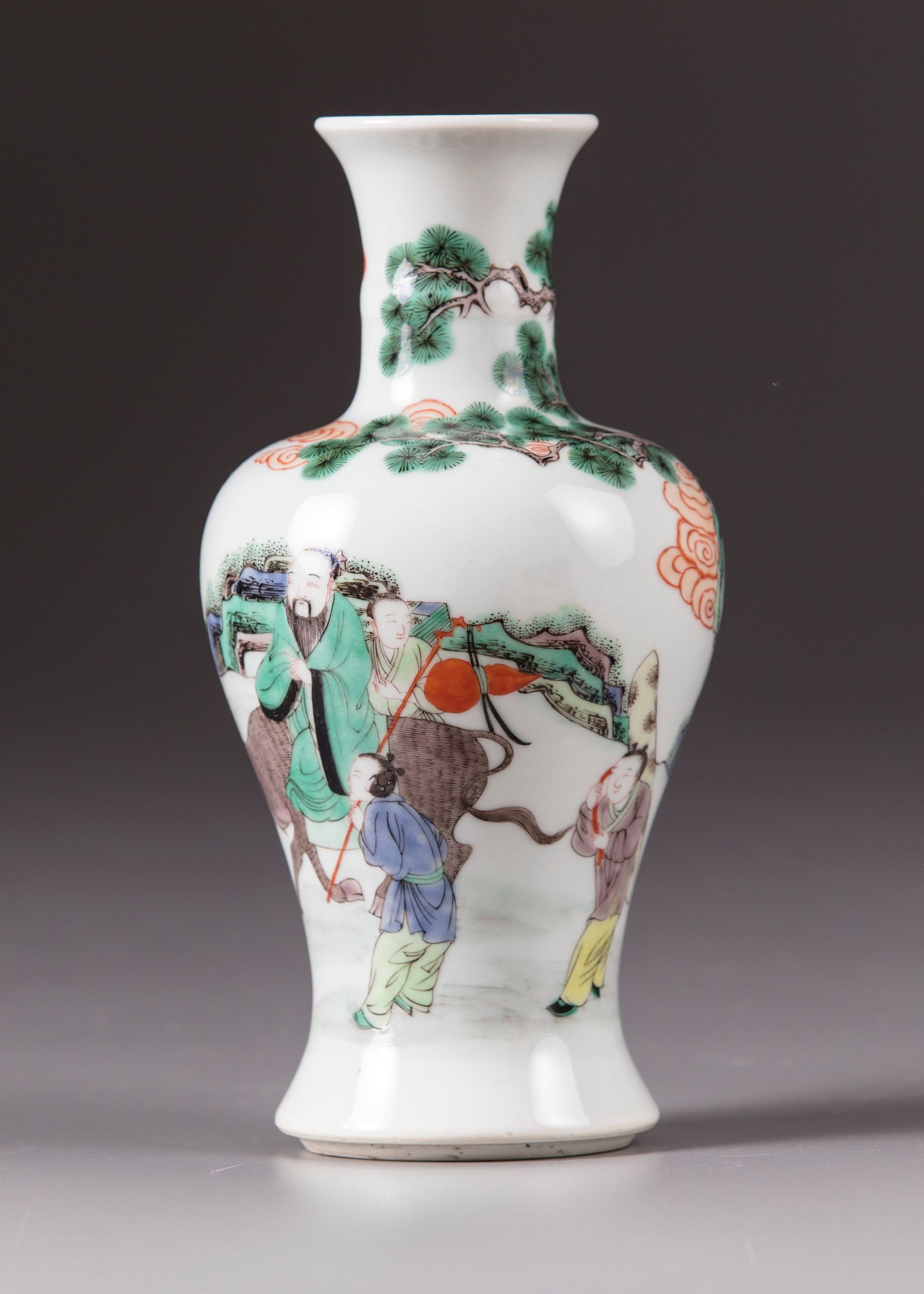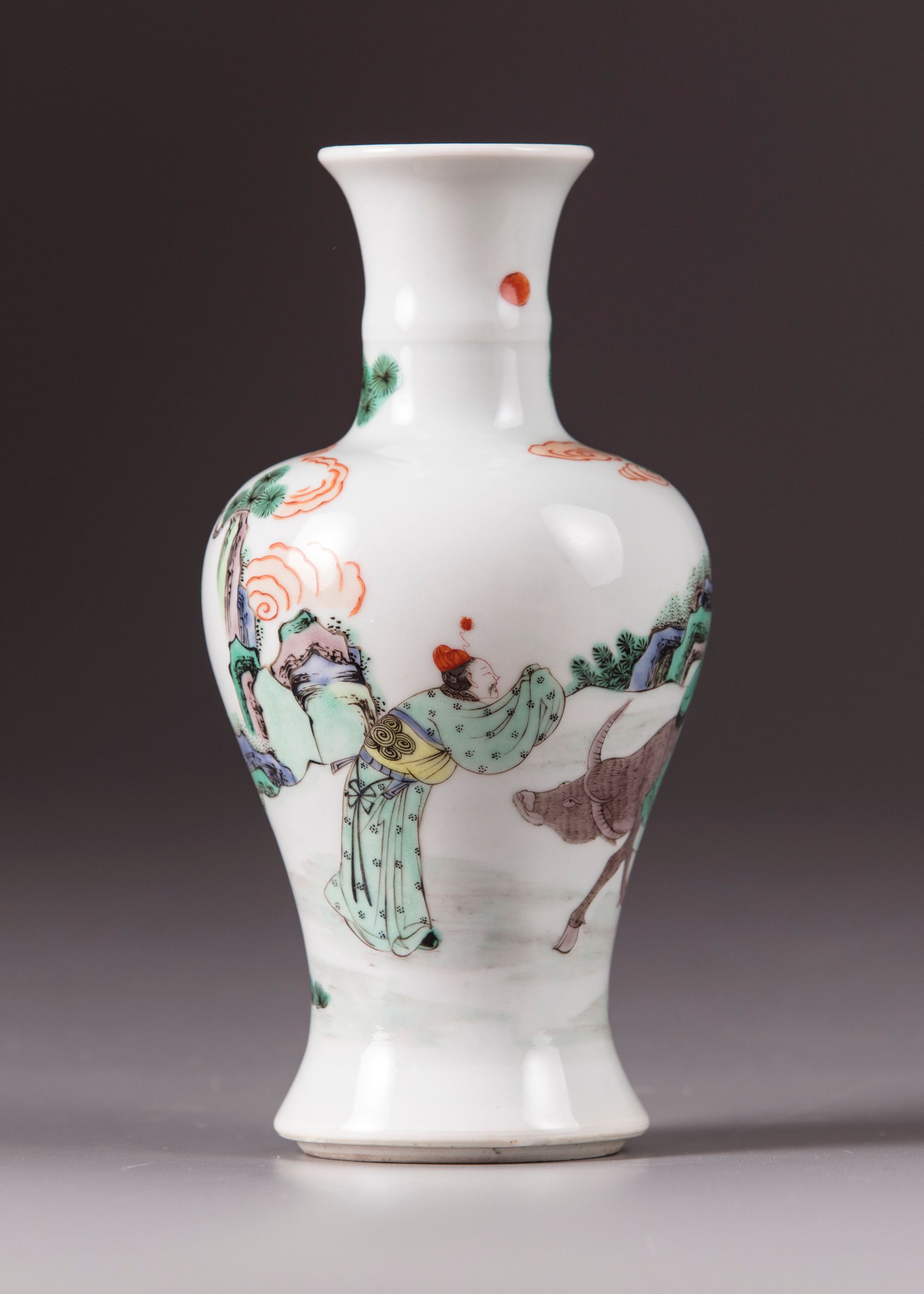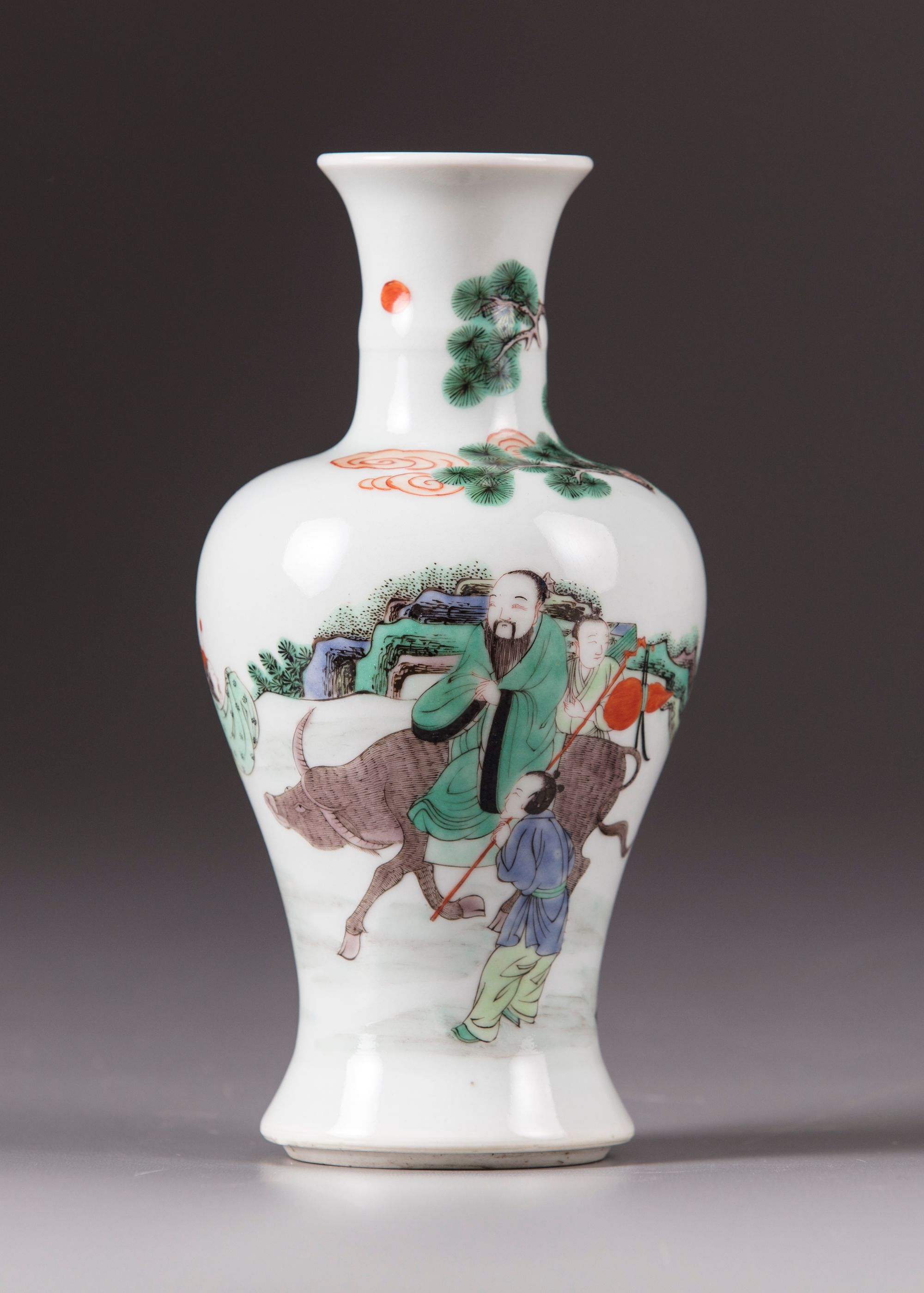 Decorated with a scholar seated on a buffalo, accompanied by his servants and welcomed by another figure beside a tree extending to the neck.