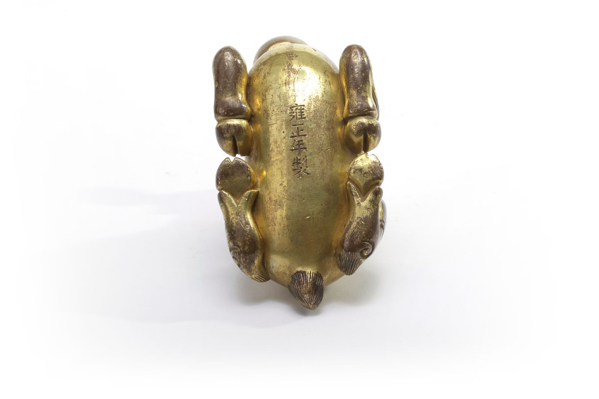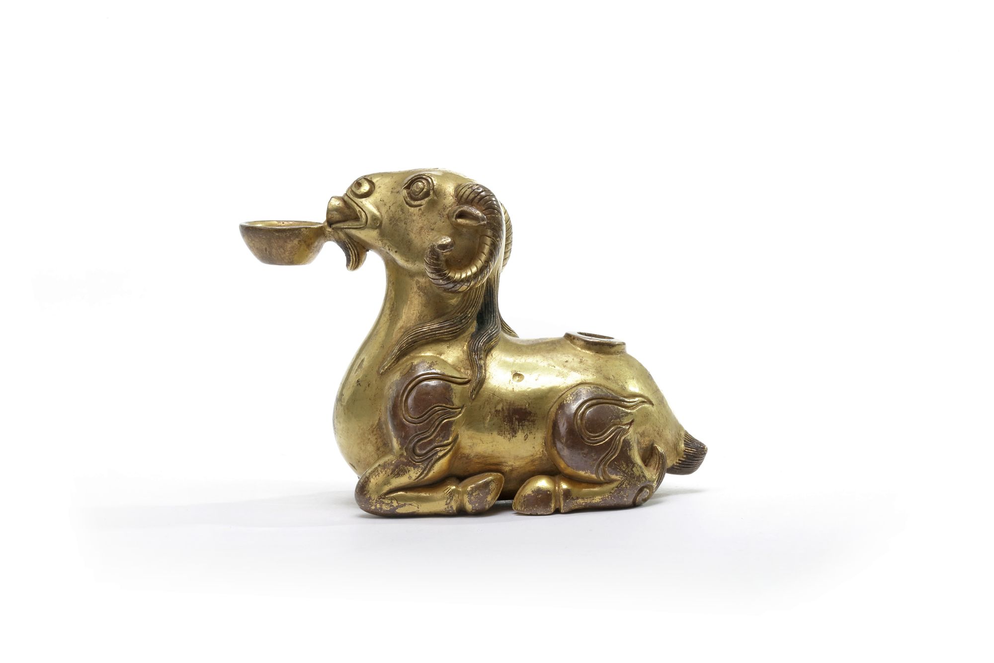 The piece is modelled as a recumbent ram with its legs tucked under. The head is cast with an alert expression, the mouth holds a small bowl. The underside is incised with an apocryphal Yongzheng mark.