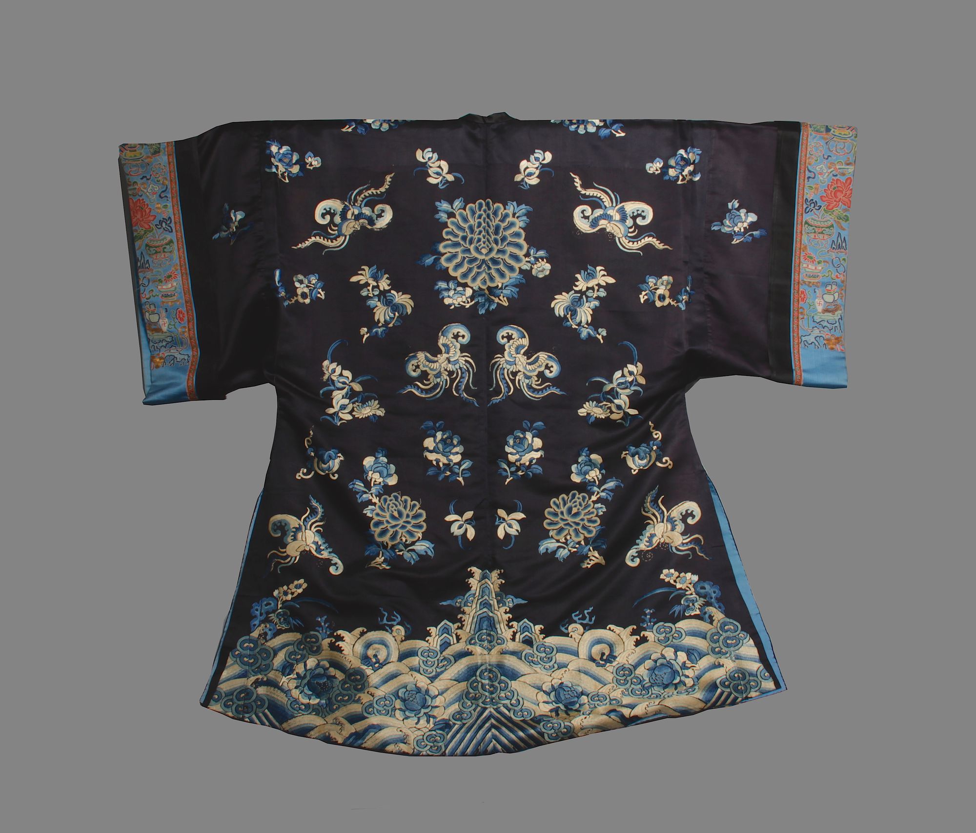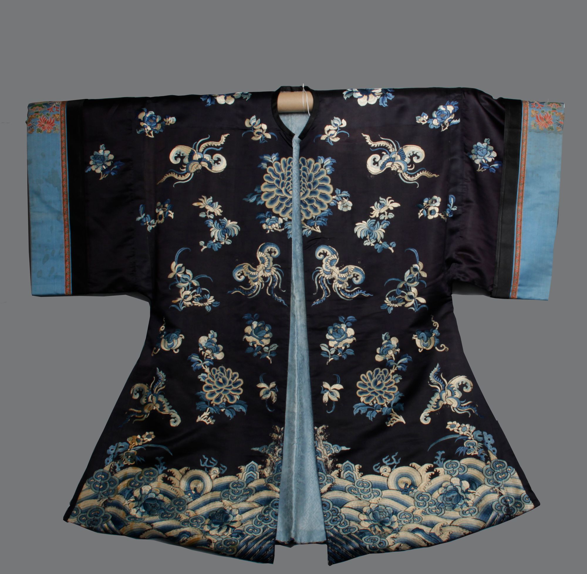 A three-quarter length silk jacket for a Han Chinese lady. The blue-black silk costume, with central front opening, embroidered in satin stitch and Peking knots in shades of blue and white silks. The design of scattered flowers: chrysanthemum, lotus narcissus and prunus, together with large bats in flight. The hem with a wave and water border, filled with flower heads, flaming pearls, coral branches, narcissus, lingzhi fungus and bamboo.