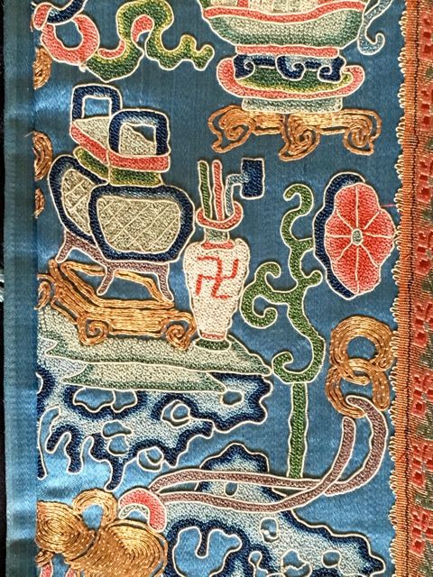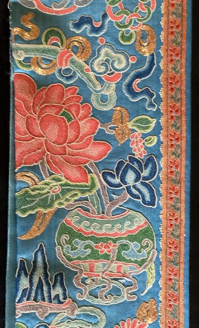 The fine sleeve bands of light blue silk, embroidered in Peking knots, enhanced with couched gold thread. The pattern of scholar's vessels on elaborate stands and with flower sprays, scrolls, painting brushes, ruyi sceptres, coral branches and double gourds.