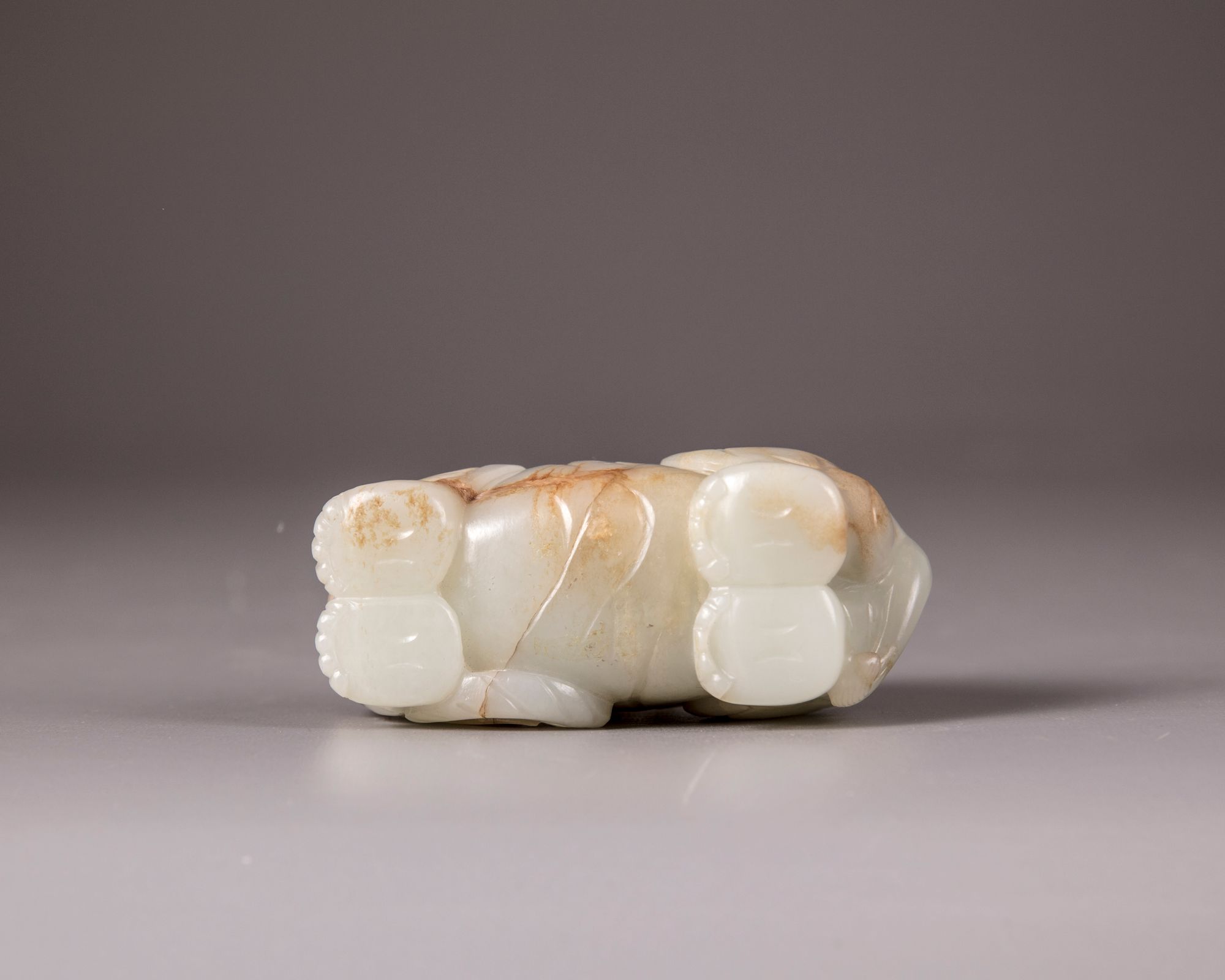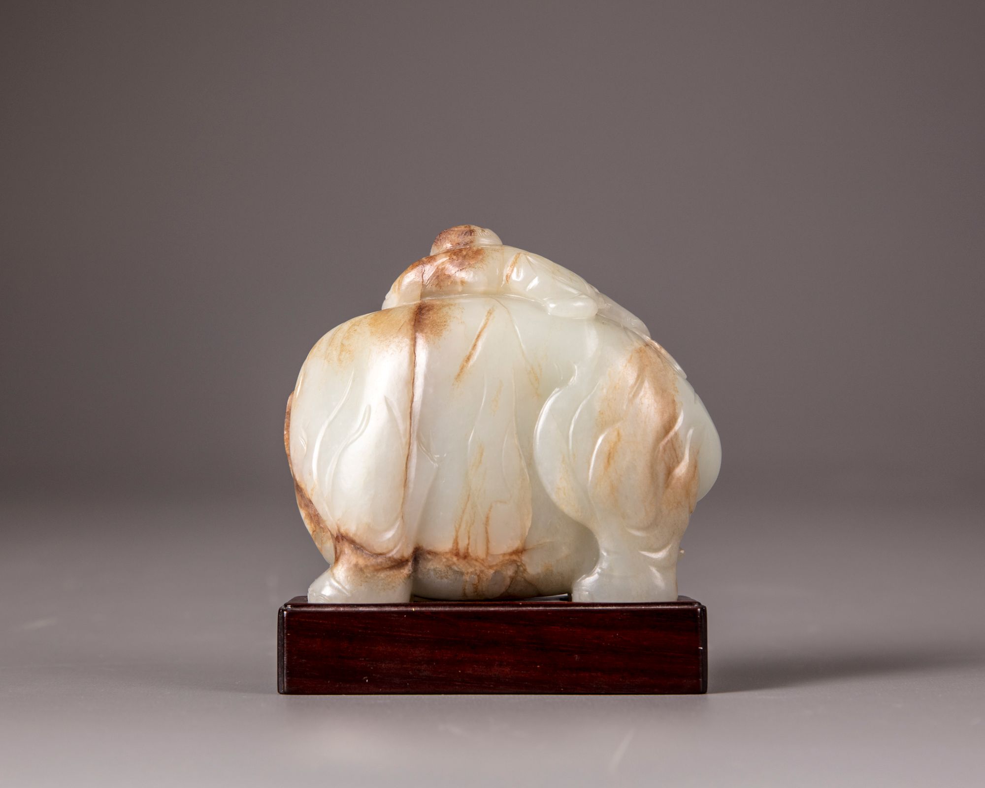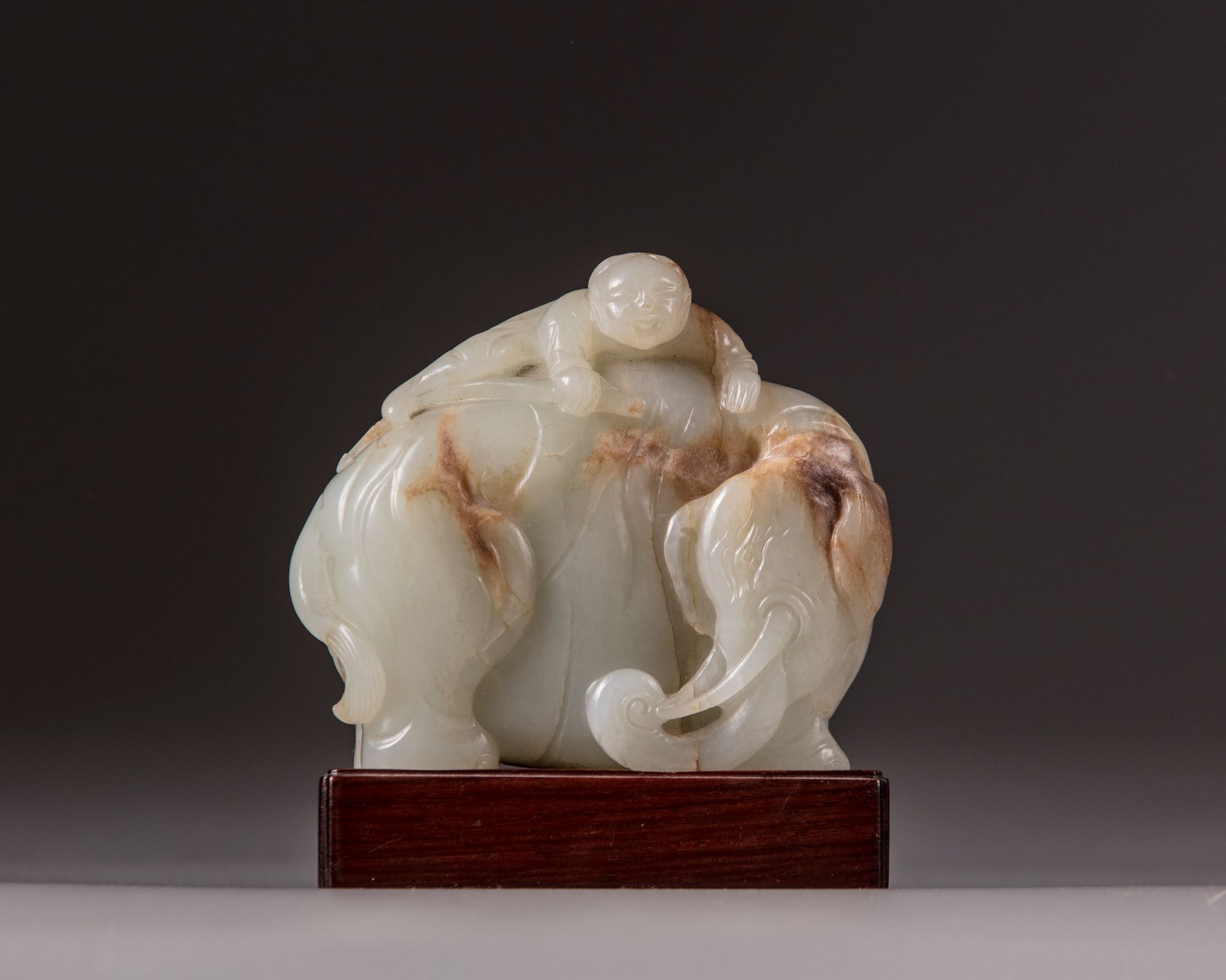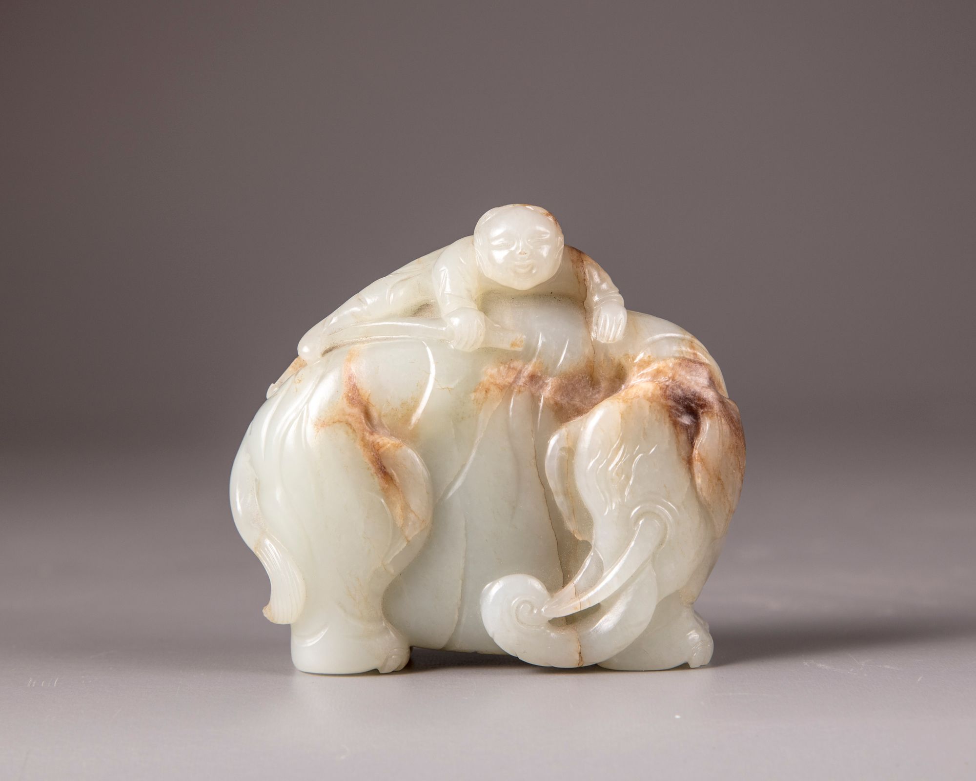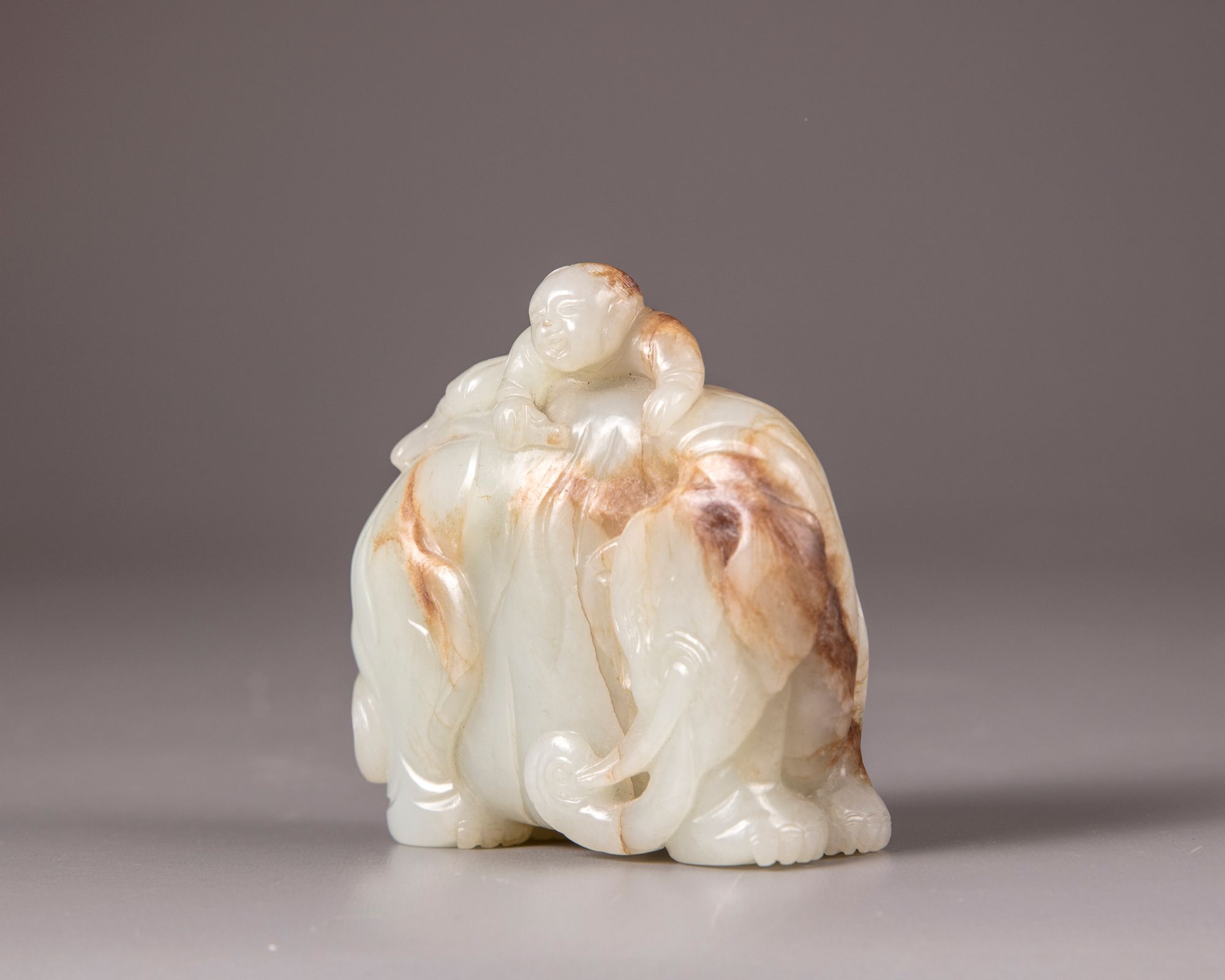 The group is carved in the round with a smiling boy clambering on an elephant, with one hand holding a cane. The wrinkles on the elephant are finely incised. The stone is of a pale tone with russet wrinkles. With a wood stand. Height of the carving without stand: 8.5 cm.