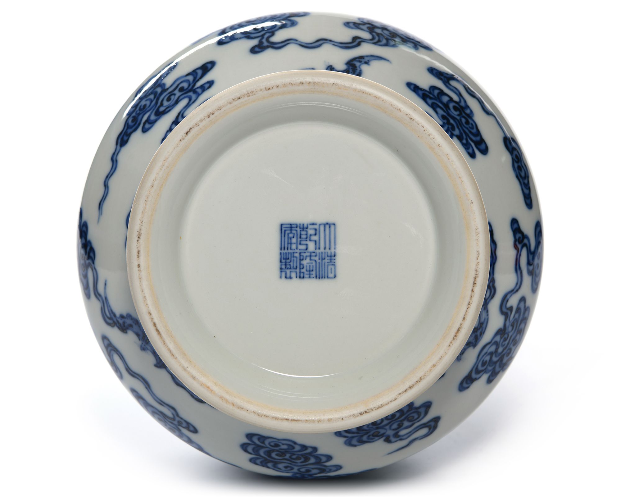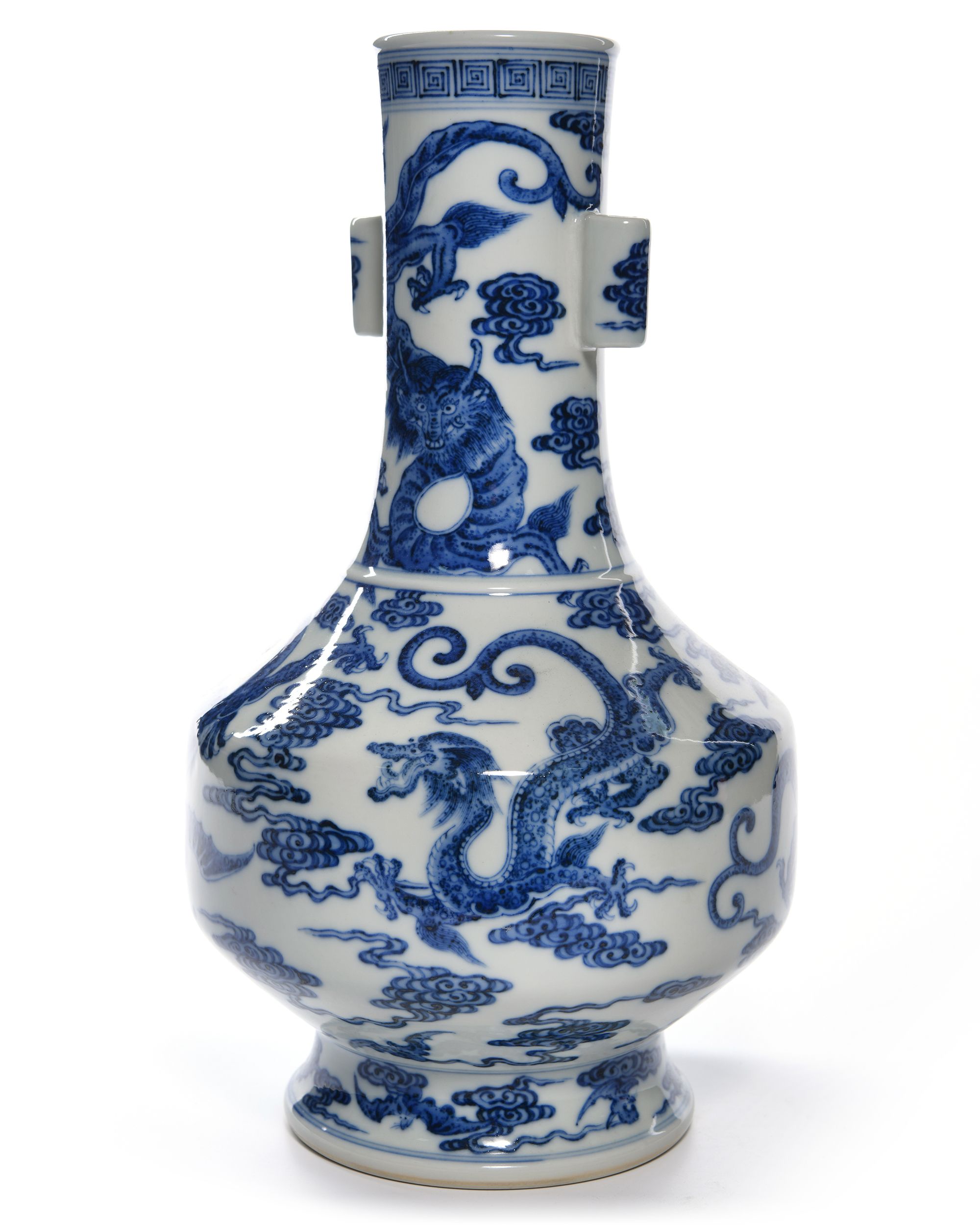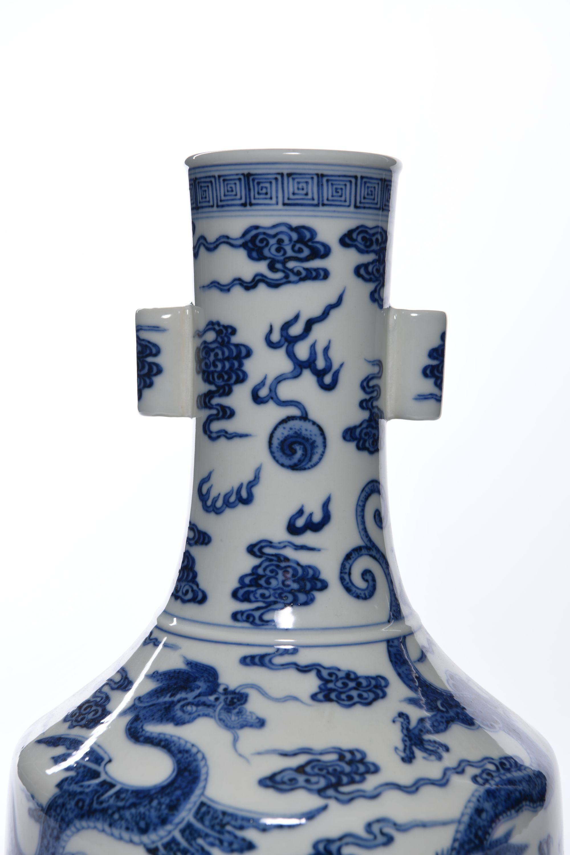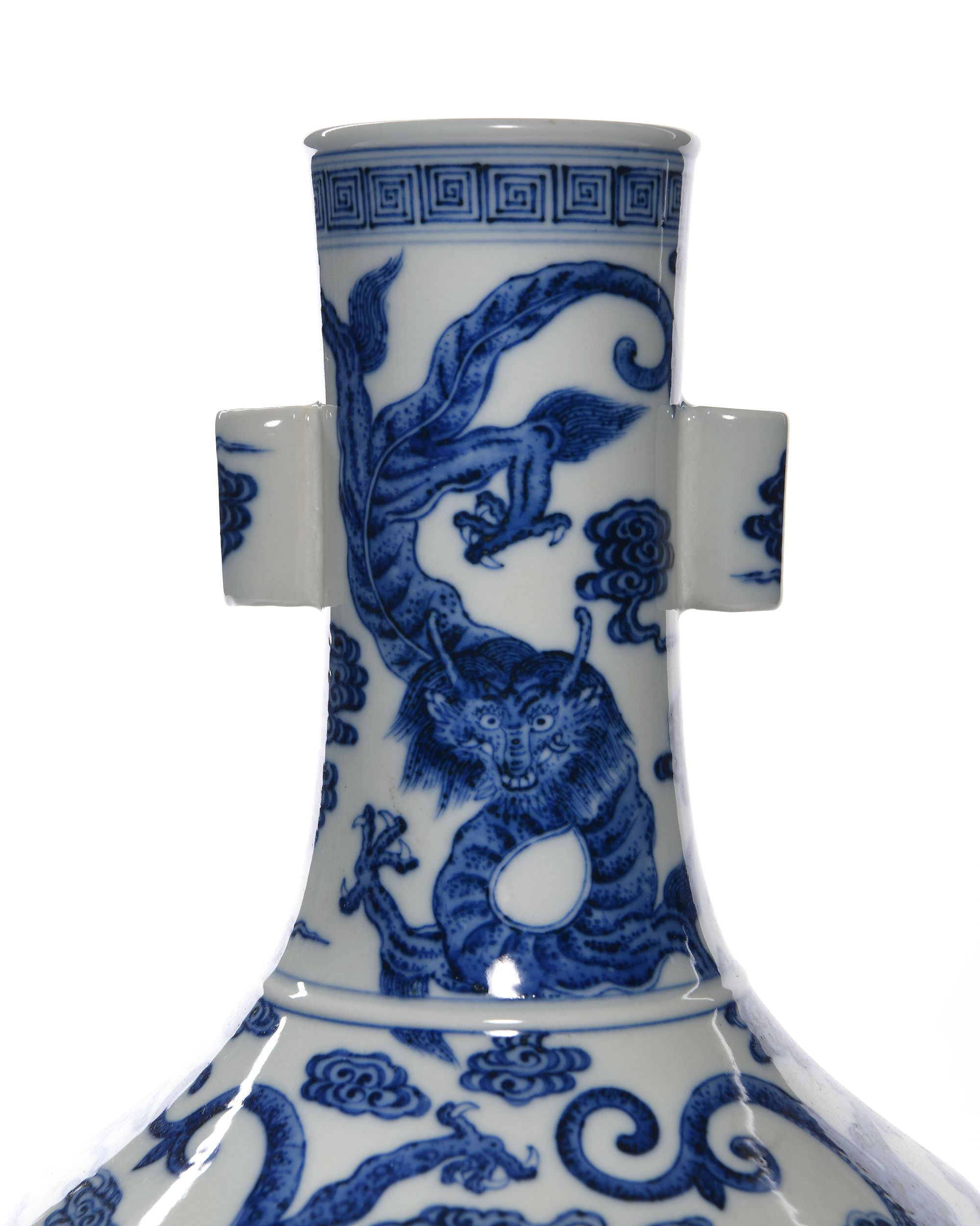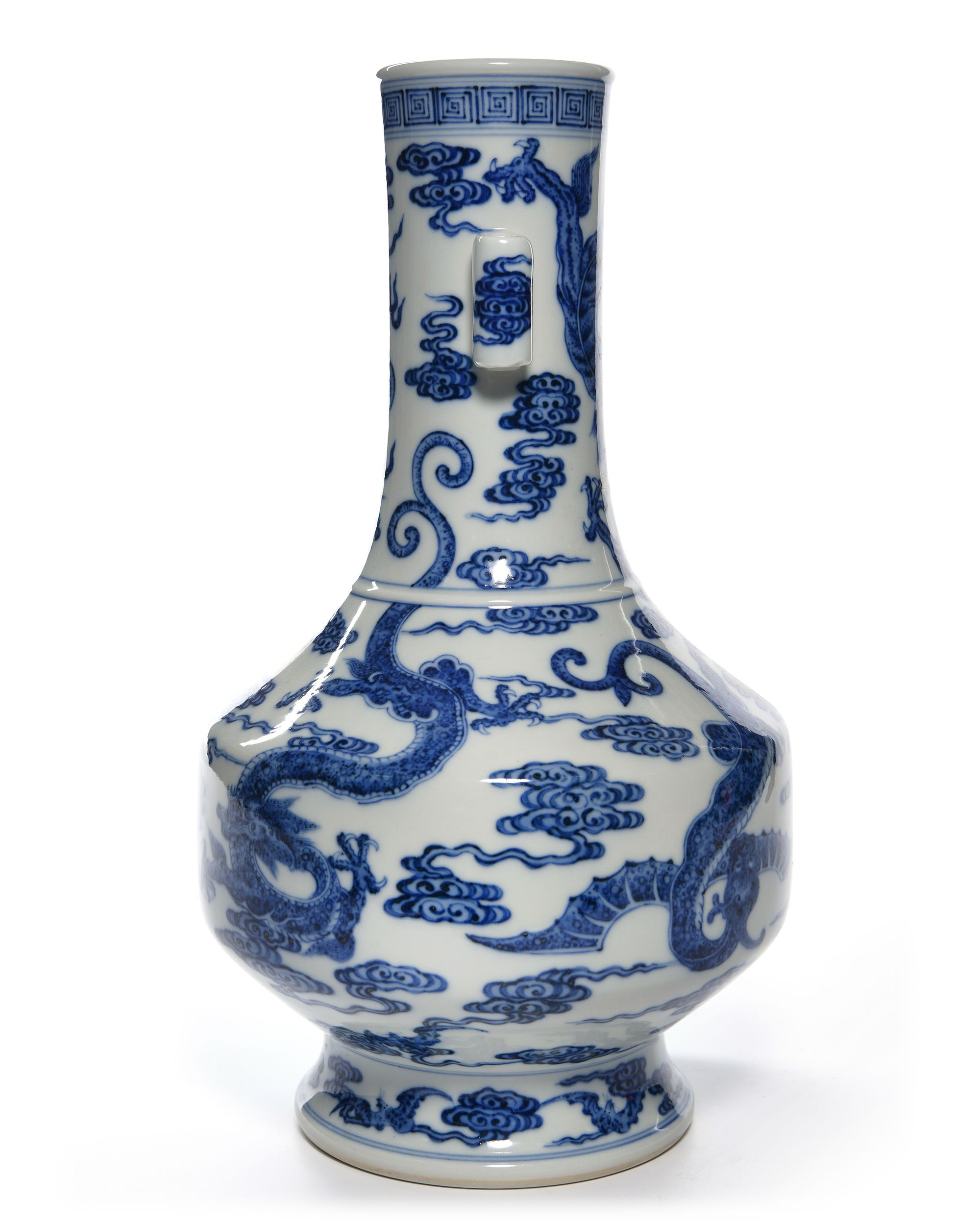 A Chinese porcelain bottle vase with rounded body and twin-handles, decorated with winged dragons amongst clouds below a key fret chain and a band of Fu-bats amongst clouds. The bottom with a Chinese Qianlong seal mark.
