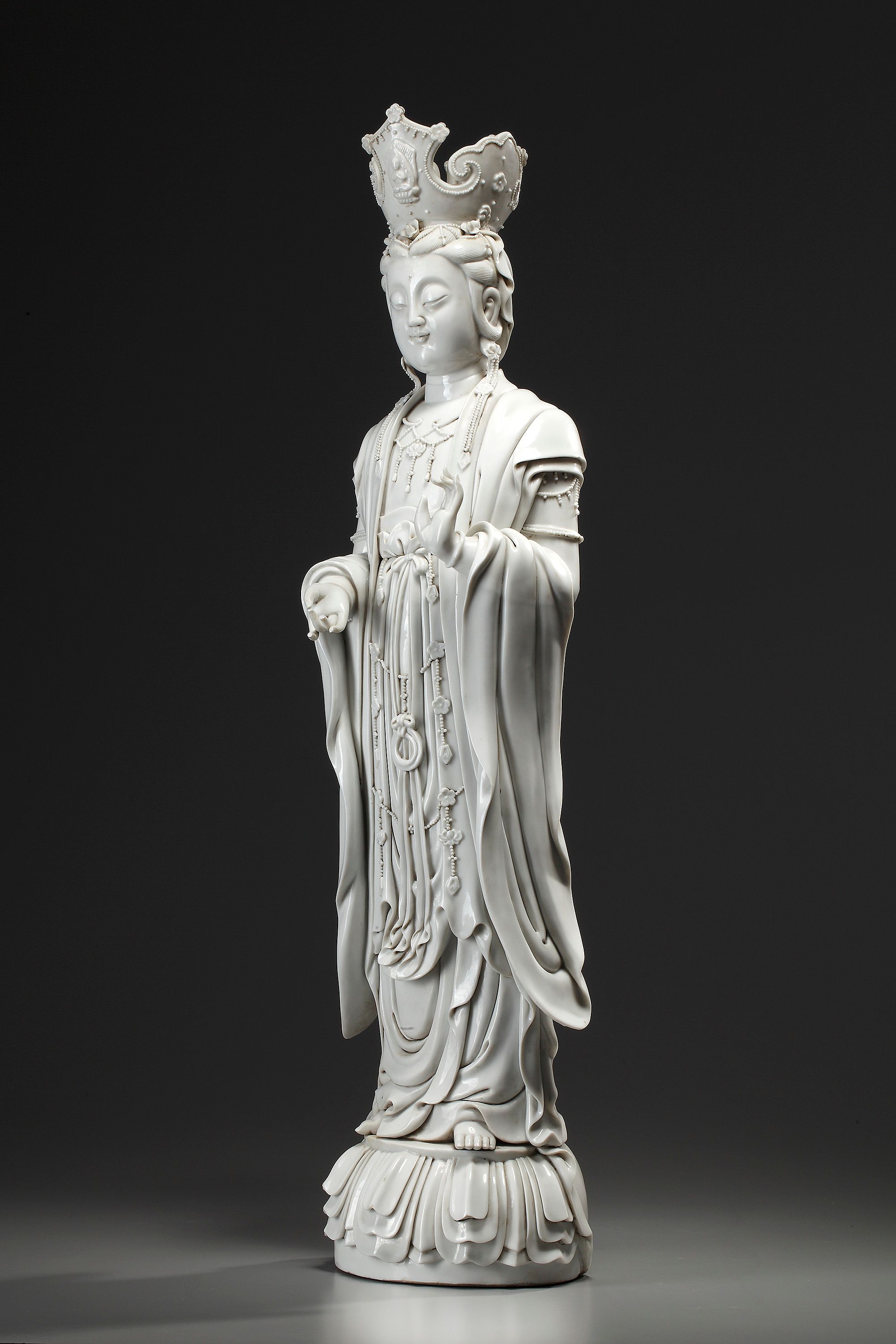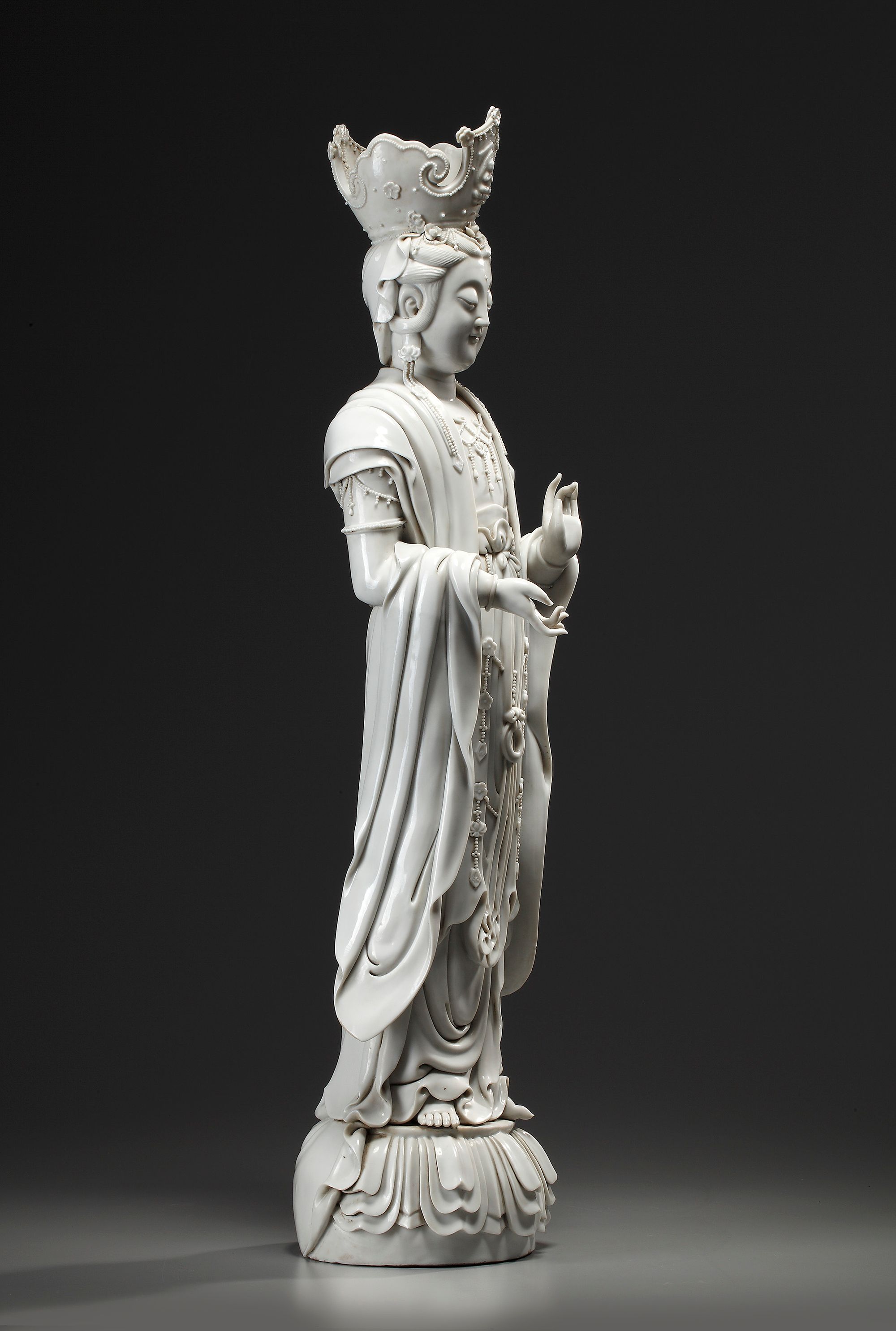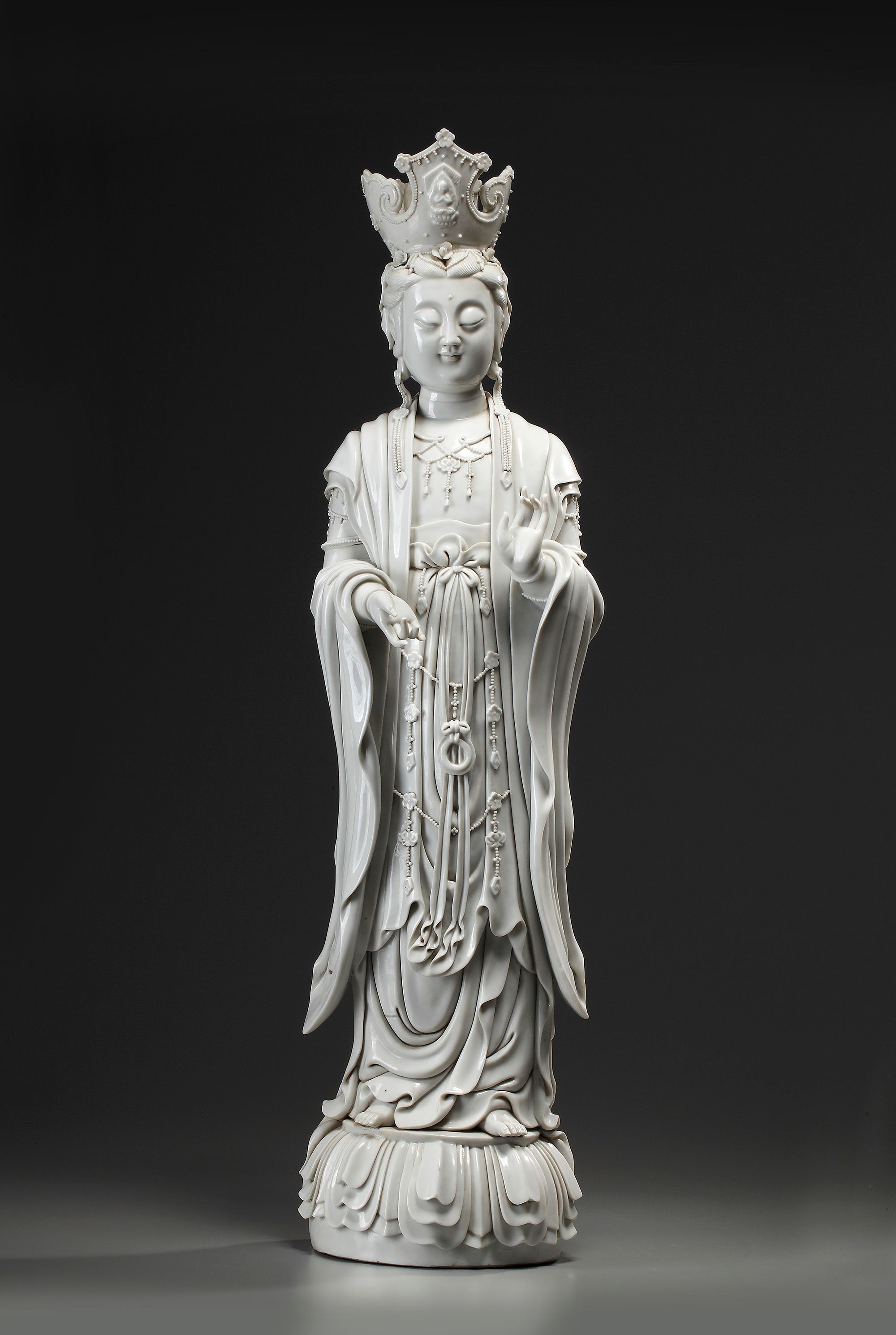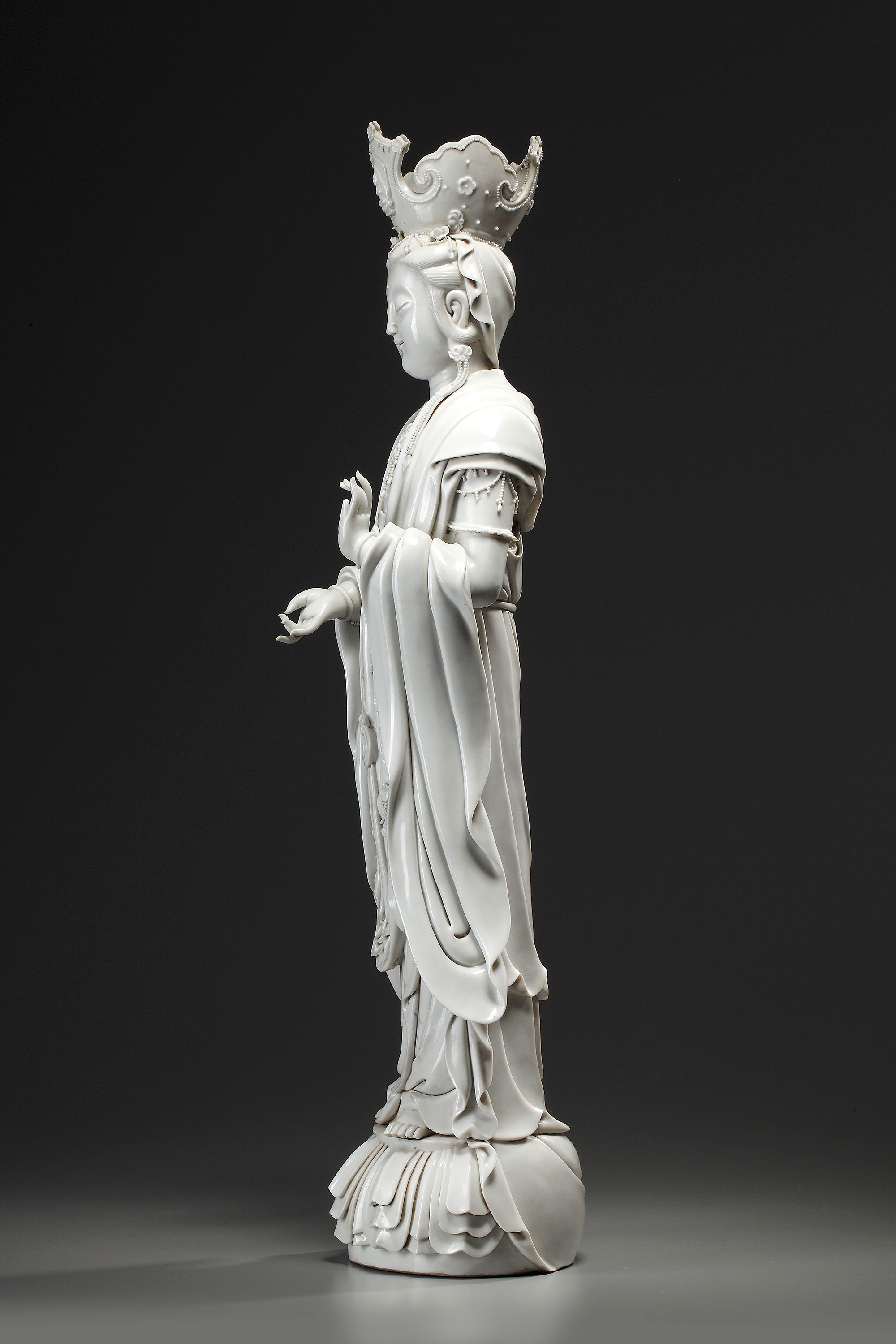 Standing on stylized lotus shaped base made up of multiple petals, dressed in an elaborate long swaying robe and richly decorated at the waist and chest with long strings of Buddhist jewellery with flower ornaments and repeated on the upper arms; her elaborate coiffure surmounted by a crown enclosing a seated figure of Buddha. 80 cm.