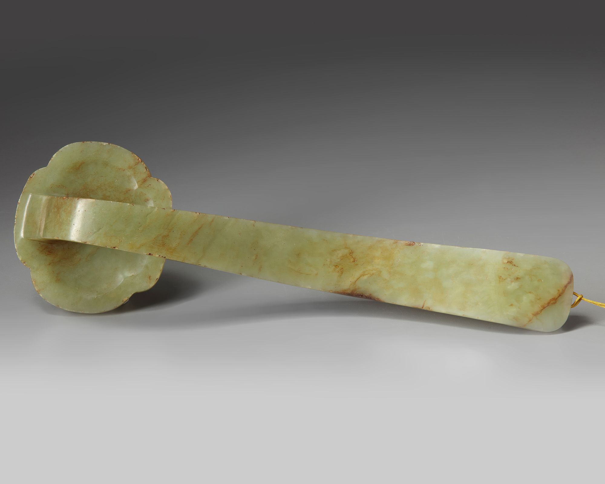 The head of the ruyi-sceptre is carved in relief with a bat with outstretched wings above a pair of coins tied by a ribbon. The shaft is left undecorated and the end is carved with a further bat. The jade is of an olive-green tone.