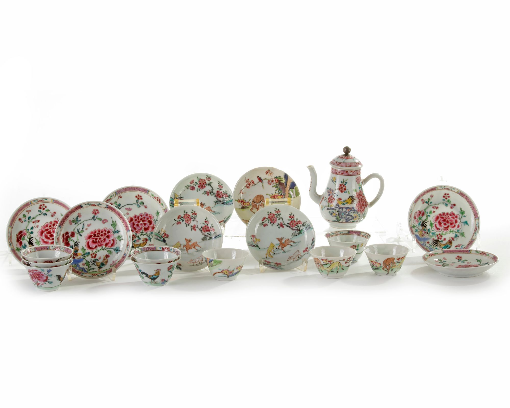 The group comprises: six 'double cockerel' cups, five 'double cockerel' saucers, and a 'double cockerel' teapot and cover; and four 'twin deer' saucers and three 'twin deer' cups.