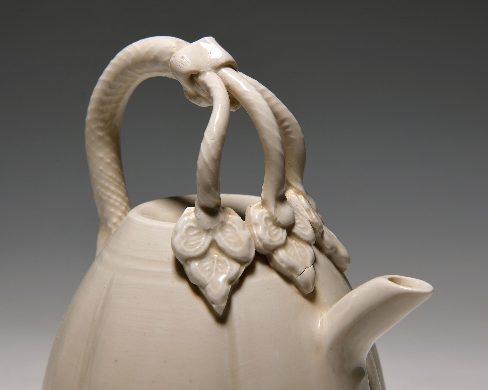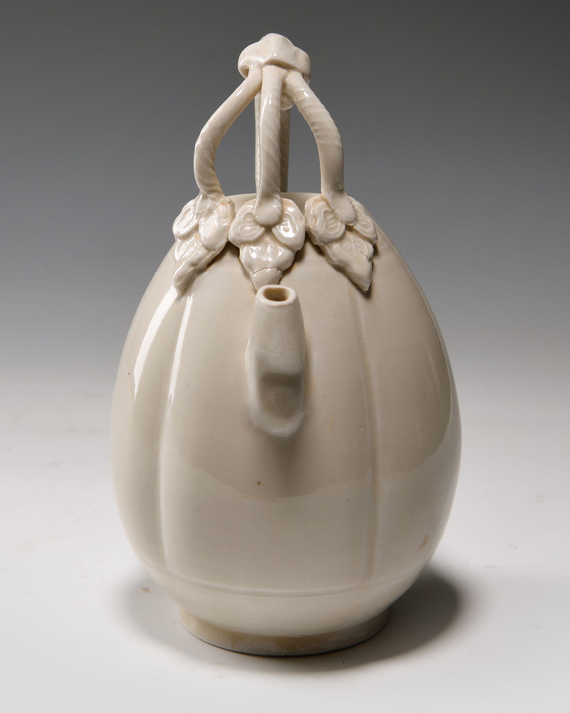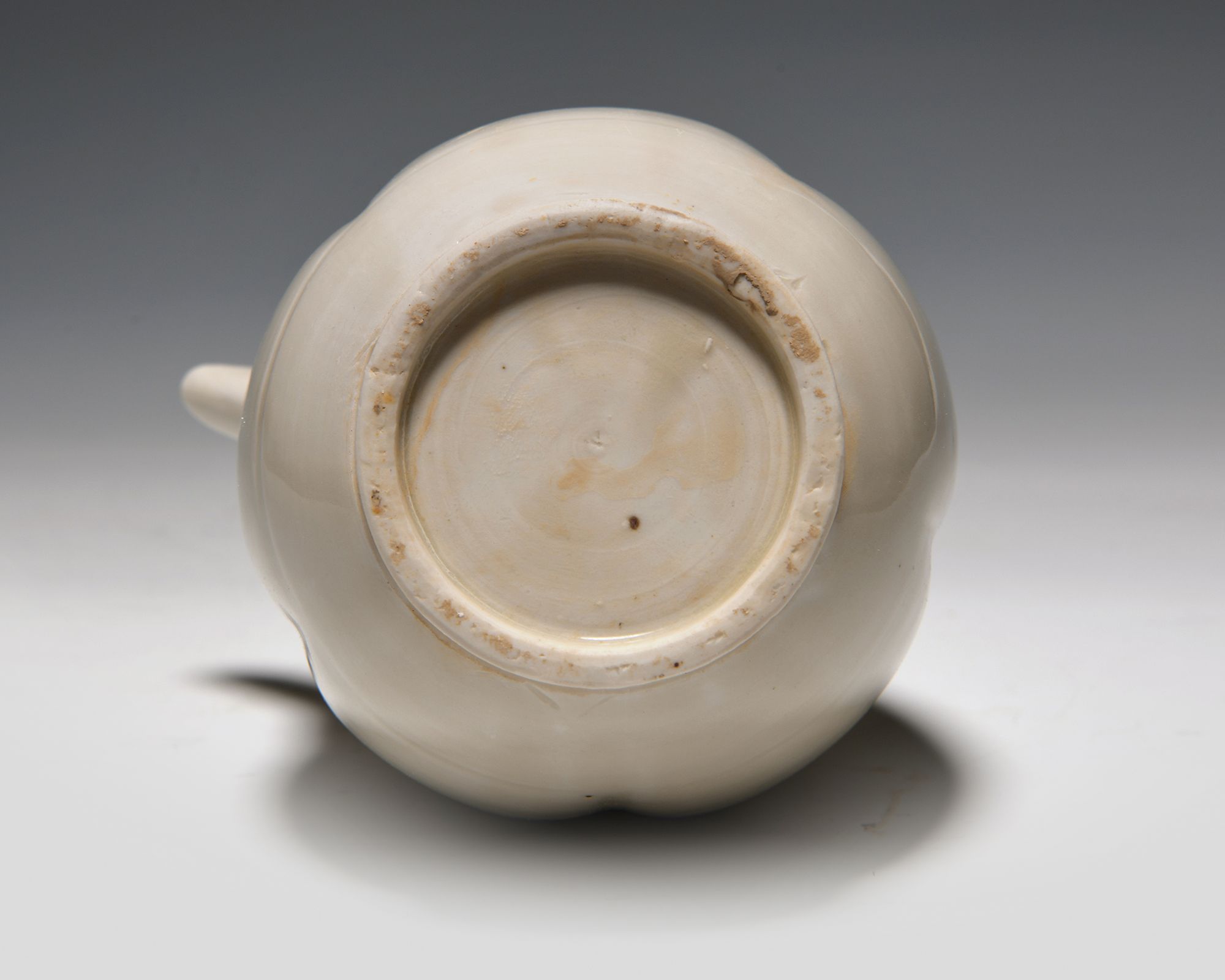 A Chinese porcelain lobed wine jug with a small spout and flower sprays shaped handle, covered overall with a white glaze. Height 14.5 cm.