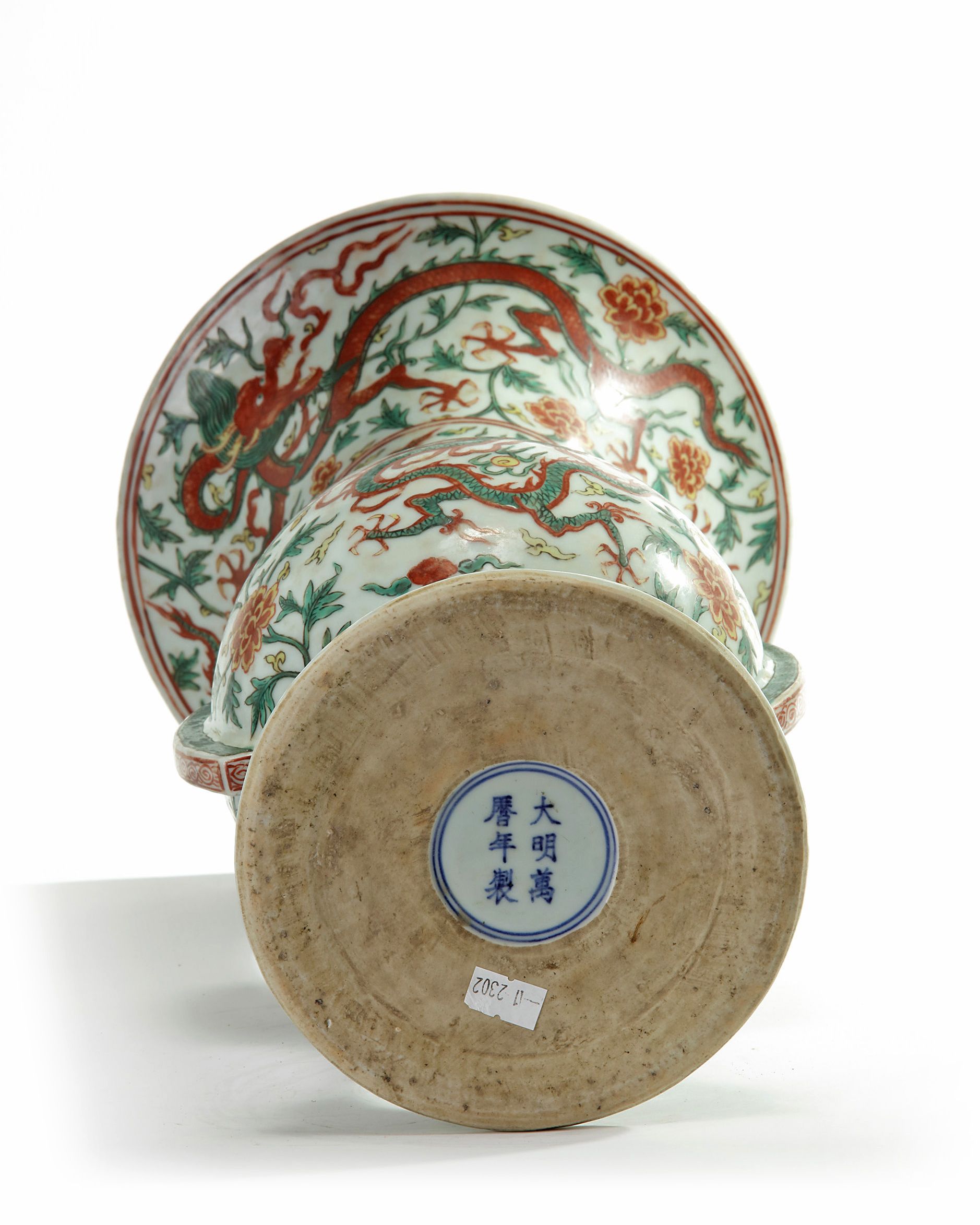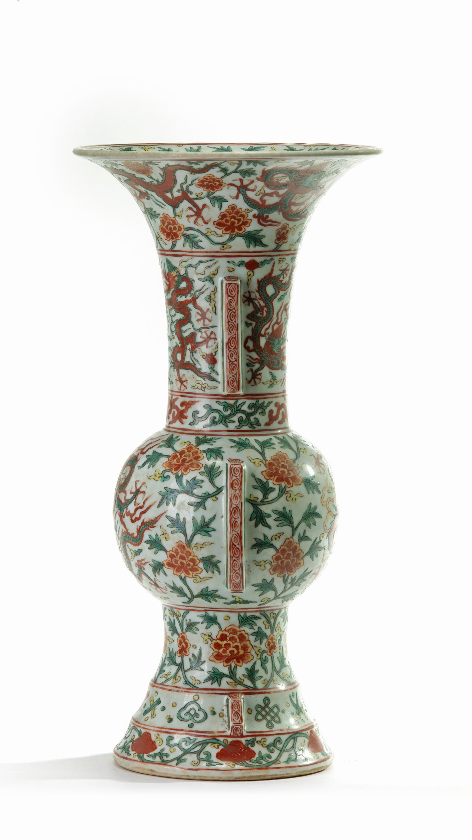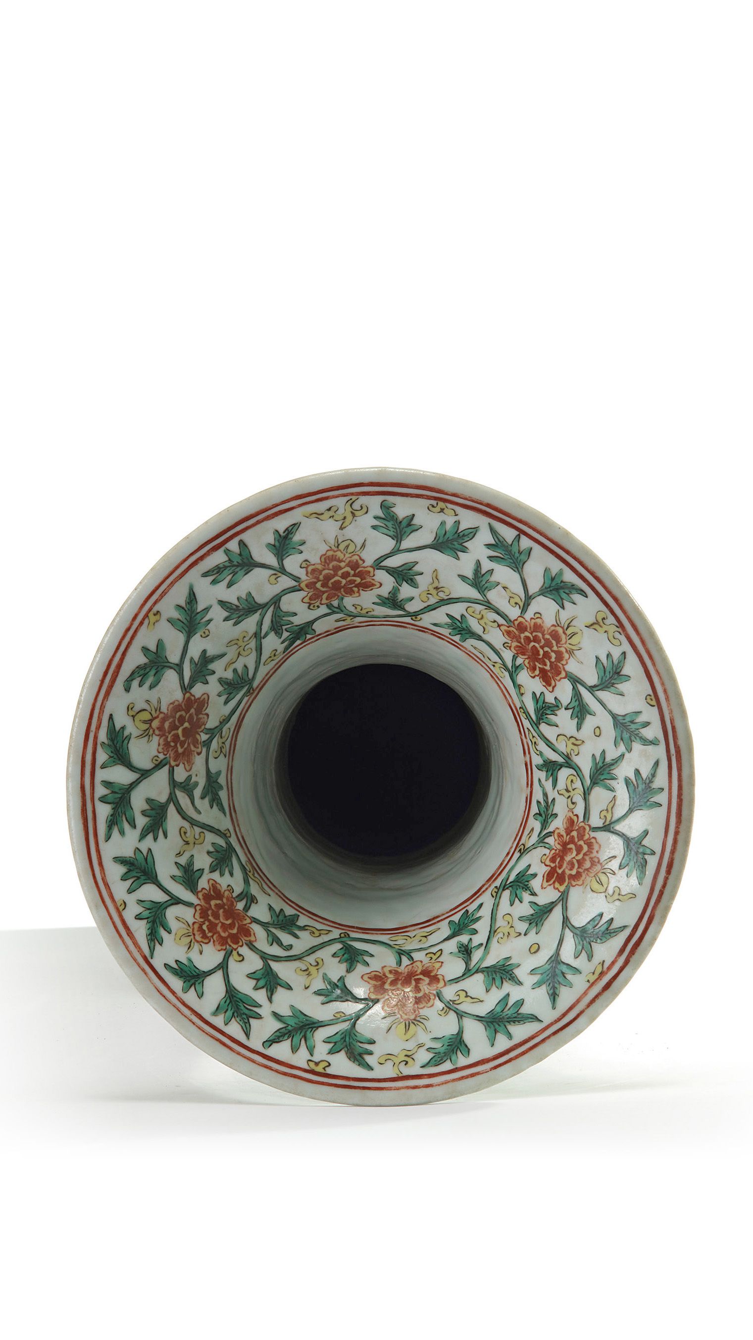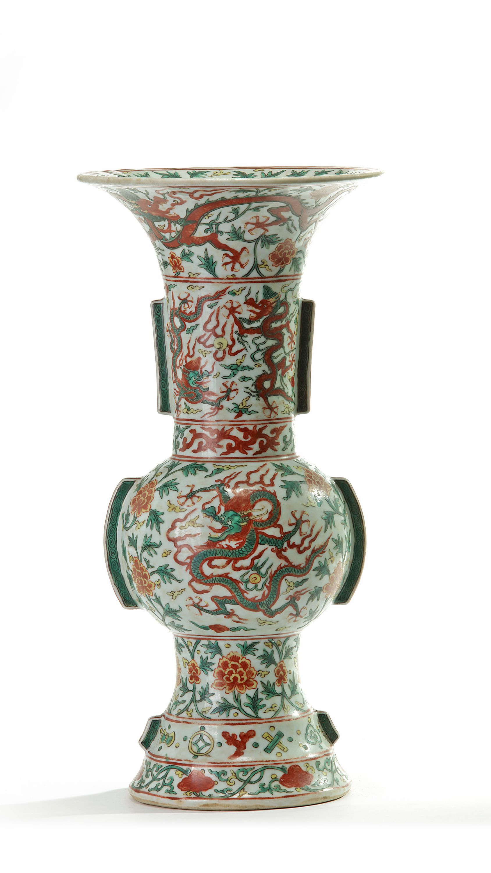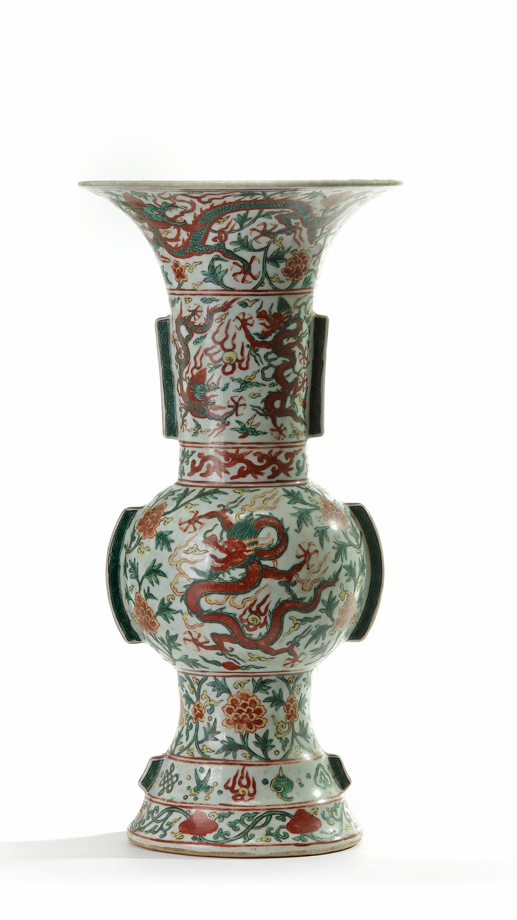 The vase is decorated with iron-red, green and yellow enamels to depict dragons chasing a flaming pearl amongst clouds, all amidst floral sprays. The neck is similarly decorated. The base with an apocryphal Wanli six character mark.