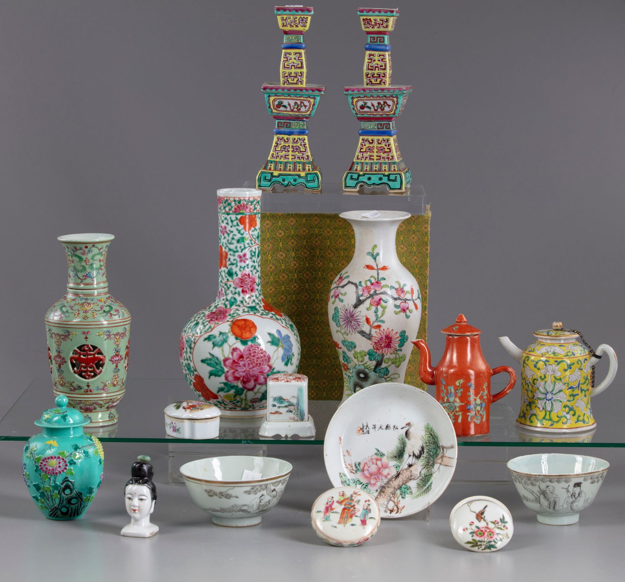 Comprising: a pair of candle holders decorated with archaic kui dragons and auspicious objects in cartouches, second half of 20th century.The green glazed pot is decorated in low relief with peonies growing from rocks, 13 cm. The ironred ground teapot decorated in green with flowers and folaige. 12.5cm. The yellow ground teapot is dcorated with lotus scrolls and fu bats. 12 cm.