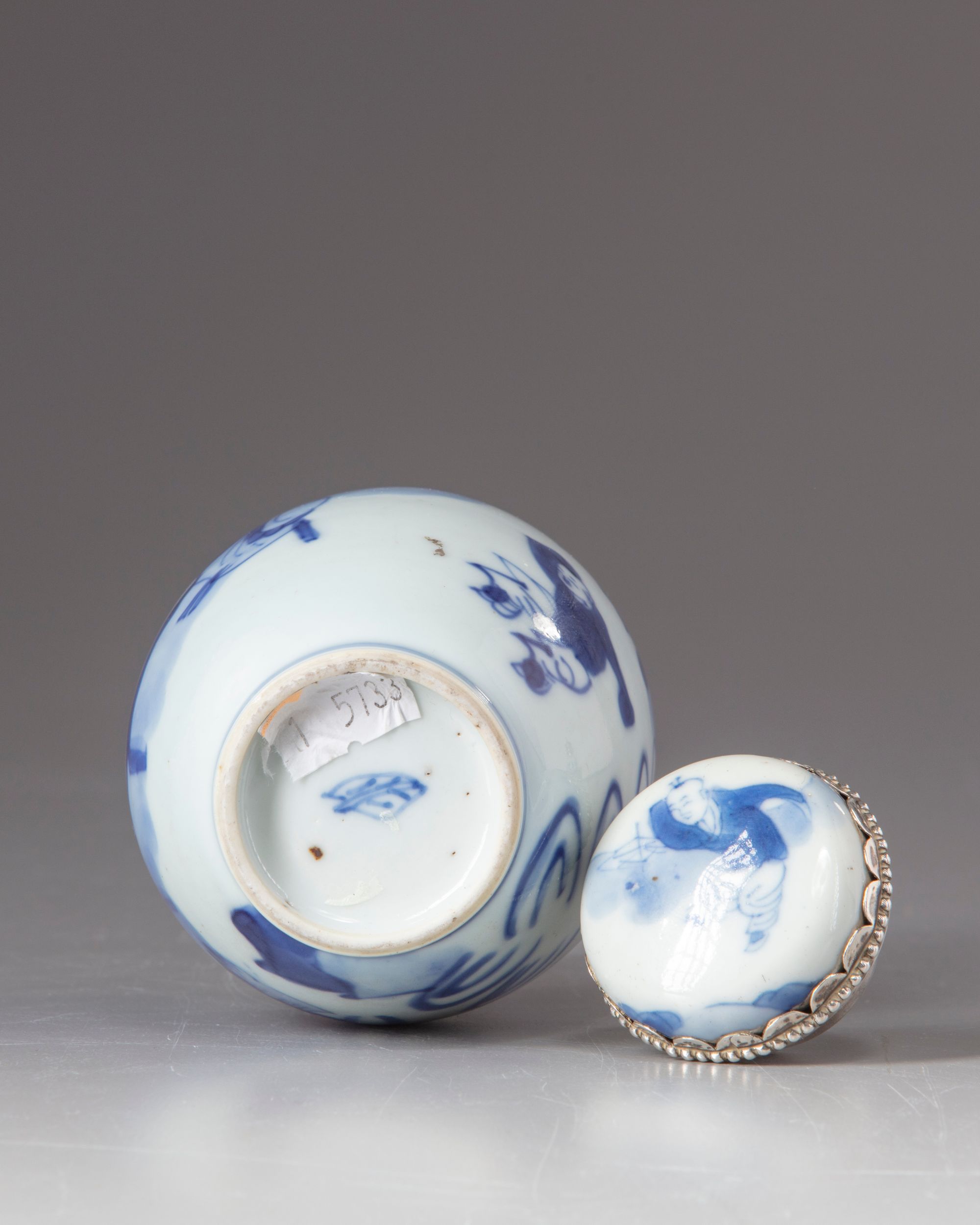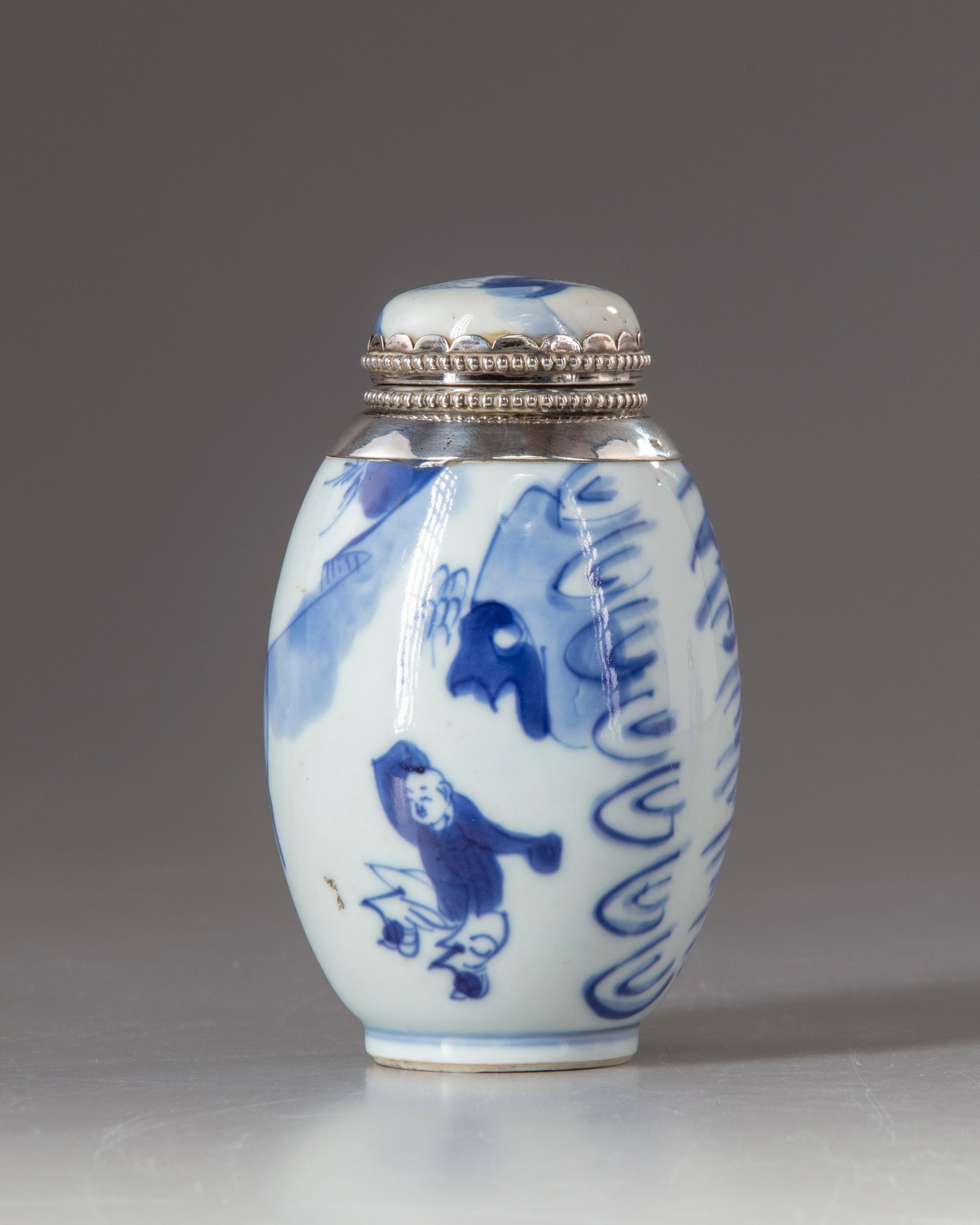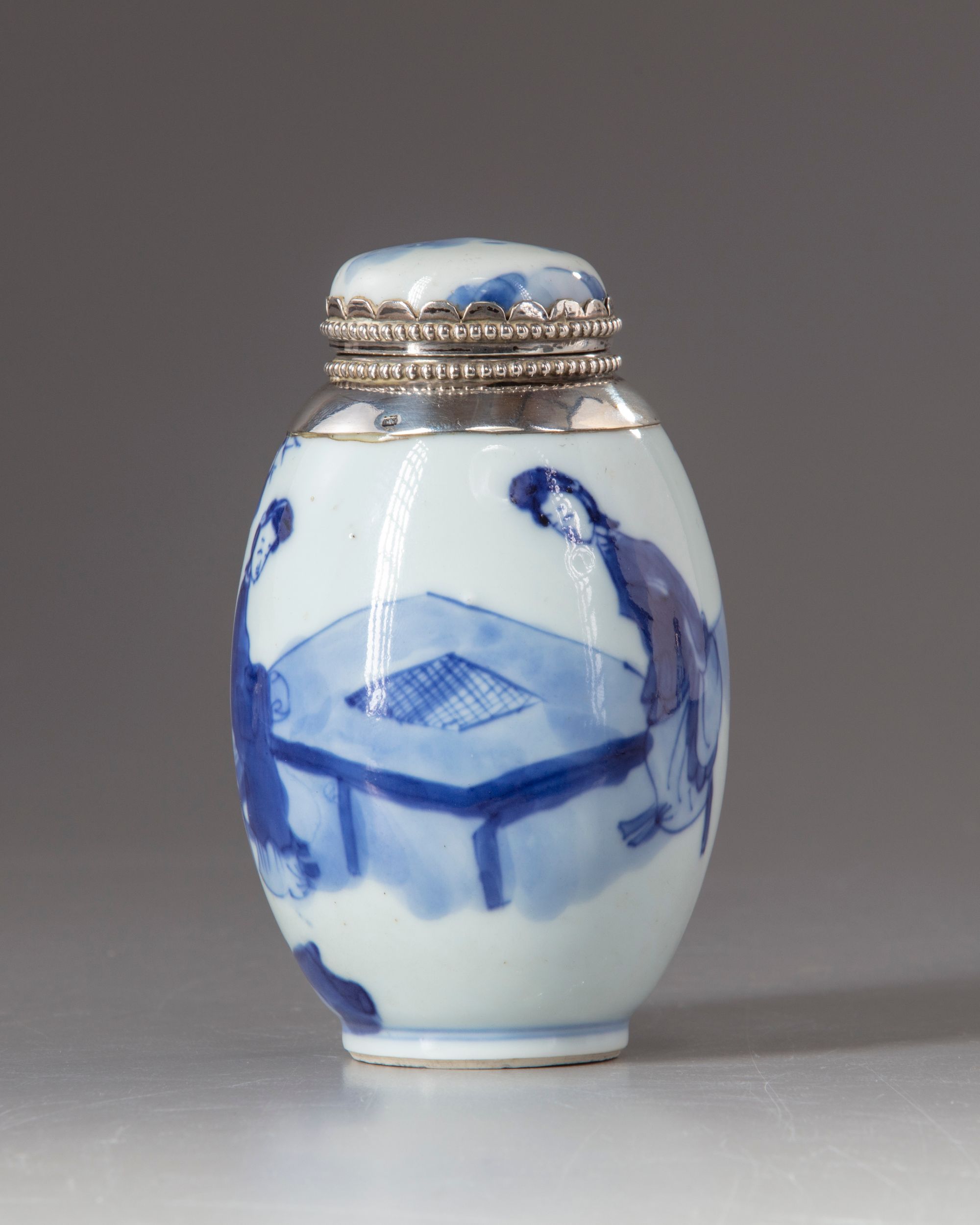 A Chinese blue and white jar, decorated with seated ladies beanie a table and a boy at play " Lange lijs en zotje".The bottom with an artemisia leaf mark.