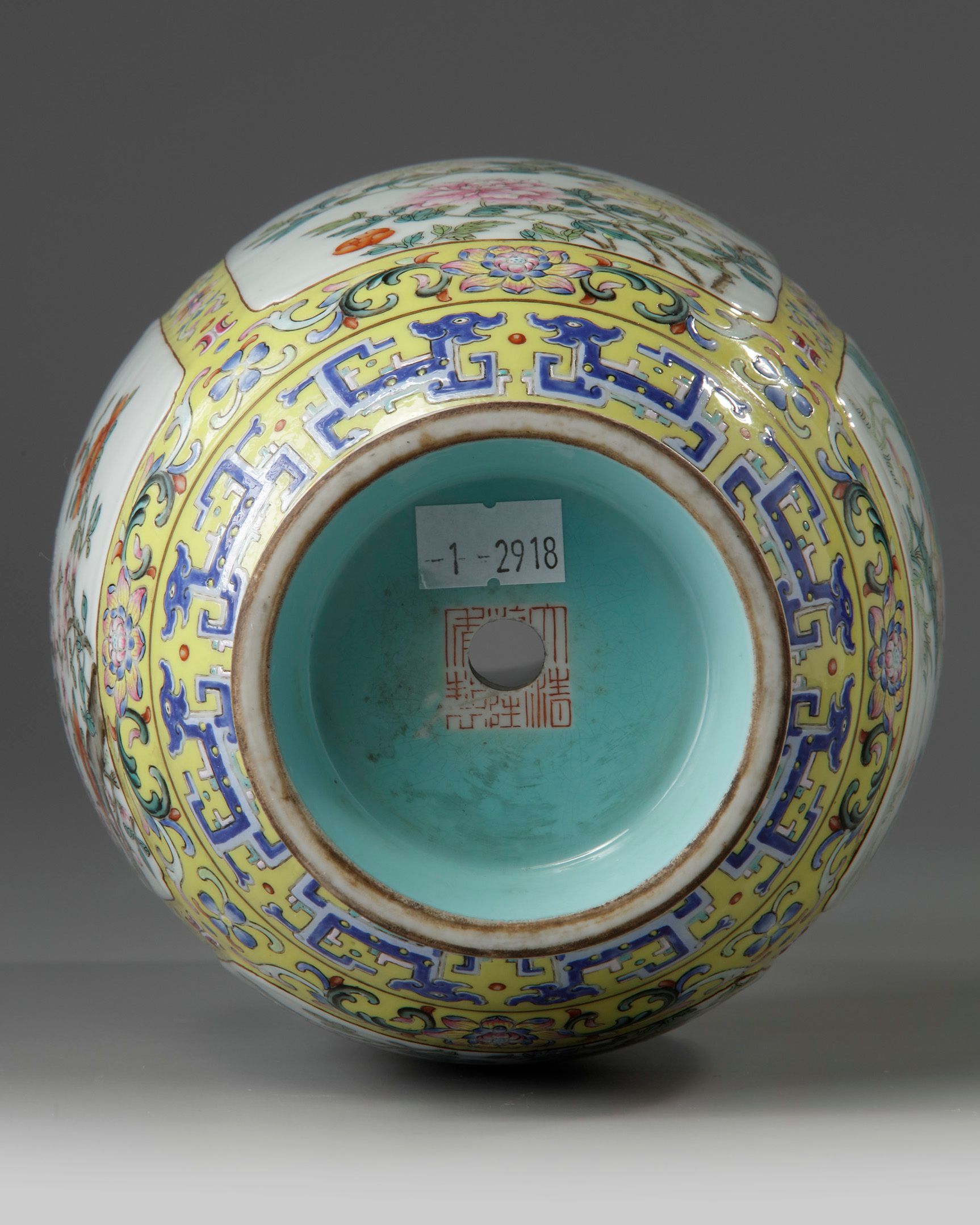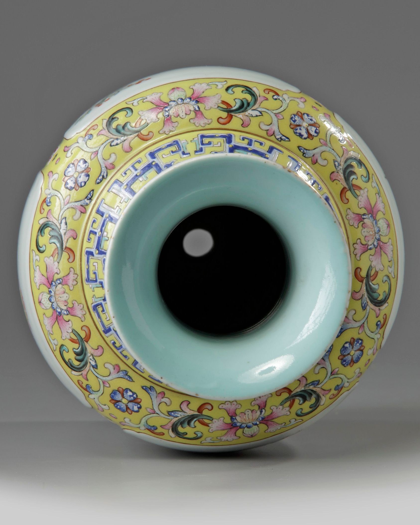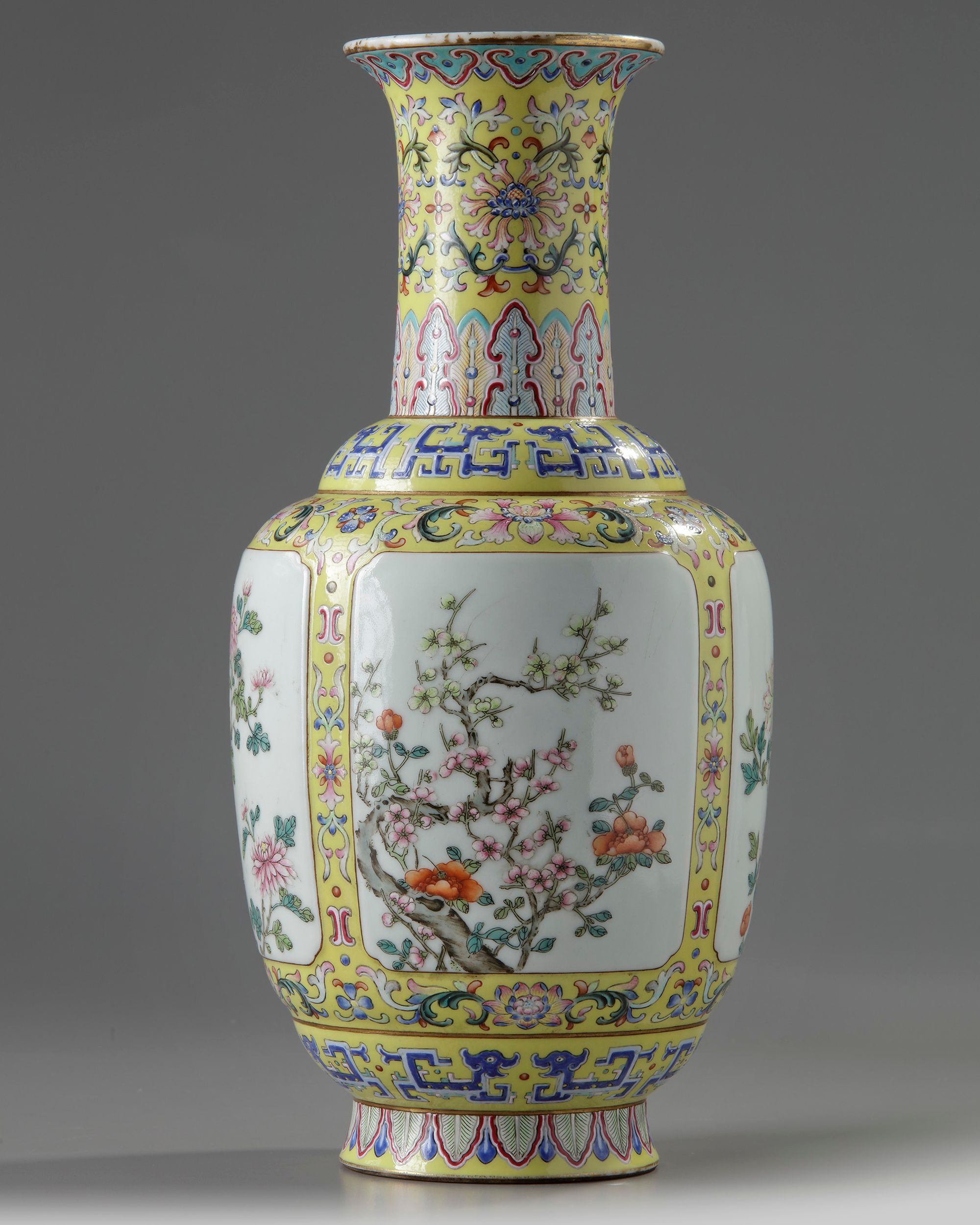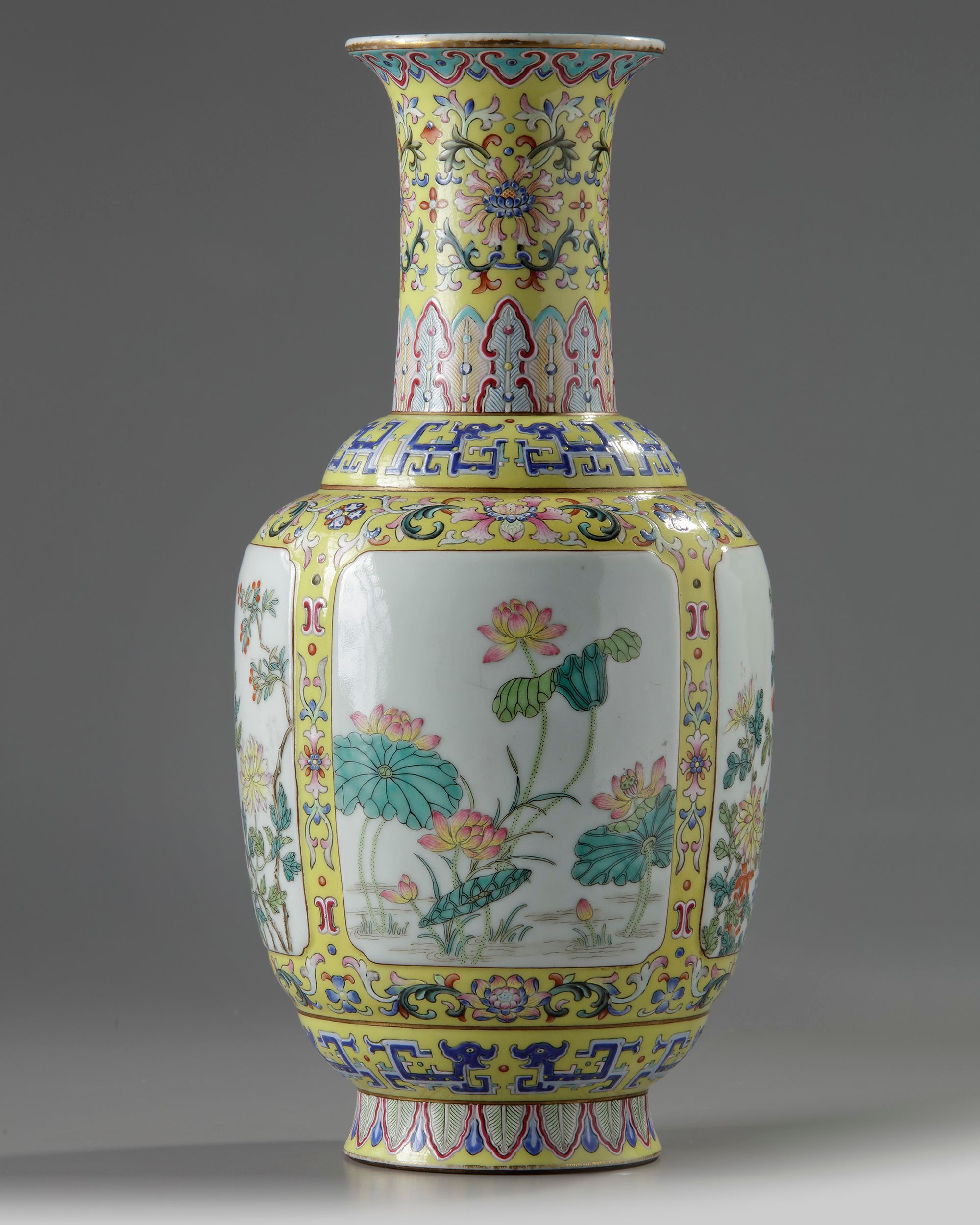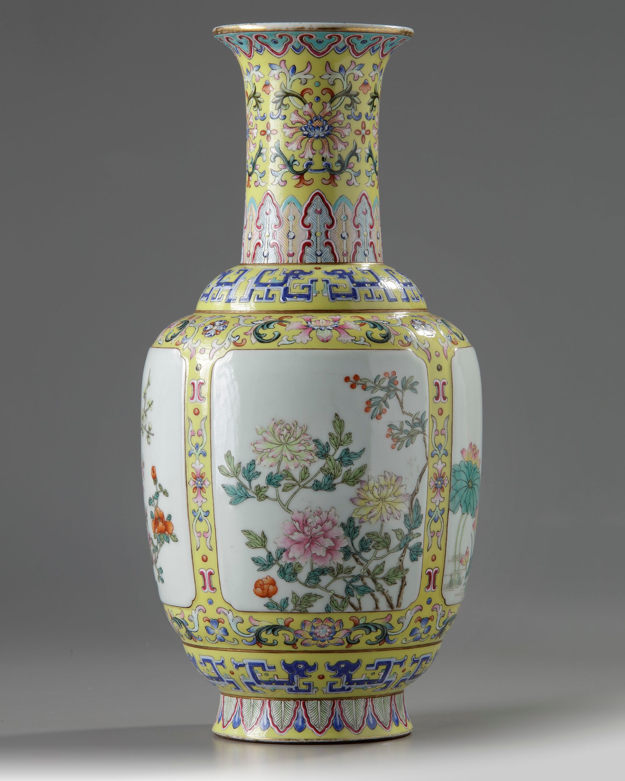 The vase is decorated with four moulded panels enclosing lotus, chrysanthemum, prunus, and peony, all surrounded by scrolling flowers on a lemon yellow ground. The shoulder and foot are decorated with a kui-dragon band, and the neck is decorated with further flower scrolls above a lappet band. The interior and base are enamelled turquoise. Base with an apocryphal Qianlong mark.