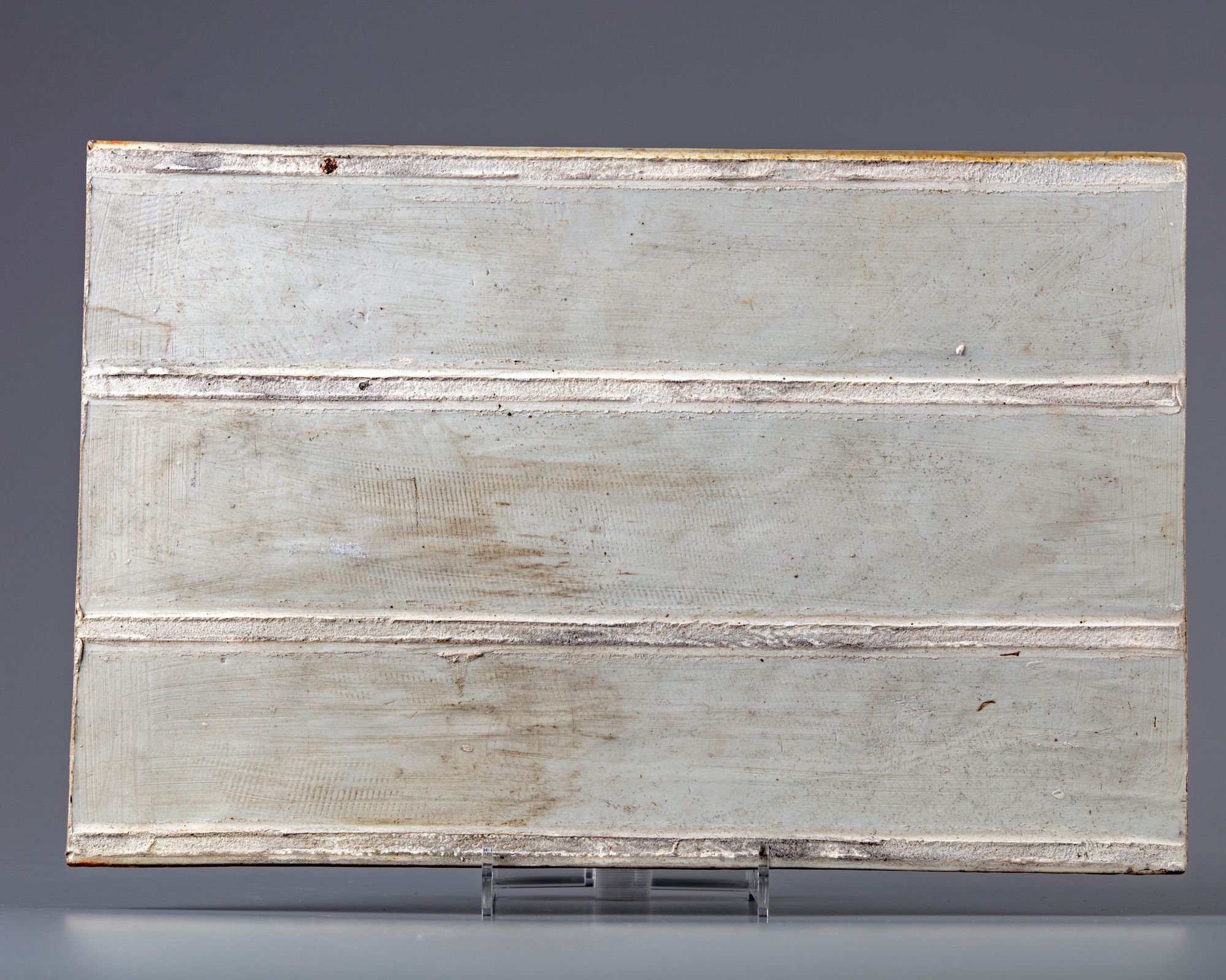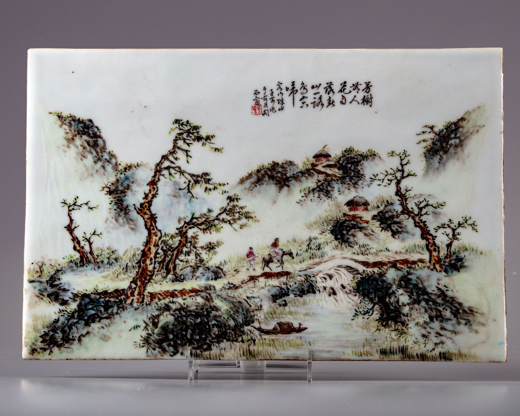 The rectangular plaque is decorated with a figure seated on a donkey with his servants walking on a rocky narrow road ,crossing a bridge towards small houses ,All in a rocky landscape in the winter.
