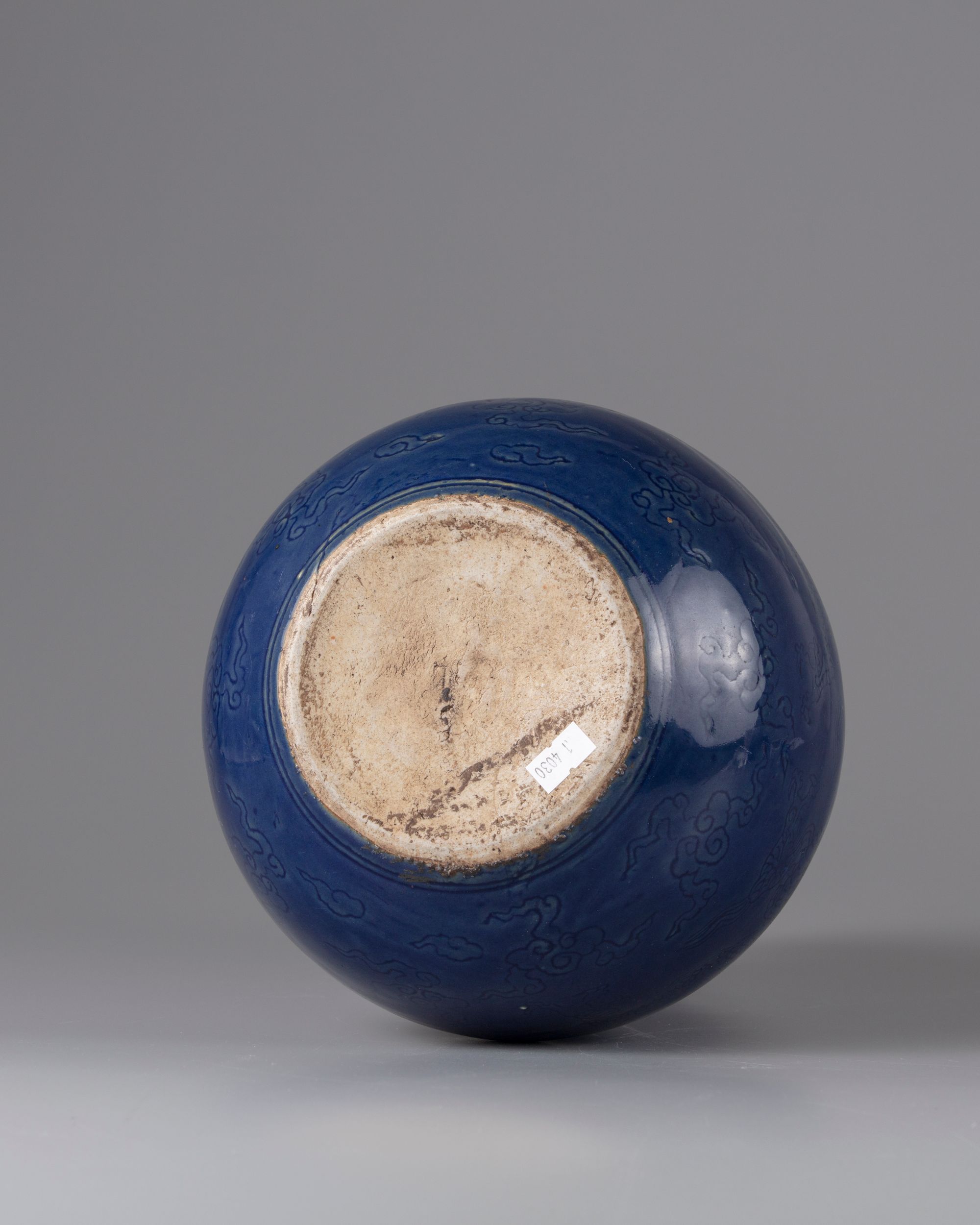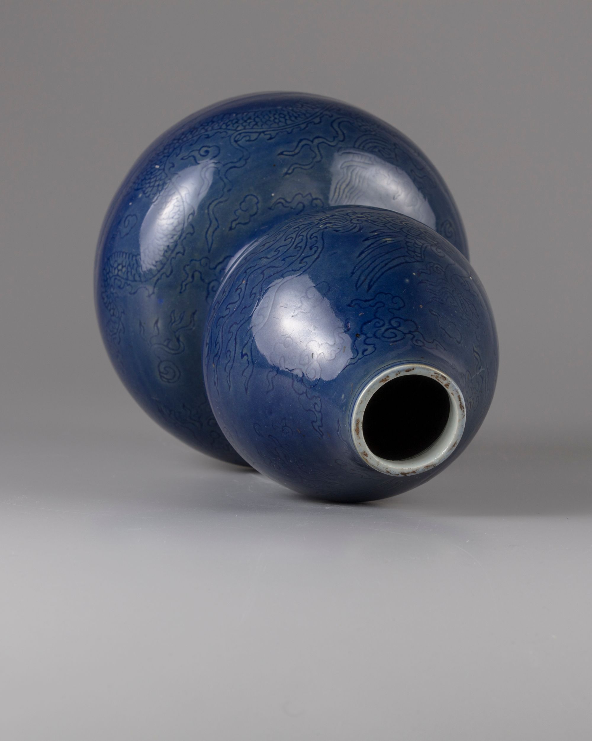The lower section with two dragons chasing a flaming pearl amongst Fu bats and clouds, covered with a dark blue glaze.