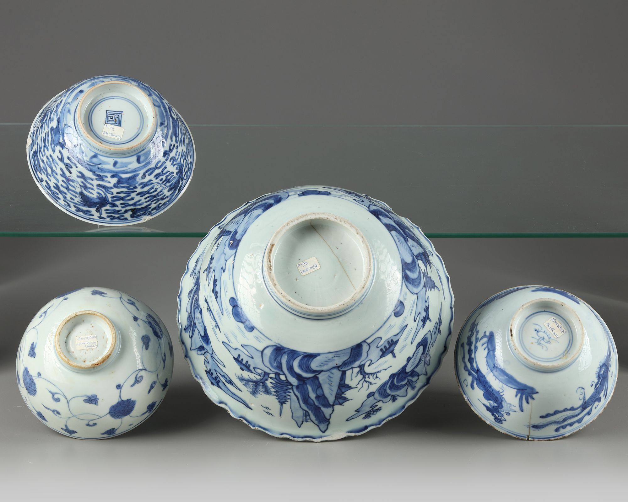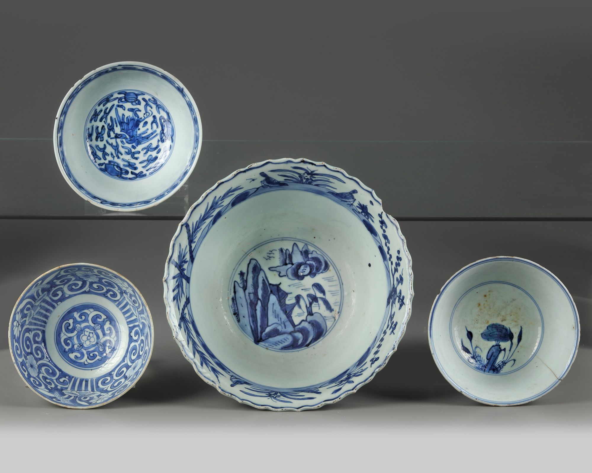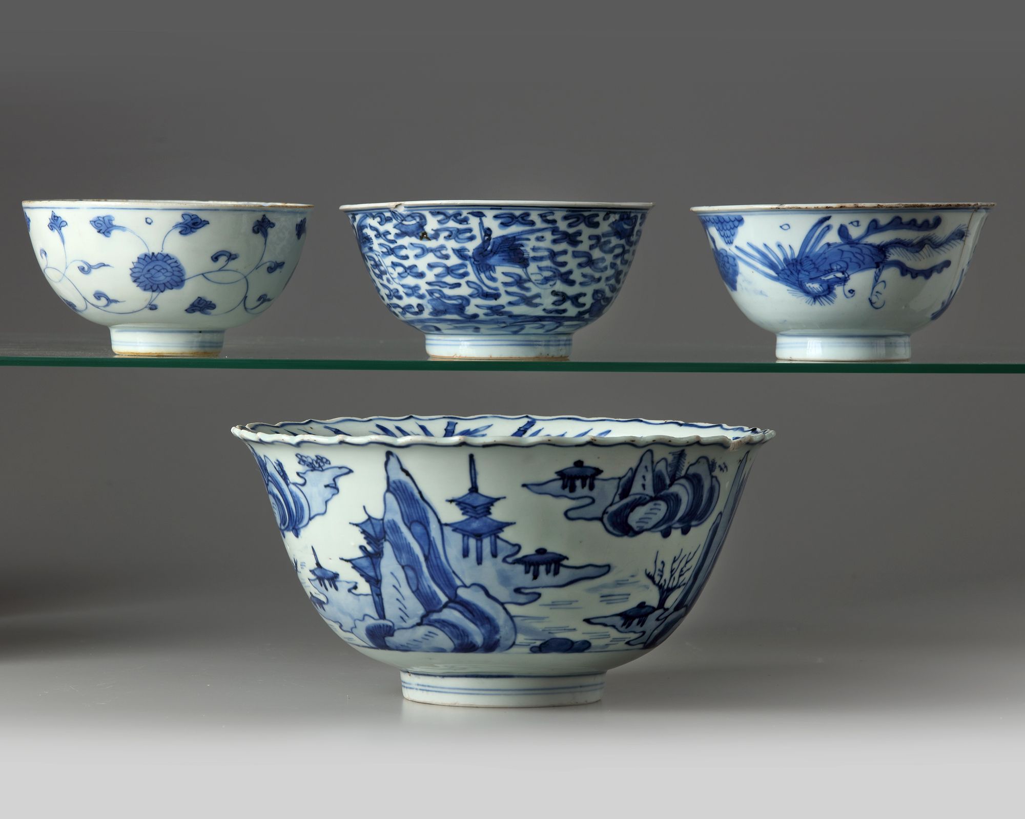 The group comprises a large foliate-rimmed bowl decorated with figures in a landscape, the inner rim decorated with birds, flower, and bamboo; a ‘crane and clouds’ bowl the base with a seal mark; a ‘twin phoenix’ bowl, the base with a lingzhi mark within a double circle; and a bowl decorated to the interior in reserve with lotus flower sand to the exterior with scrolling flowers.