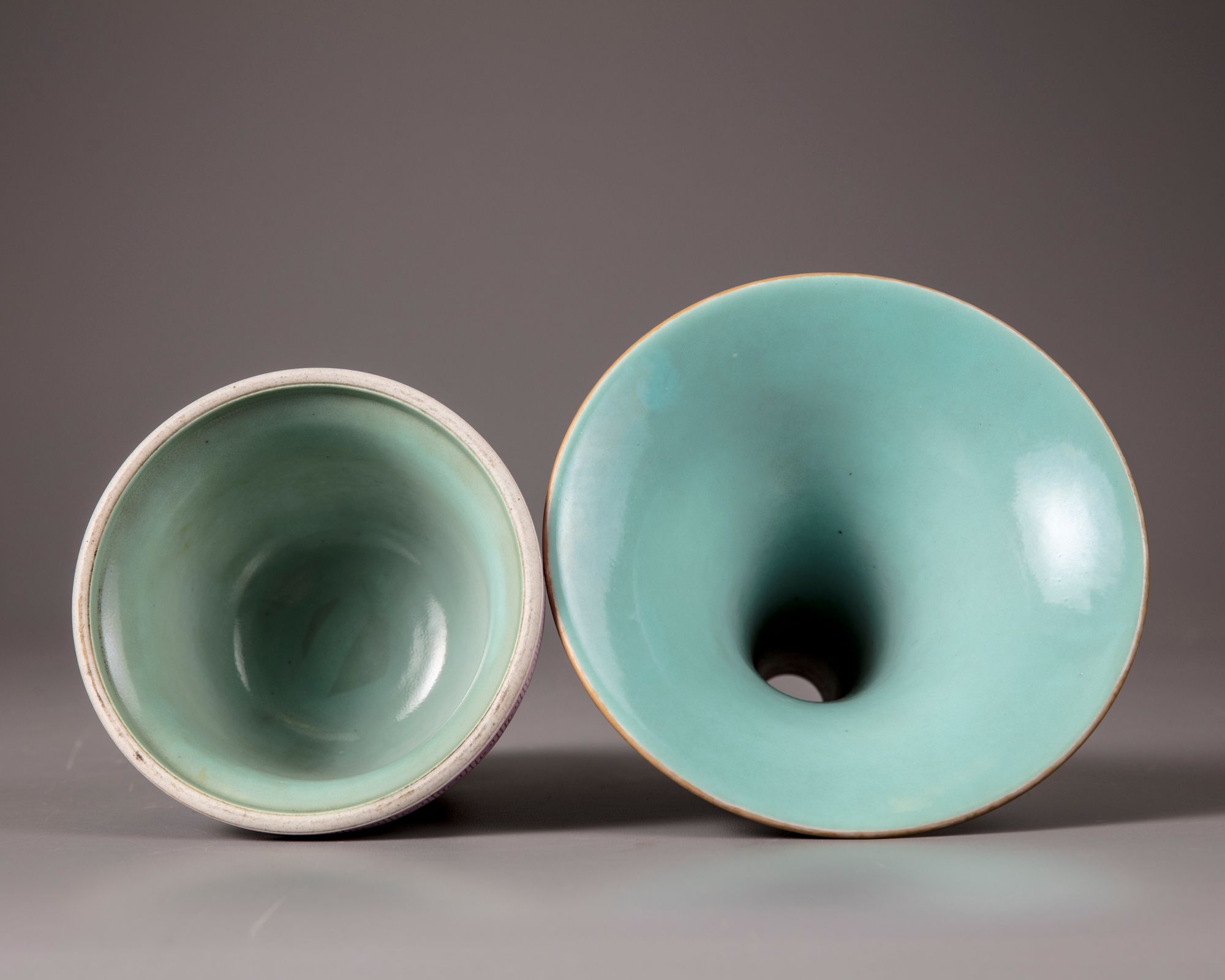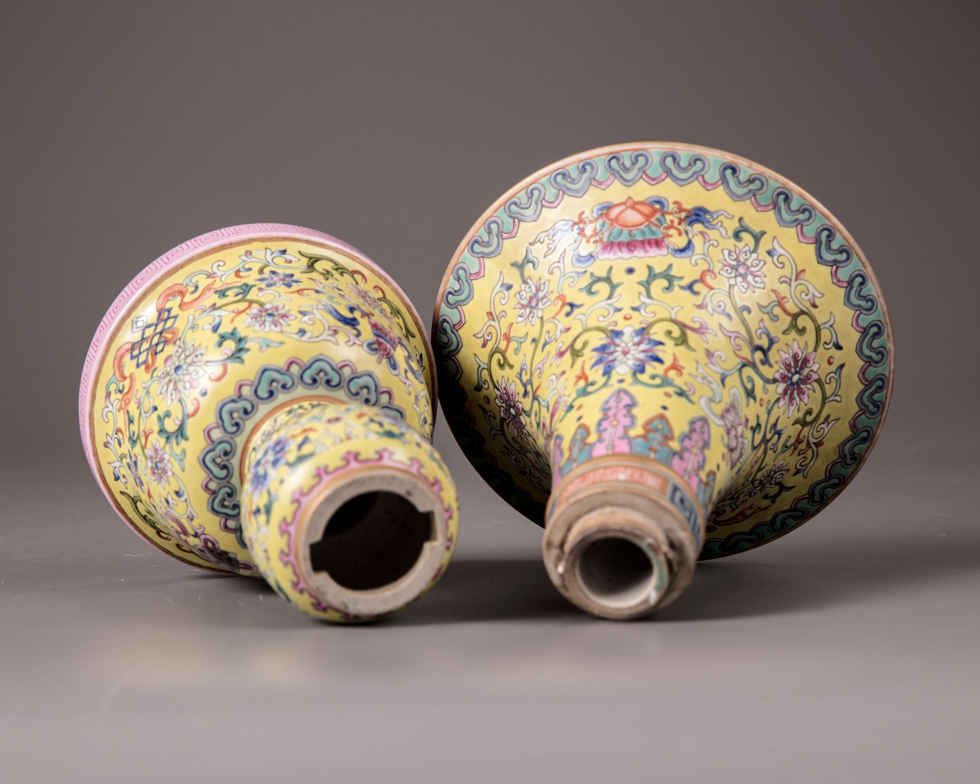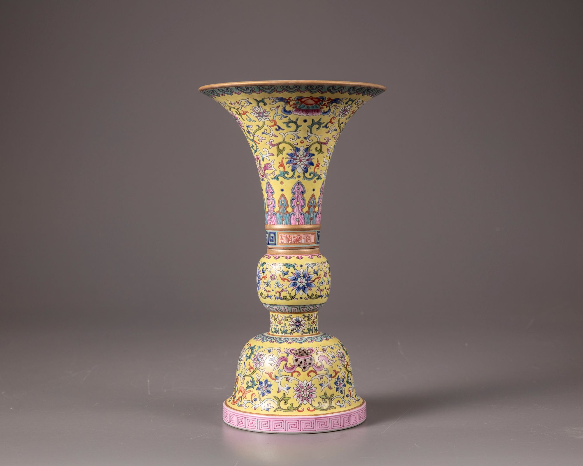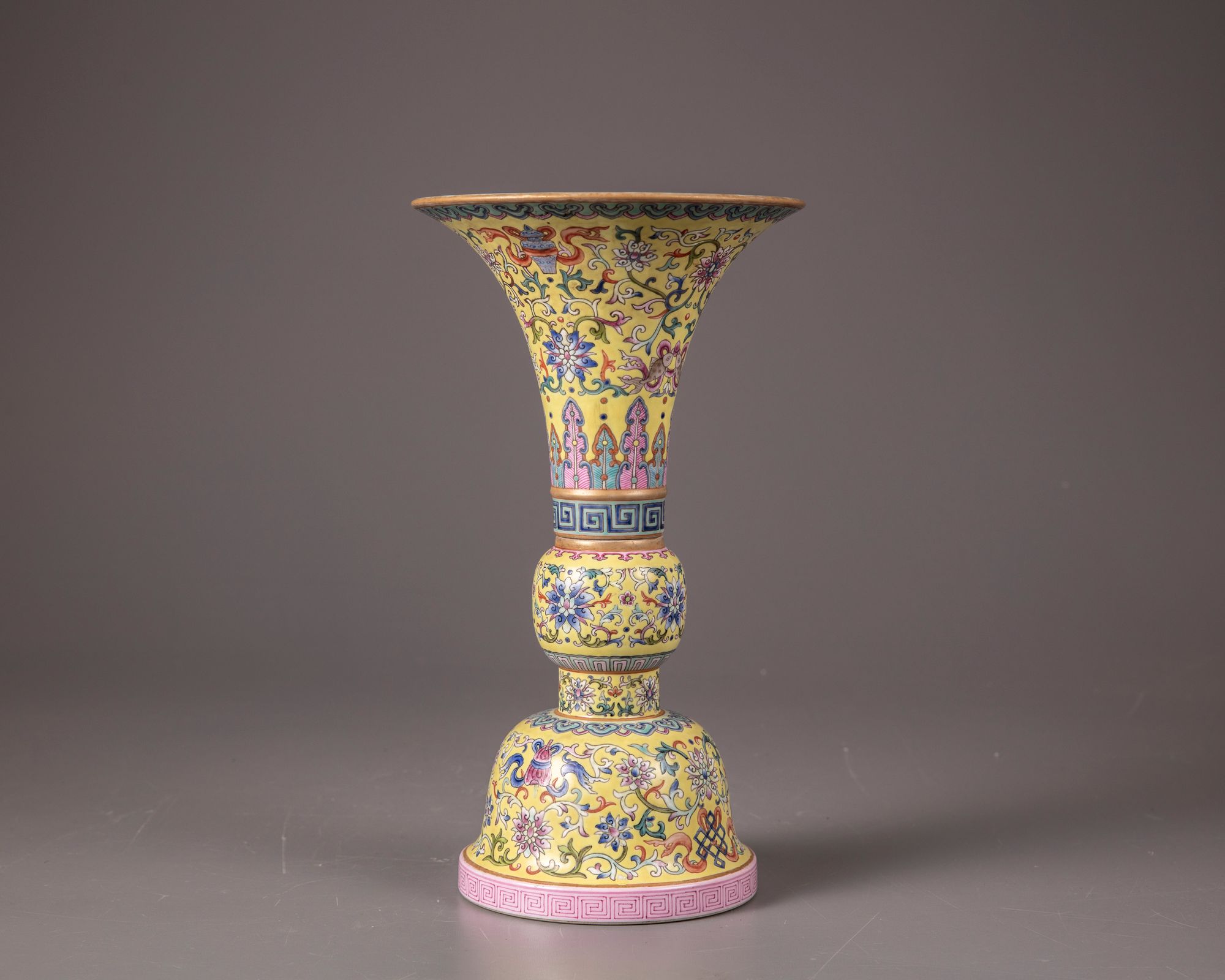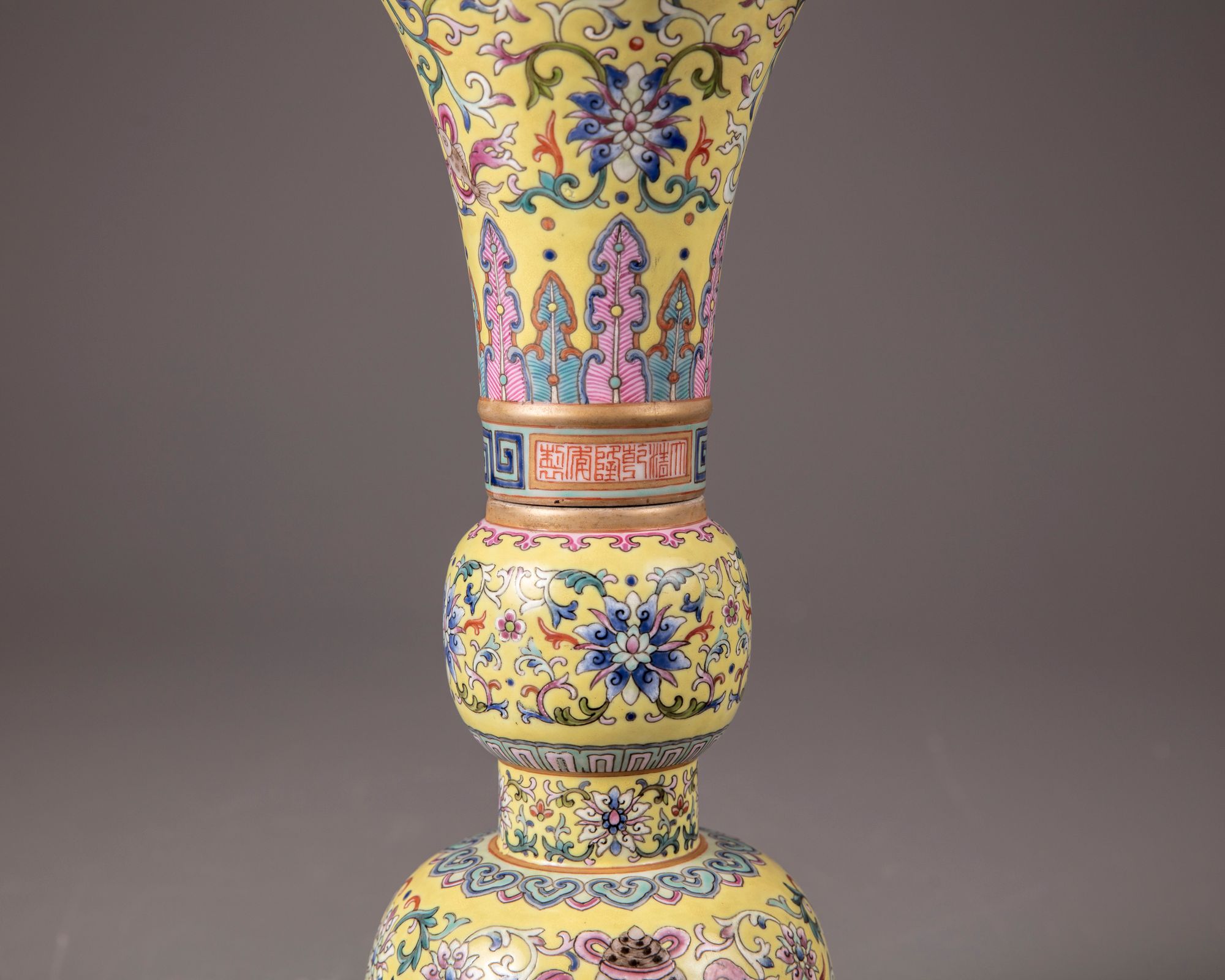 Decorated to the flaring mouth with precious items, a pair of confronting fish interspersed by lotus scrolls and foliage, set between a band of upright leaves and ruyi-heads. Further painted with a key fret chain with a Qianlong seal mark. The middle and the lower section are decorated with lotus scrolls, a petal lappet border and precious items. The recessed base and the interior are celadon glazed.