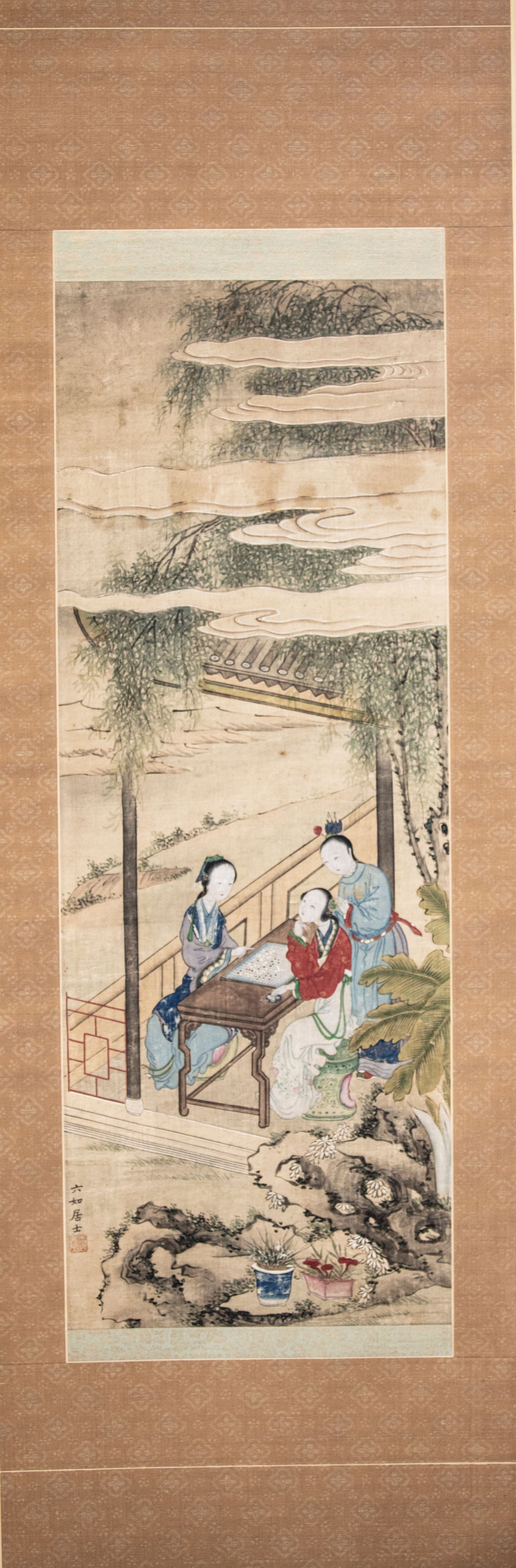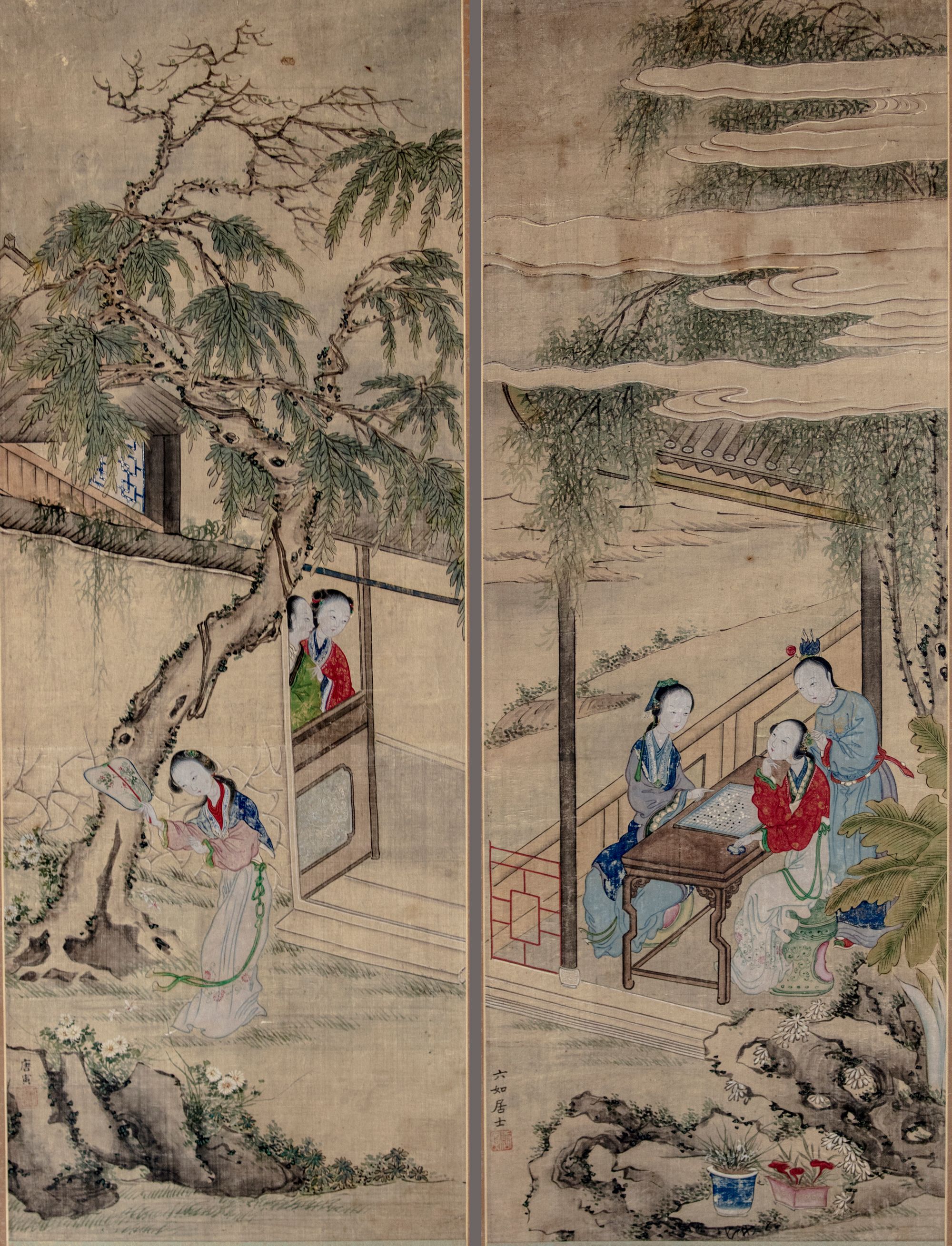 The first painting of two ladies playing Go with an assistant in a fenced garden ,The second painting of a lady with fan beside a tree ,watched by two other attendants.