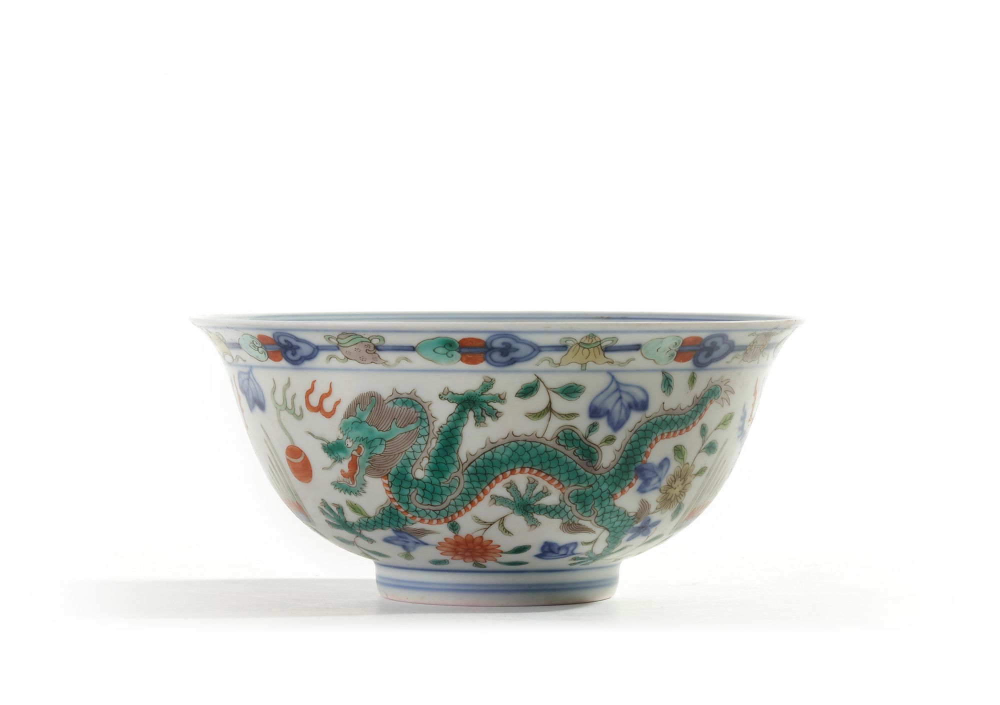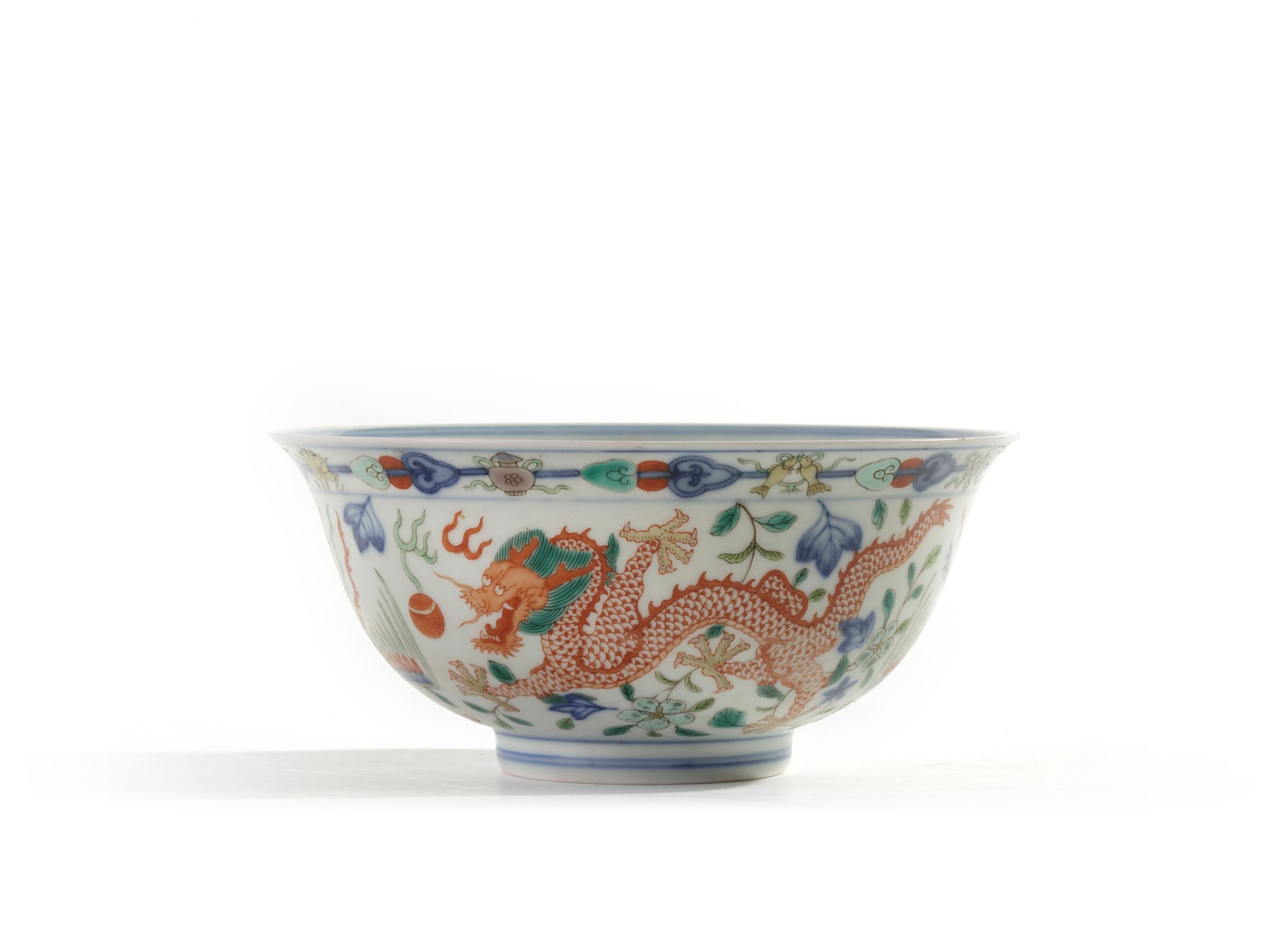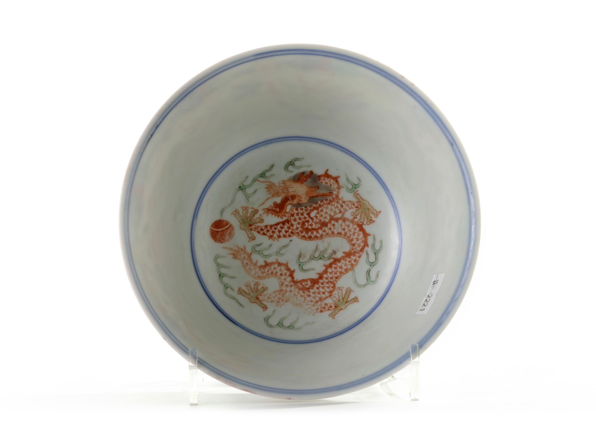 The bowl has deep, rounded sides flaring slightly to the rim, and the exterior is decorated with two phoenix descending between green and iron-red dragons pursuing flaming pearls amidst flower sprigs, below a band of Buddhist Emblems alternating with ruyi heads joined by a blue line. The interior is decorated with a medallion of an iron-red dragon leaping in pursuit of a flaming pearl. The base with an apocryphal Qianlong mark.