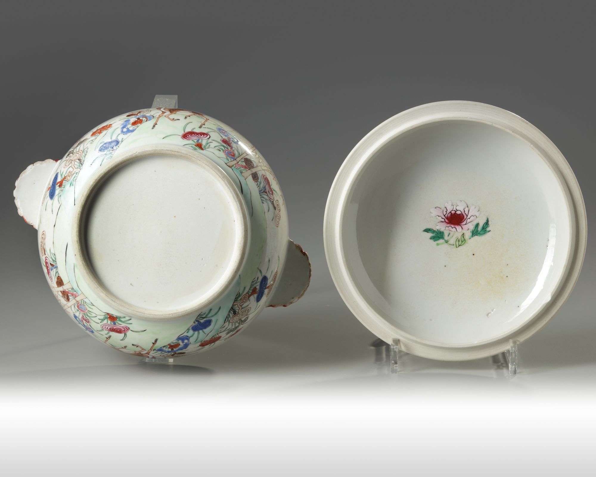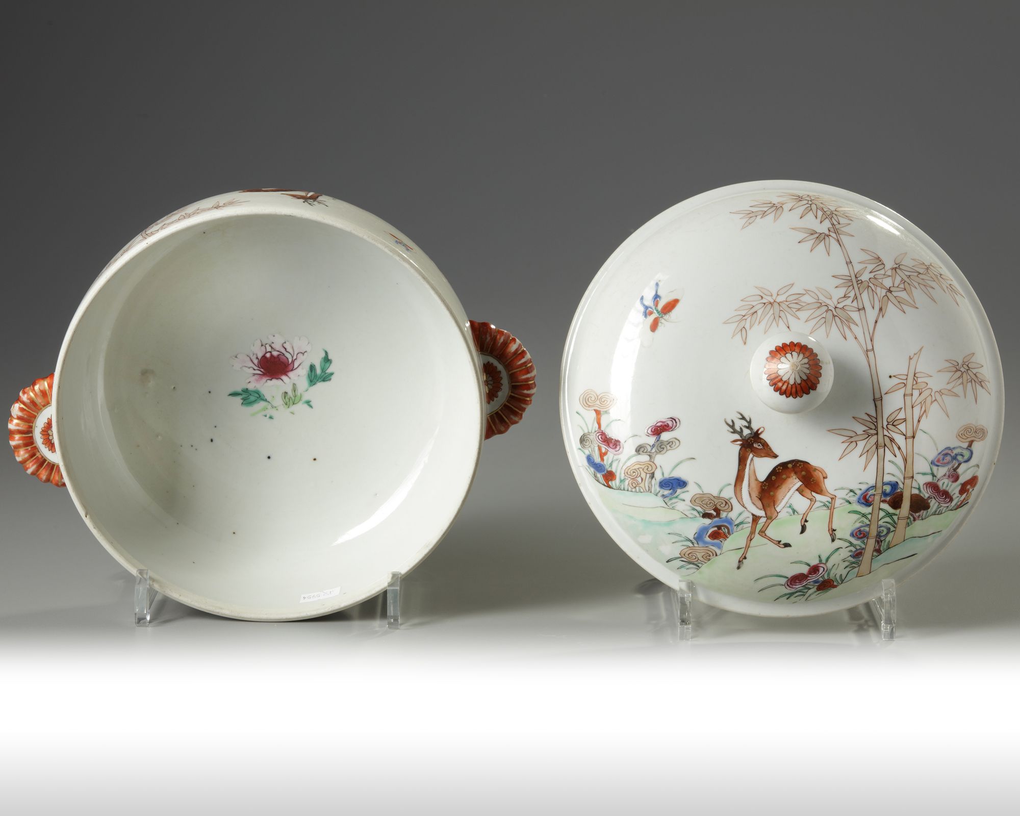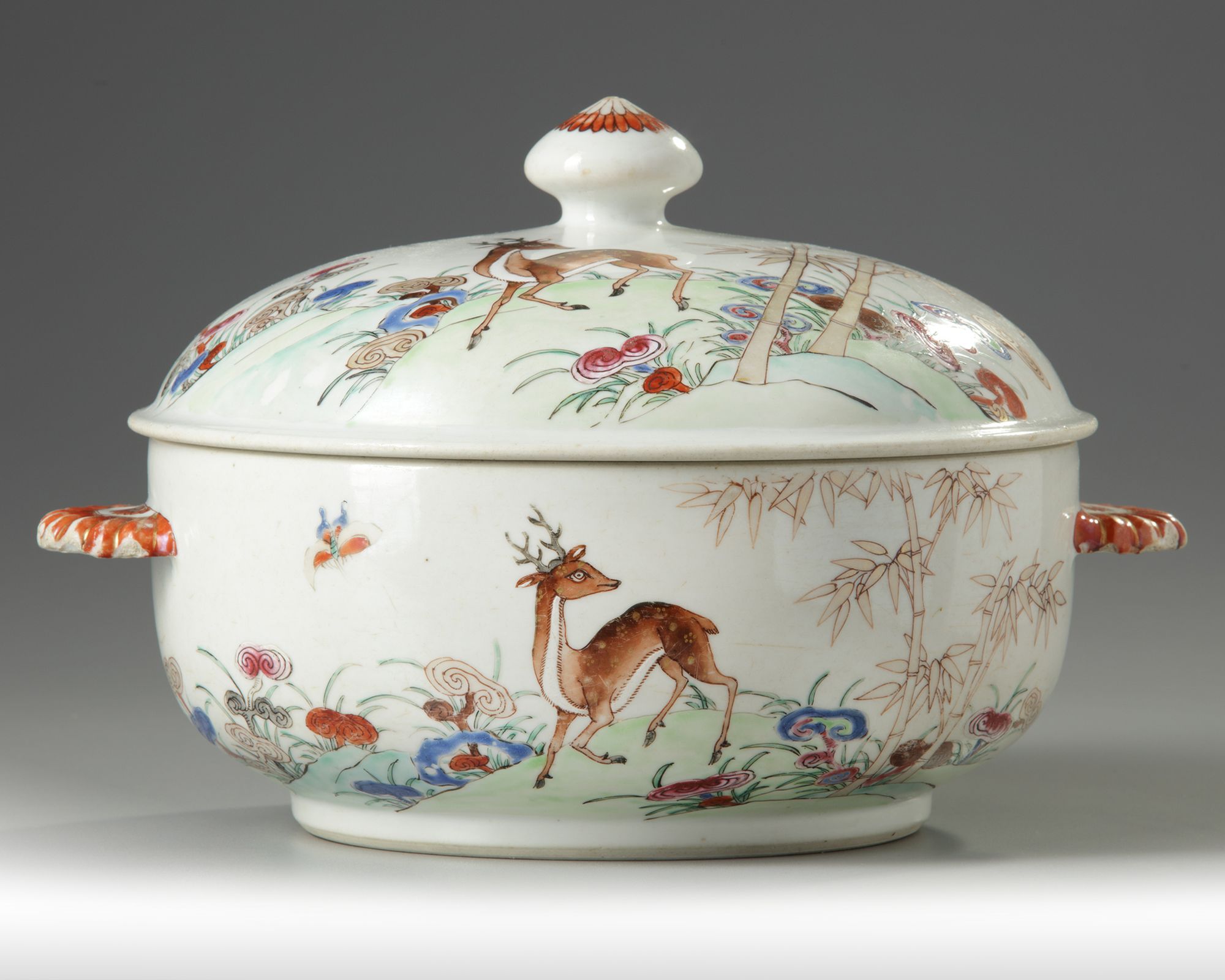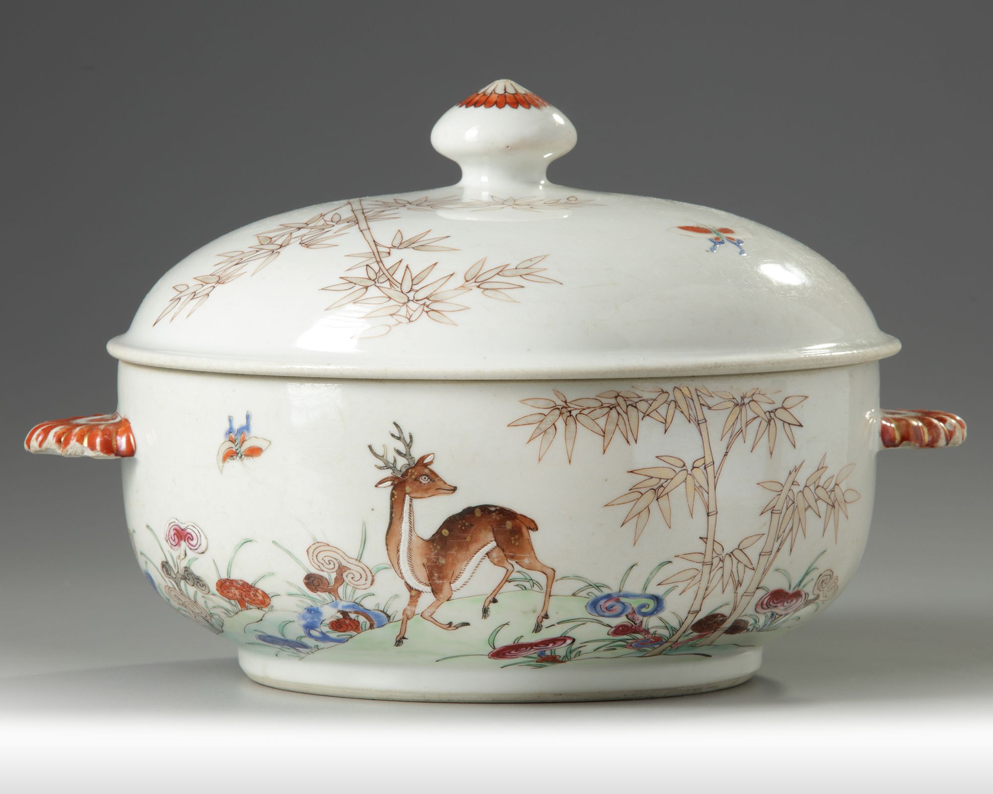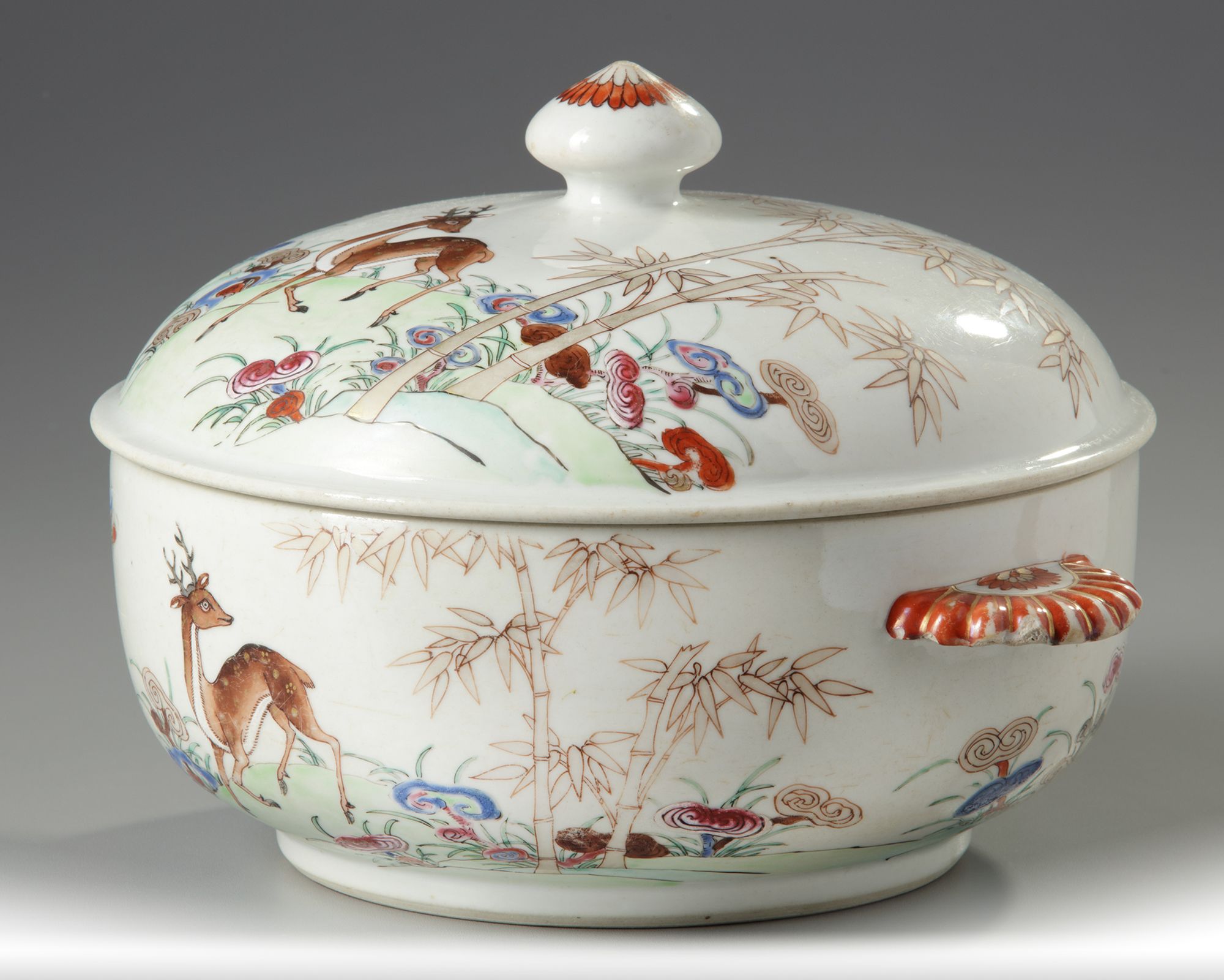 The cover and exterior are decorated and gilt with a deer below pine amongst lingzhi fungus, all below a butterfly in flight. The tureen is affixed with two fan-shaped lug handles, and the interior is decorated with a blossoming peony. The slightly domed cover is surmounted by a lotus bud finial enameled with a chrysanthemum. 18 by 27.5 cm.