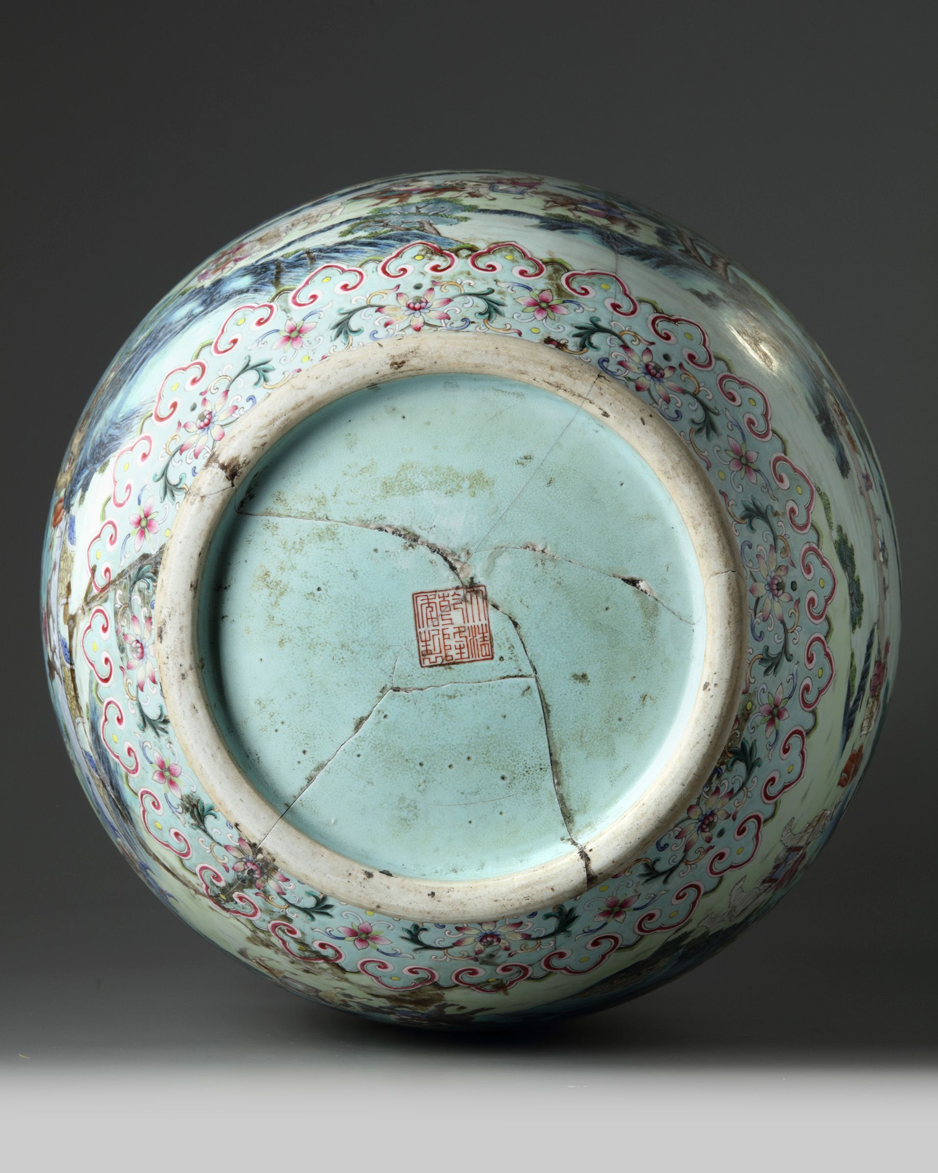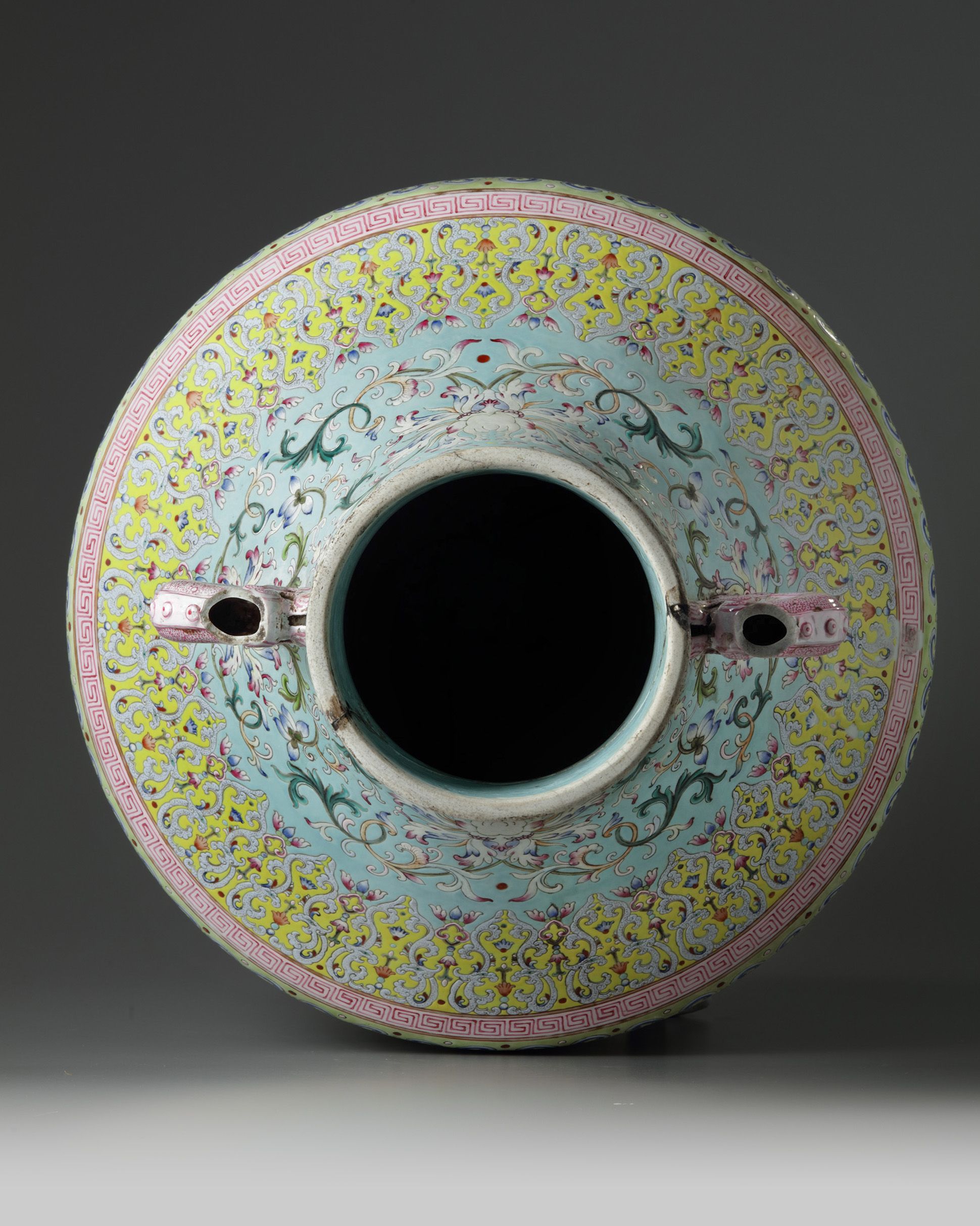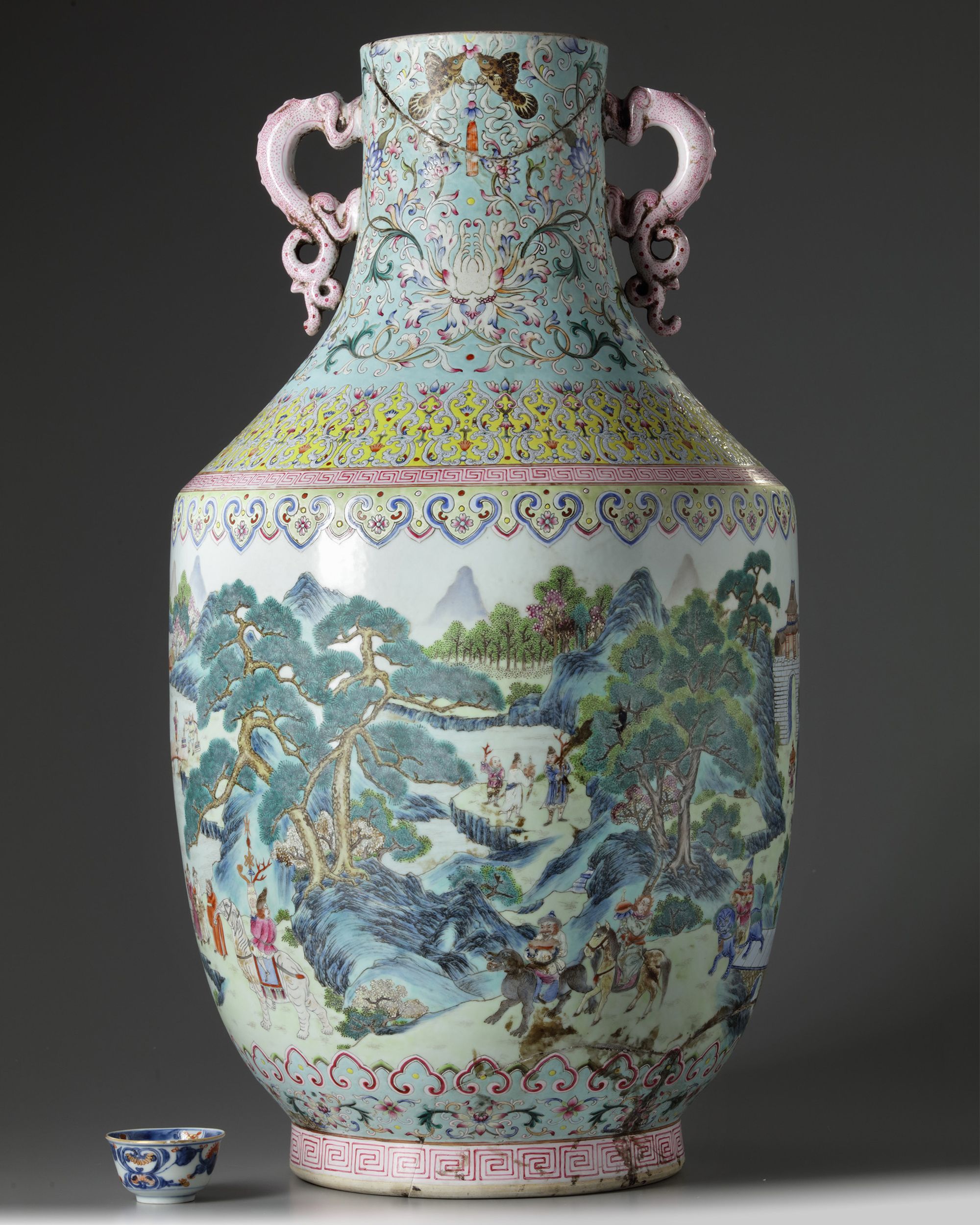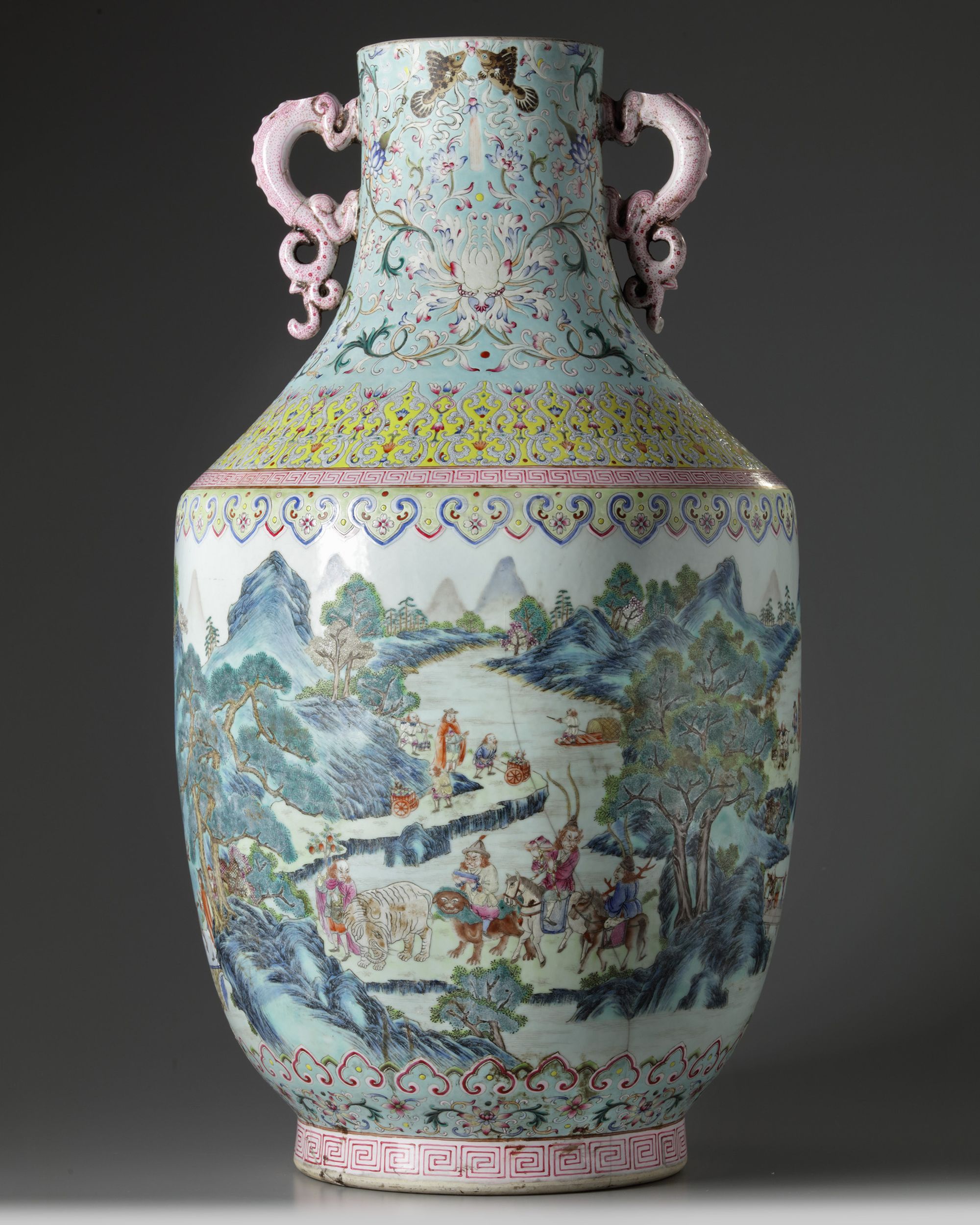 The body of the vase is decorated with a continuous scene of figures bearing various precious items in a mountainous landscape, all below a turquoise glazed neck with lotus sprays flanked by two pink-enamelled handles. The base with an apocryphal Qianlong mark.