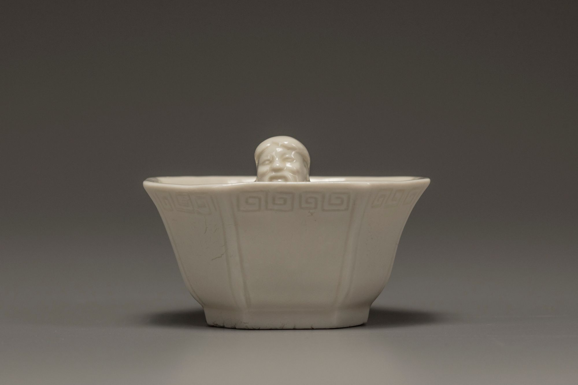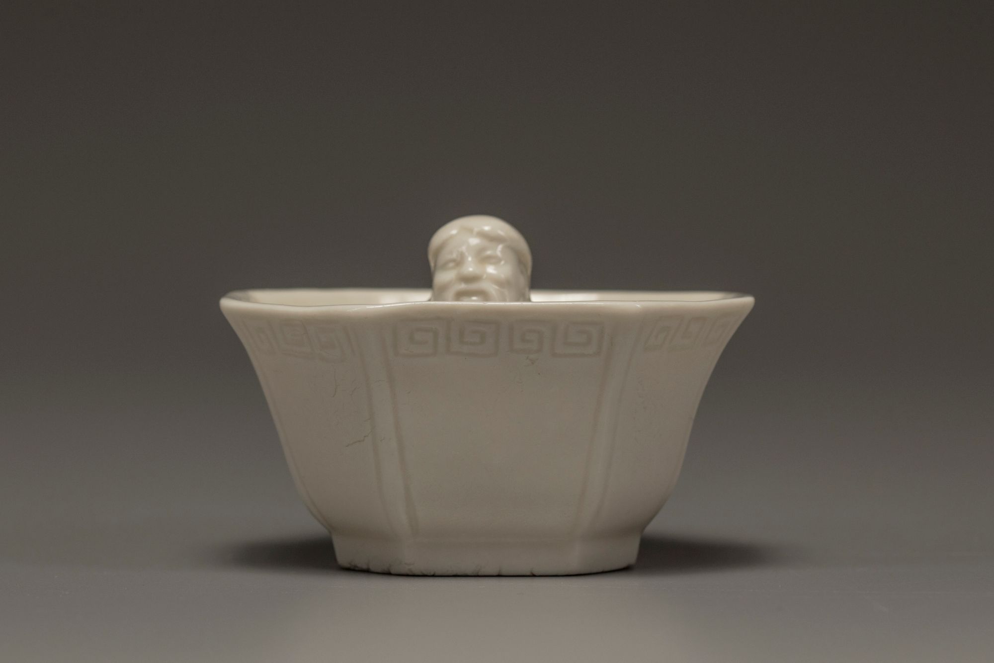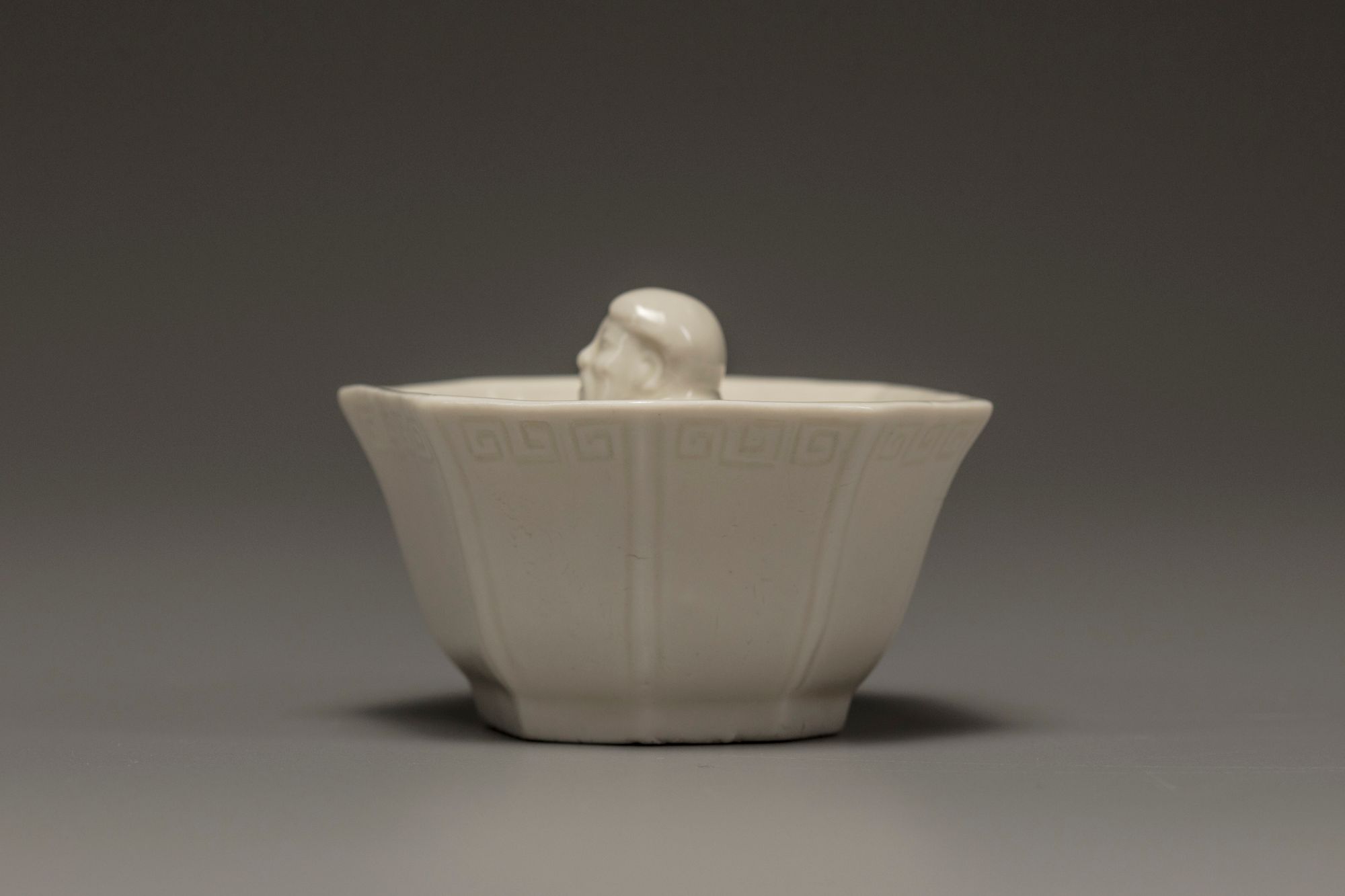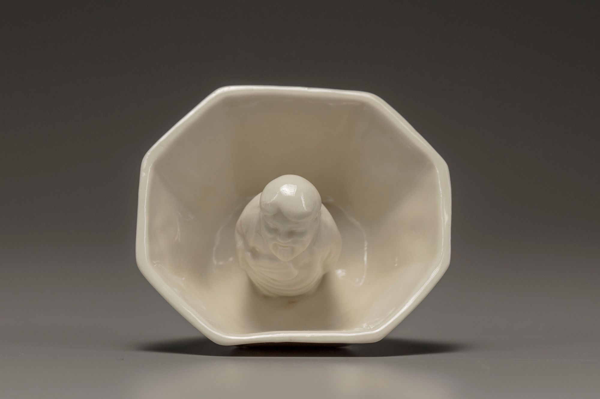 The octagonal cup is decorated to the interior with and Immortal wearing long robes open at the chest holding a fan. The exterior is decorated with squared scrolls.