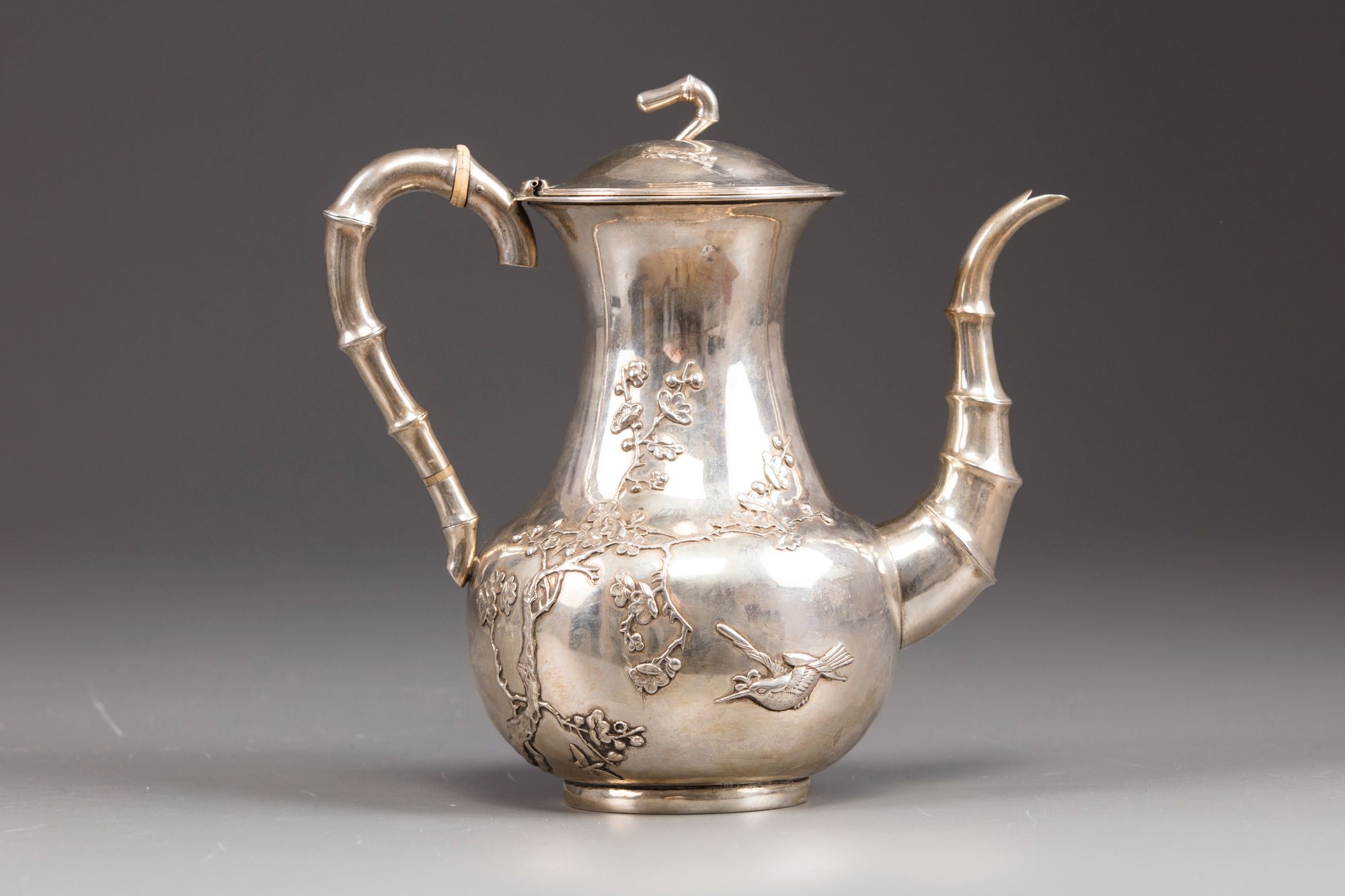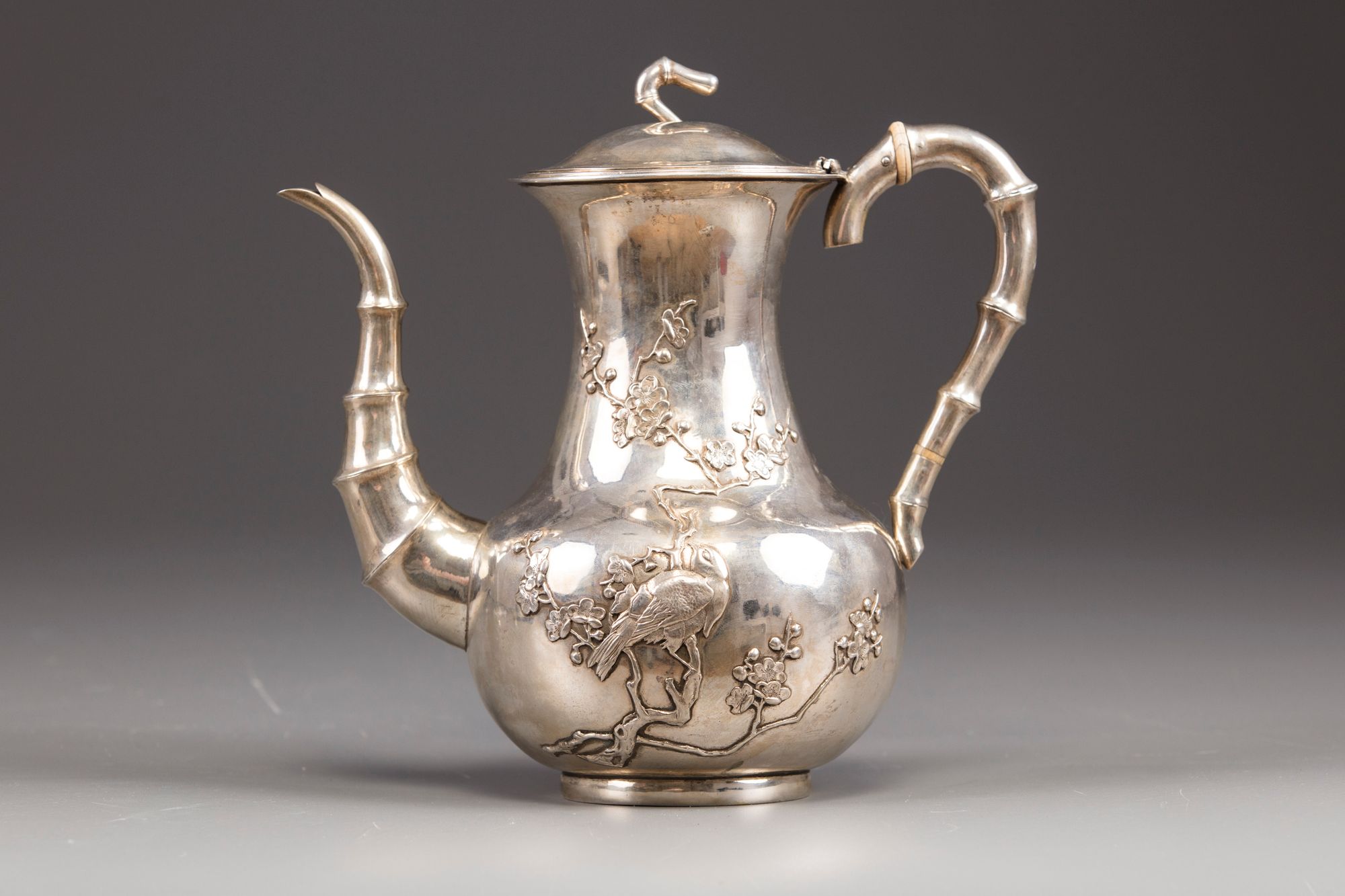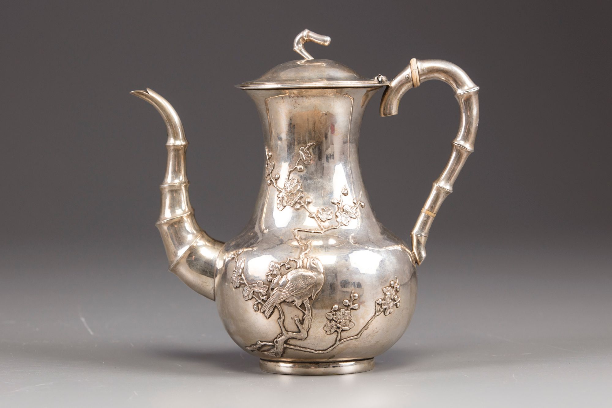 The body is decorated to both sides with birds amongst flowering prunus branches. The handle and spout are elegantly modelled as in the form of bamboo, the handles with two ivory insulators. The domed cover is surmounted by a bamboo finial. The base is marked KW and the maker's mark 'Chang? An'.