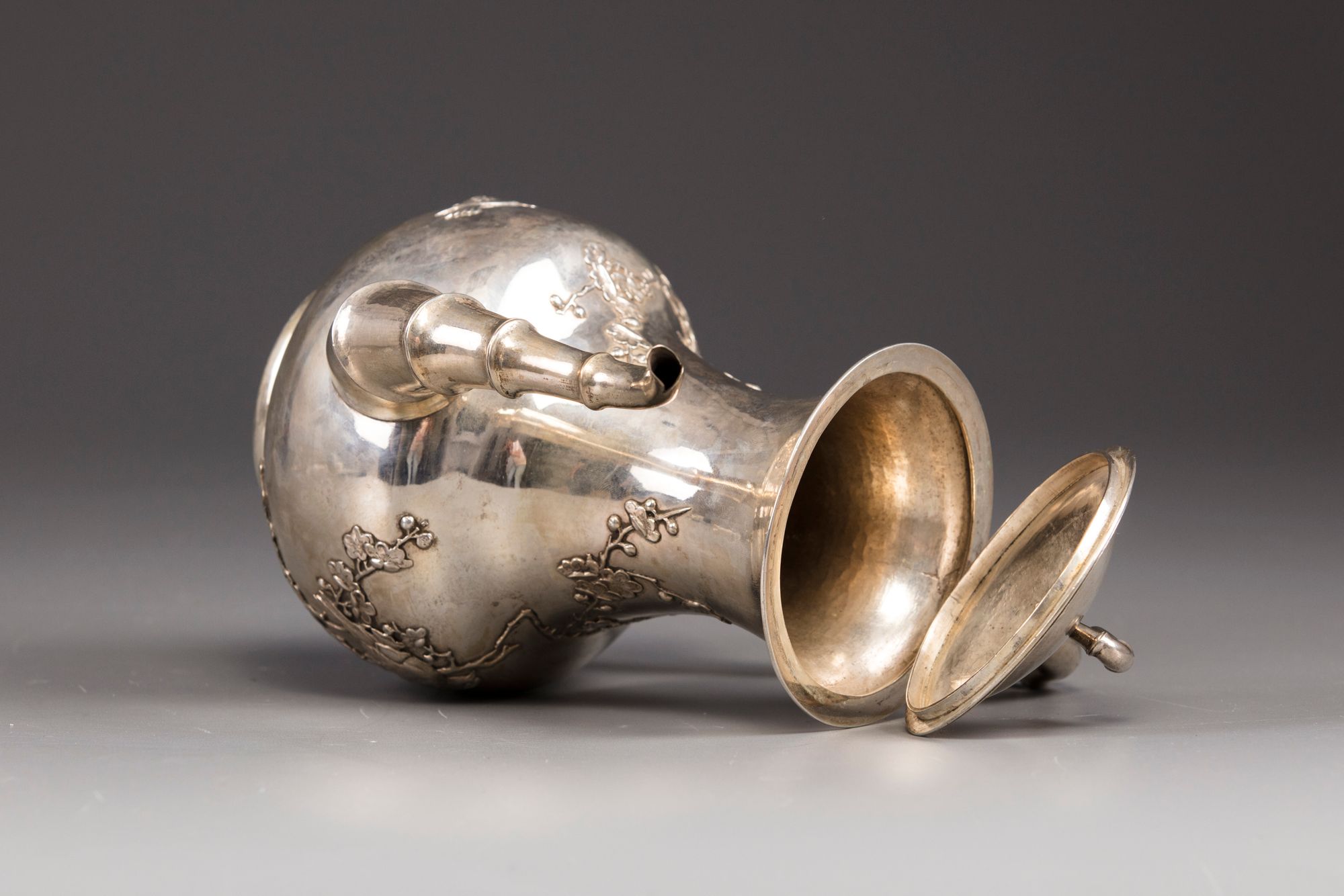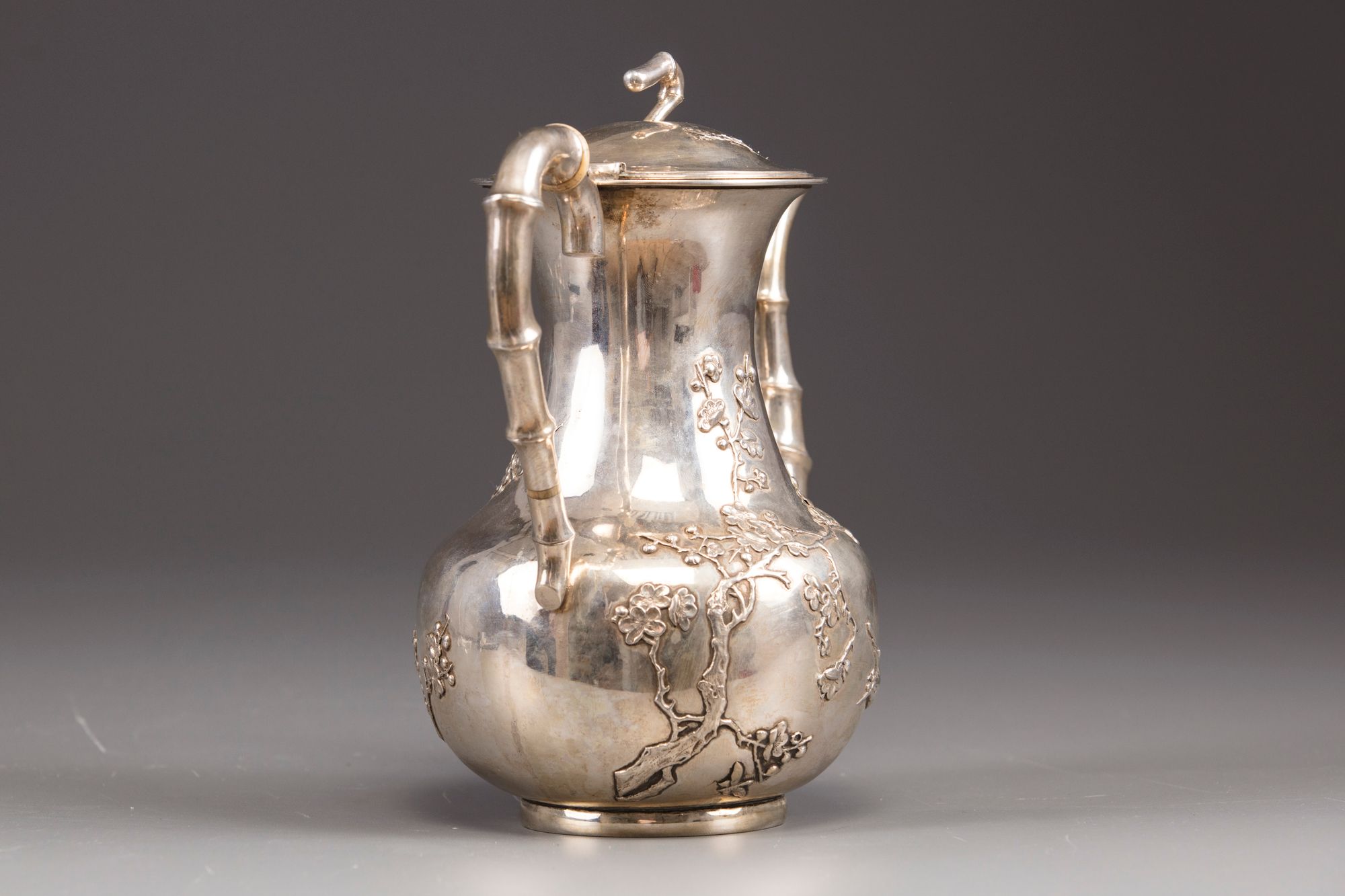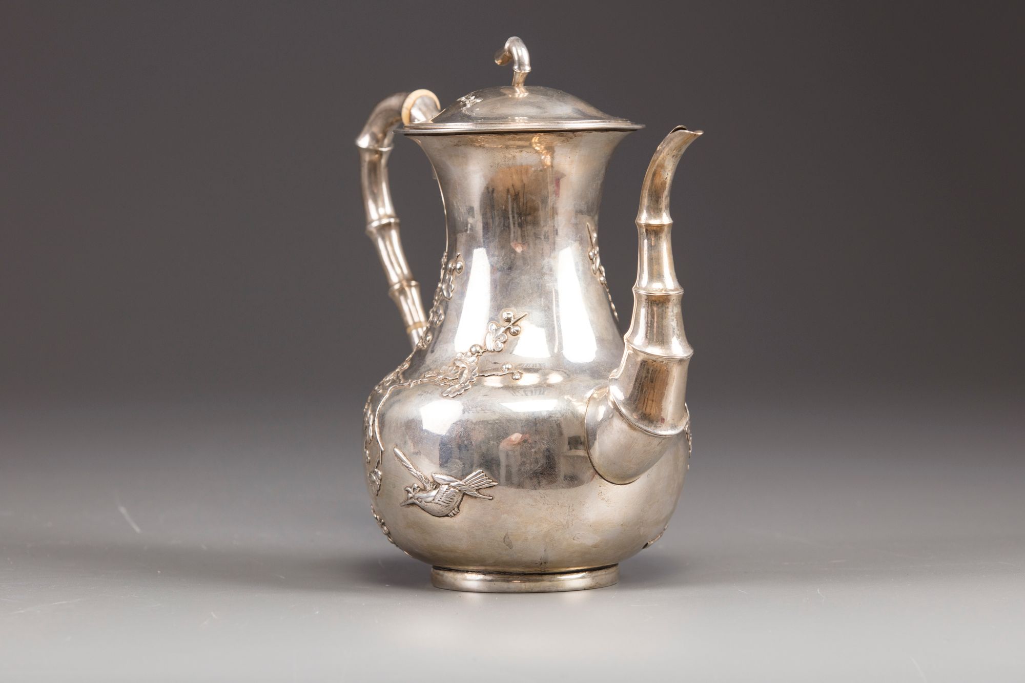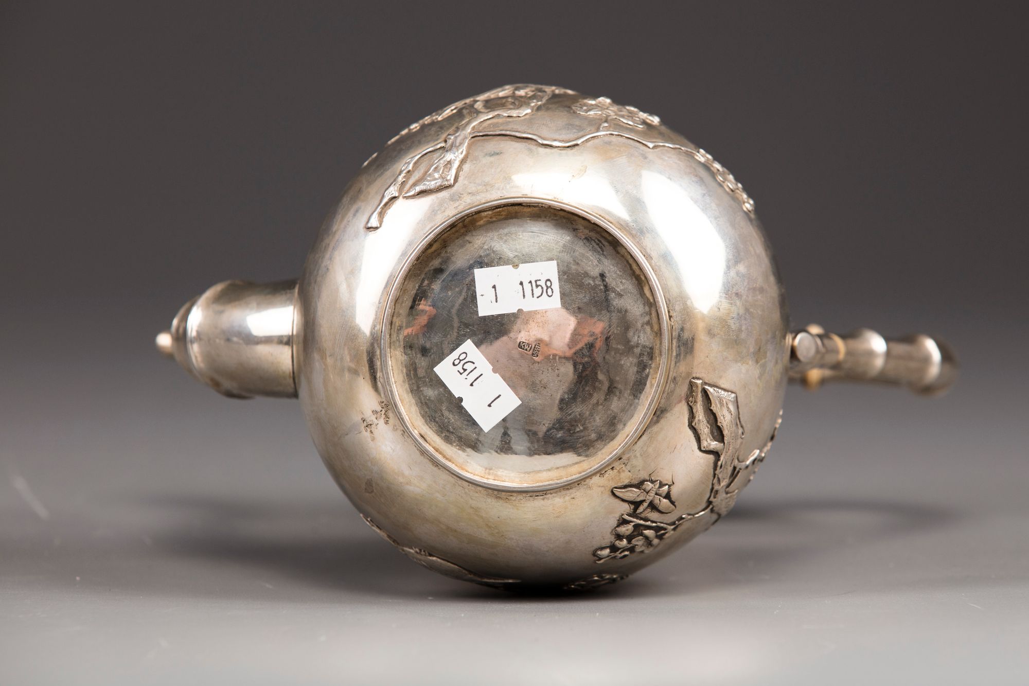 The body is decorated to both sides with birds amongst flowering prunus branches. The handle and spout are elegantly modelled as in the form of bamboo, the handles with two ivory insulators. The domed cover is surmounted by a bamboo finial. The base is marked KW and the maker's mark 'Chang? An'.