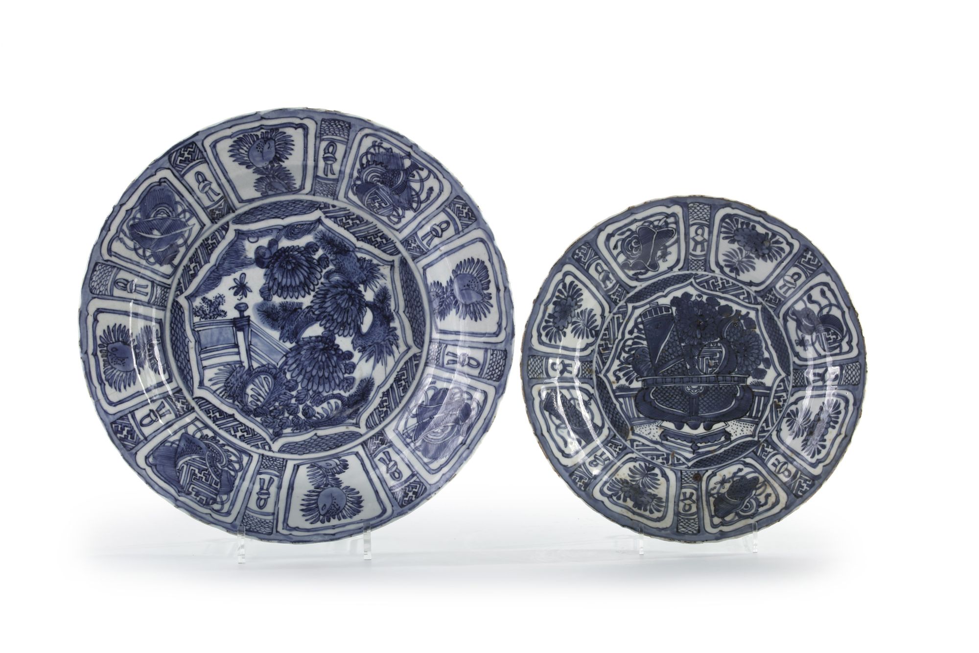The charger is finely decorated to the centre with chrysanthemum blossoms in a fenced garden, the cavetto and rim are decorated with panels enclosing alternating flowers and auspicious objects. the other dish is decorated with flowers and scrolls in a jardinière in a fenced garden, the cavetto and rim are decorated with panels enclosing alternating flowers and auspicious objects. The larger dish 36 cm. diameter.