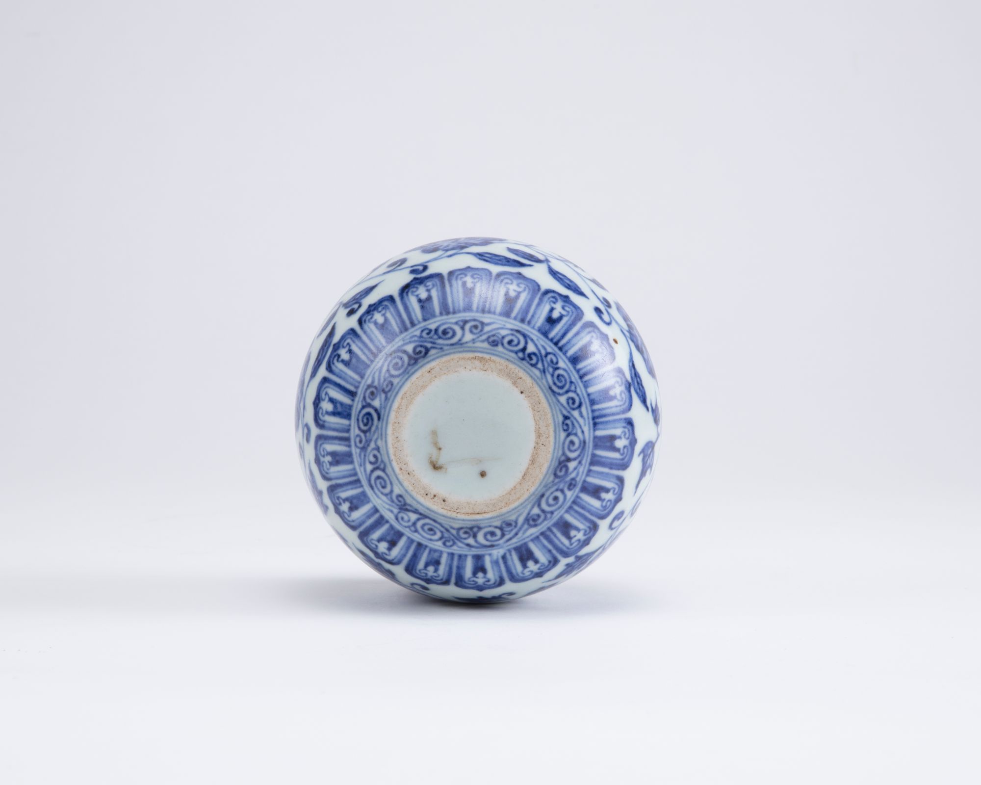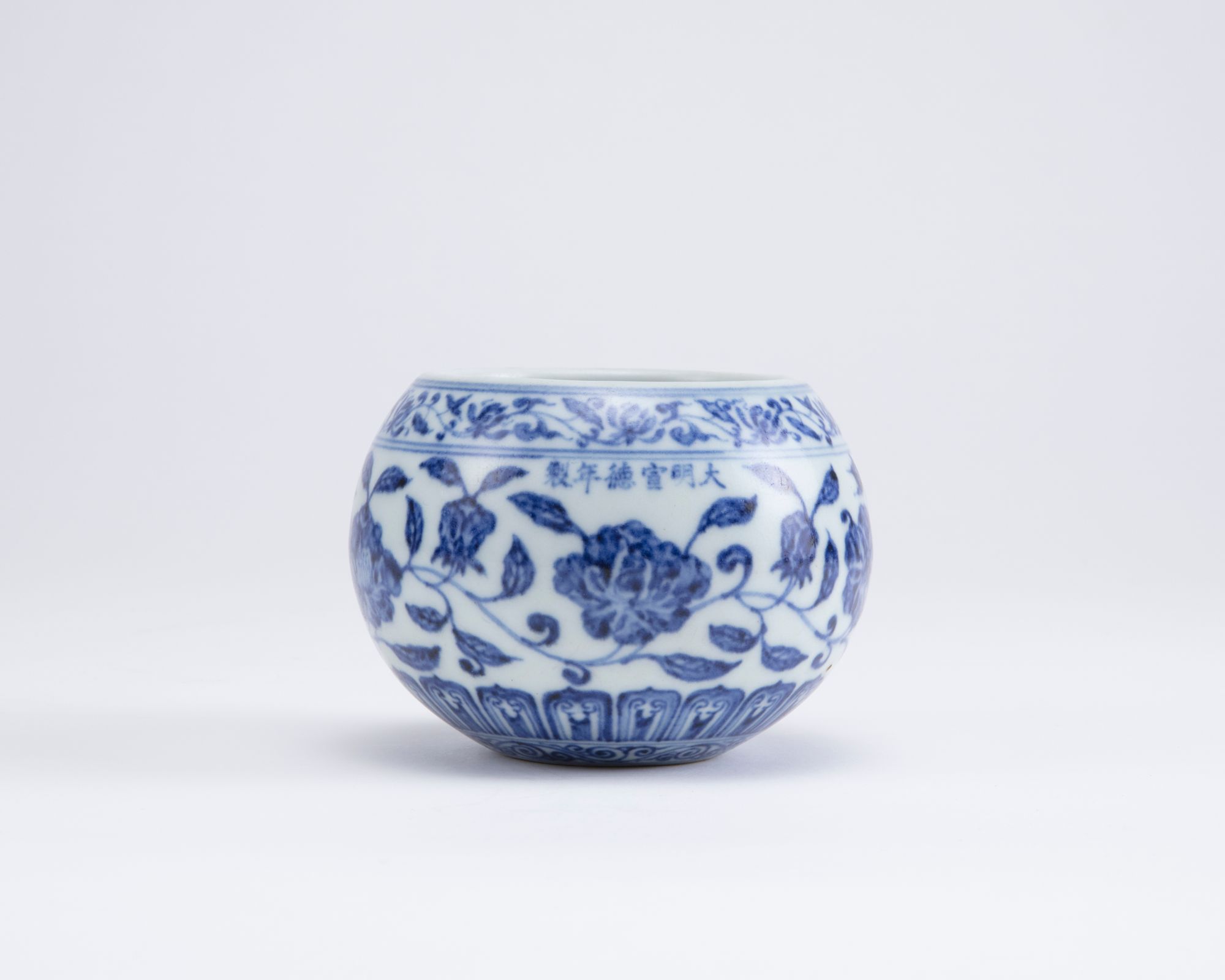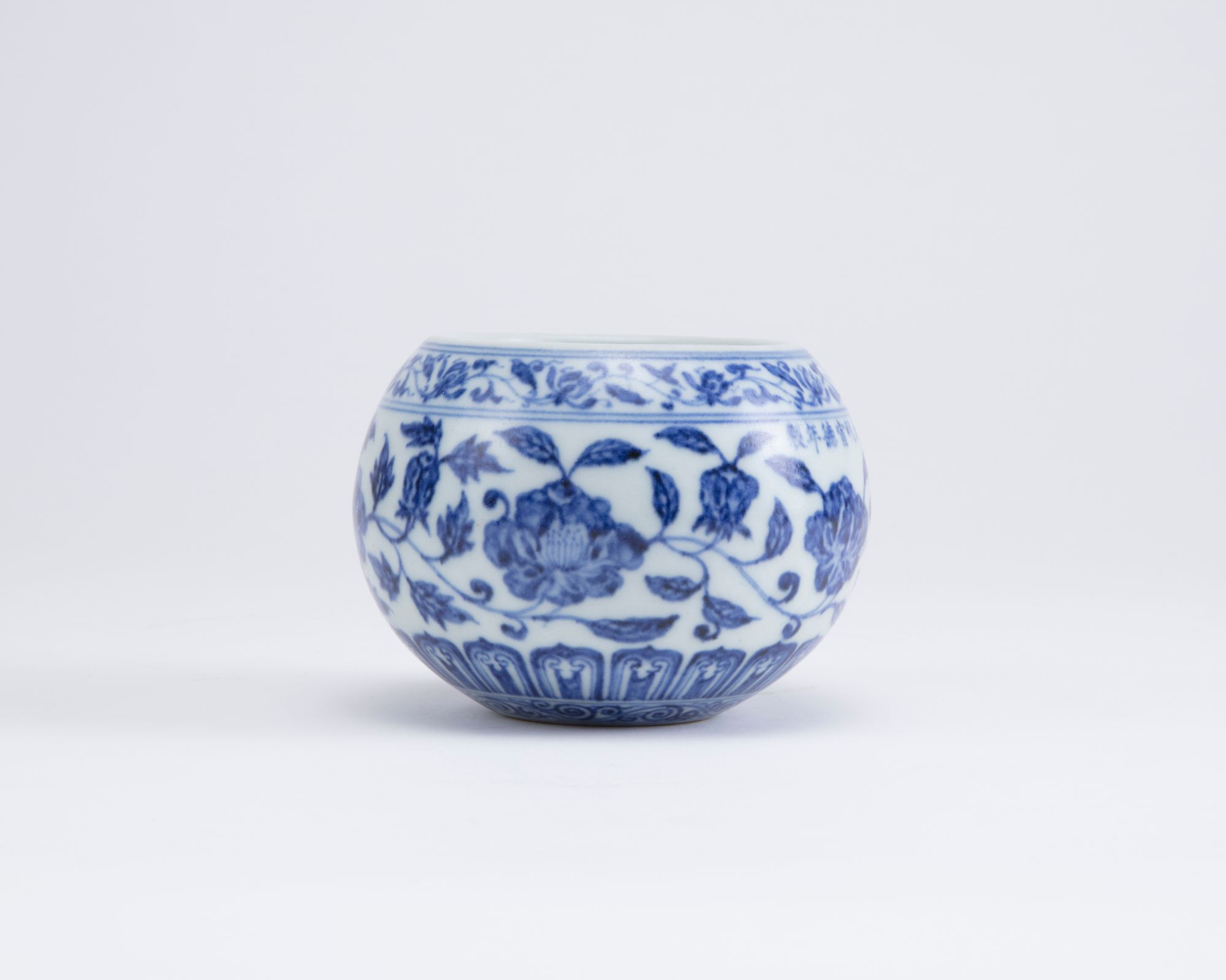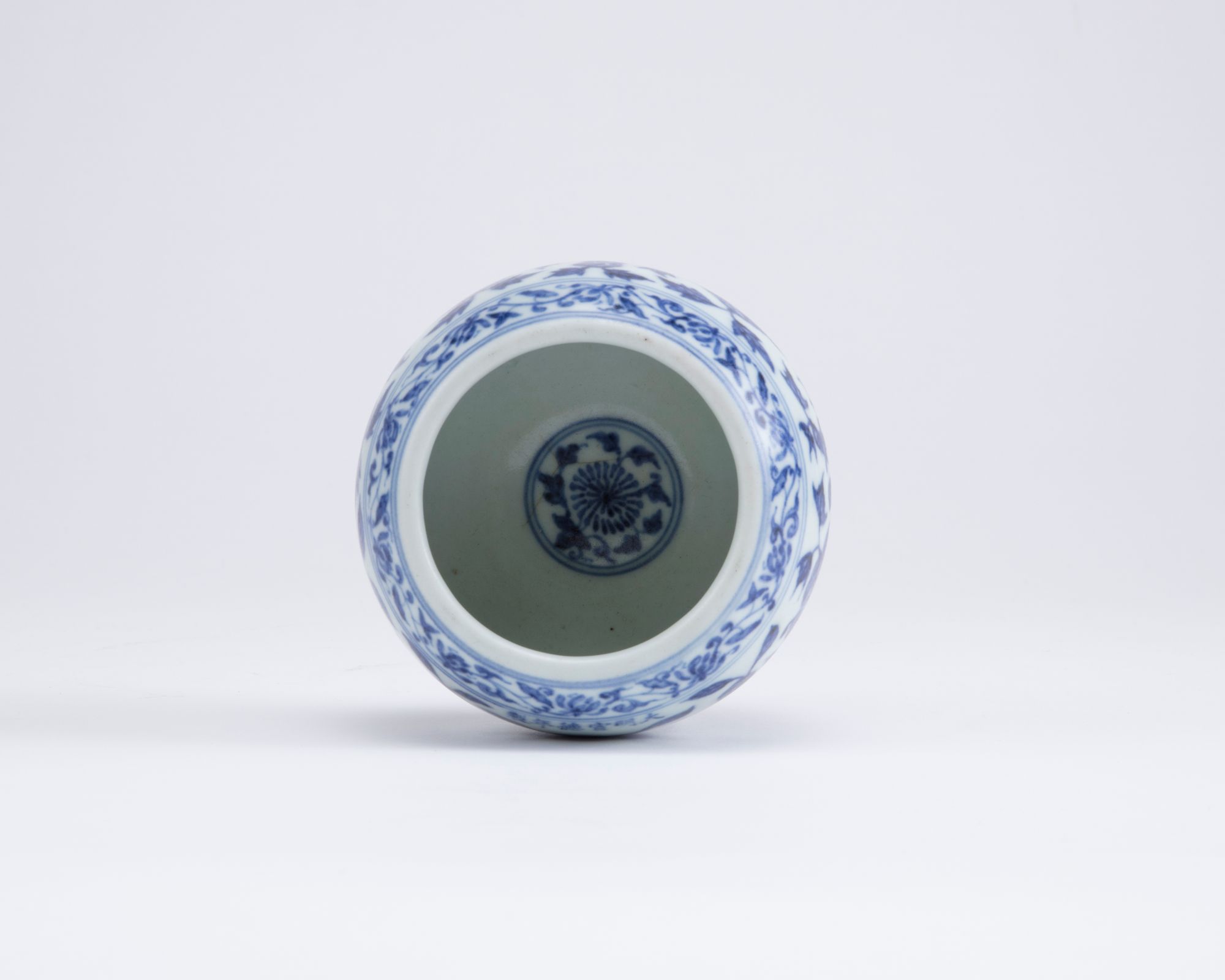 The pot is decorated with flowering scroll, set between a band of foliage scroll and a band of upright leaves. There is an apocryphal Xuande mark just below the rim.