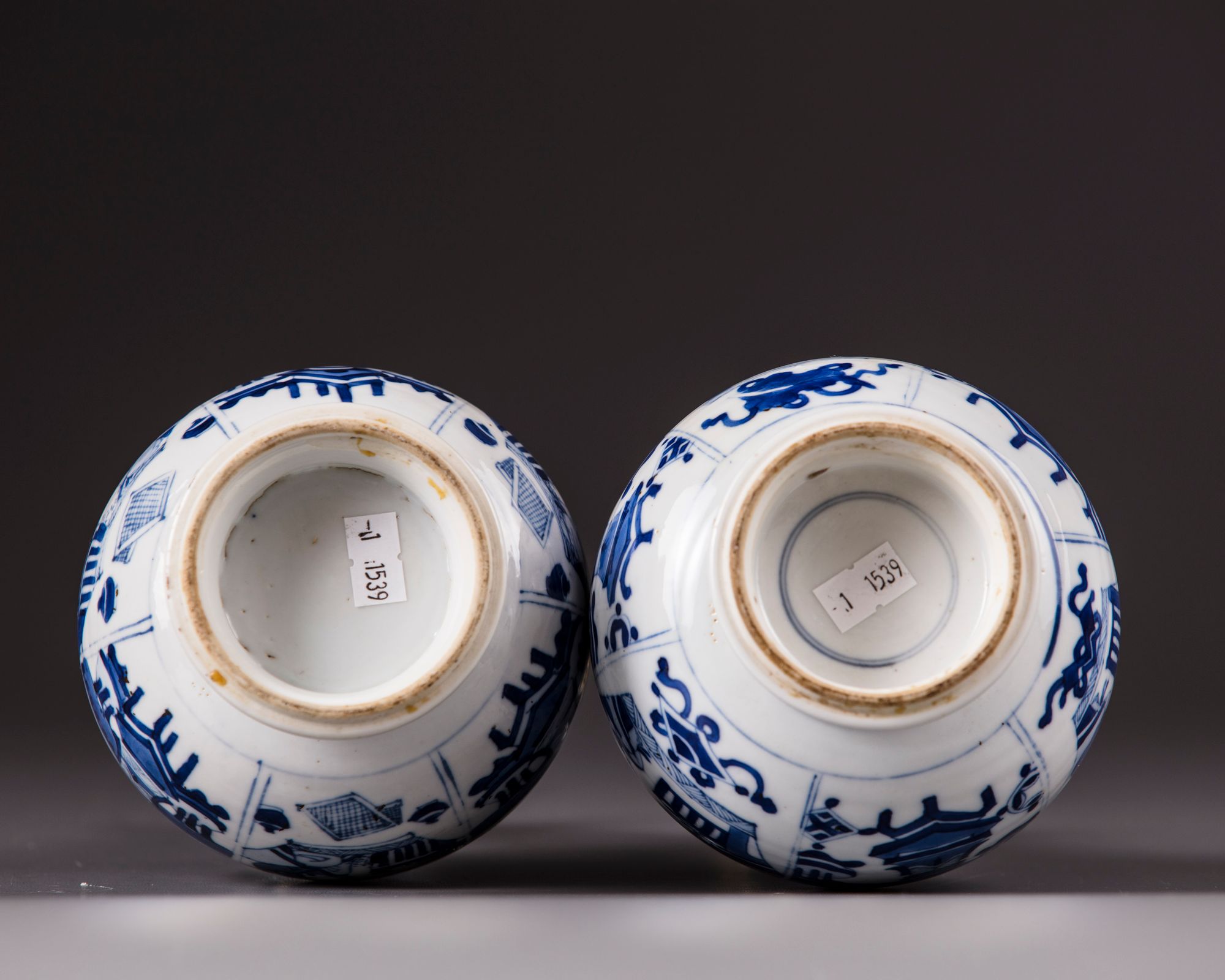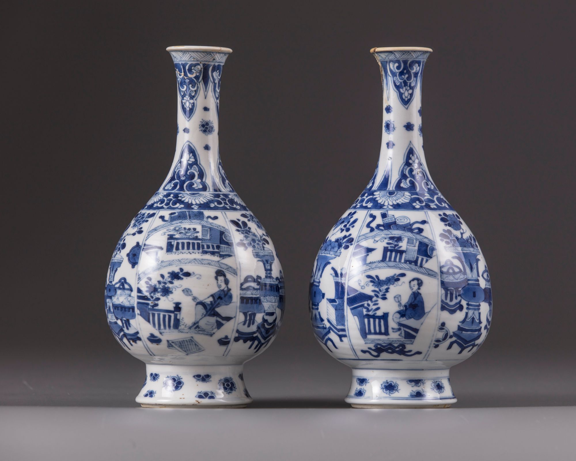 The vases are decorated with panels containing alternating scenes of a lady seated on a terrace and a vase with flowers.
