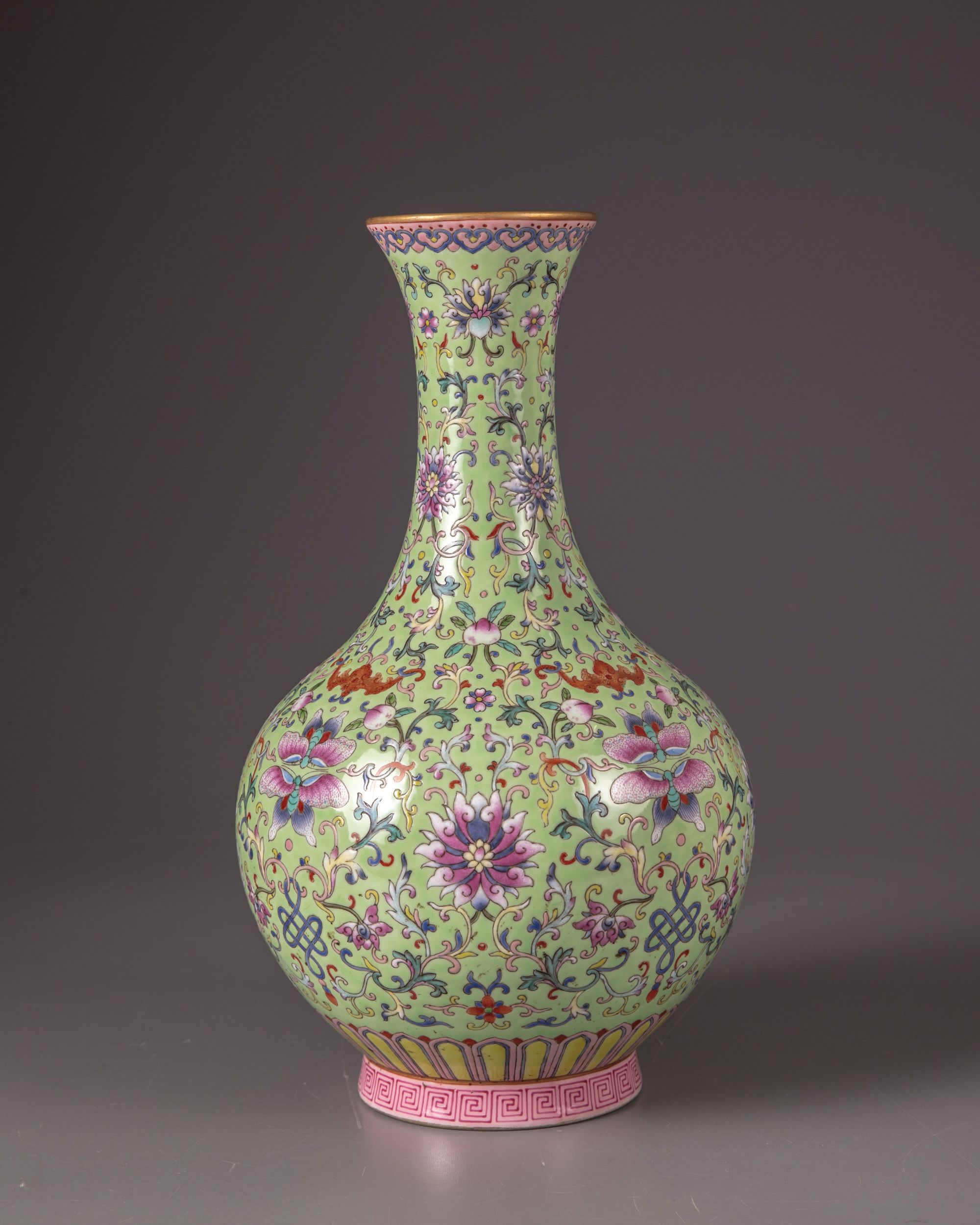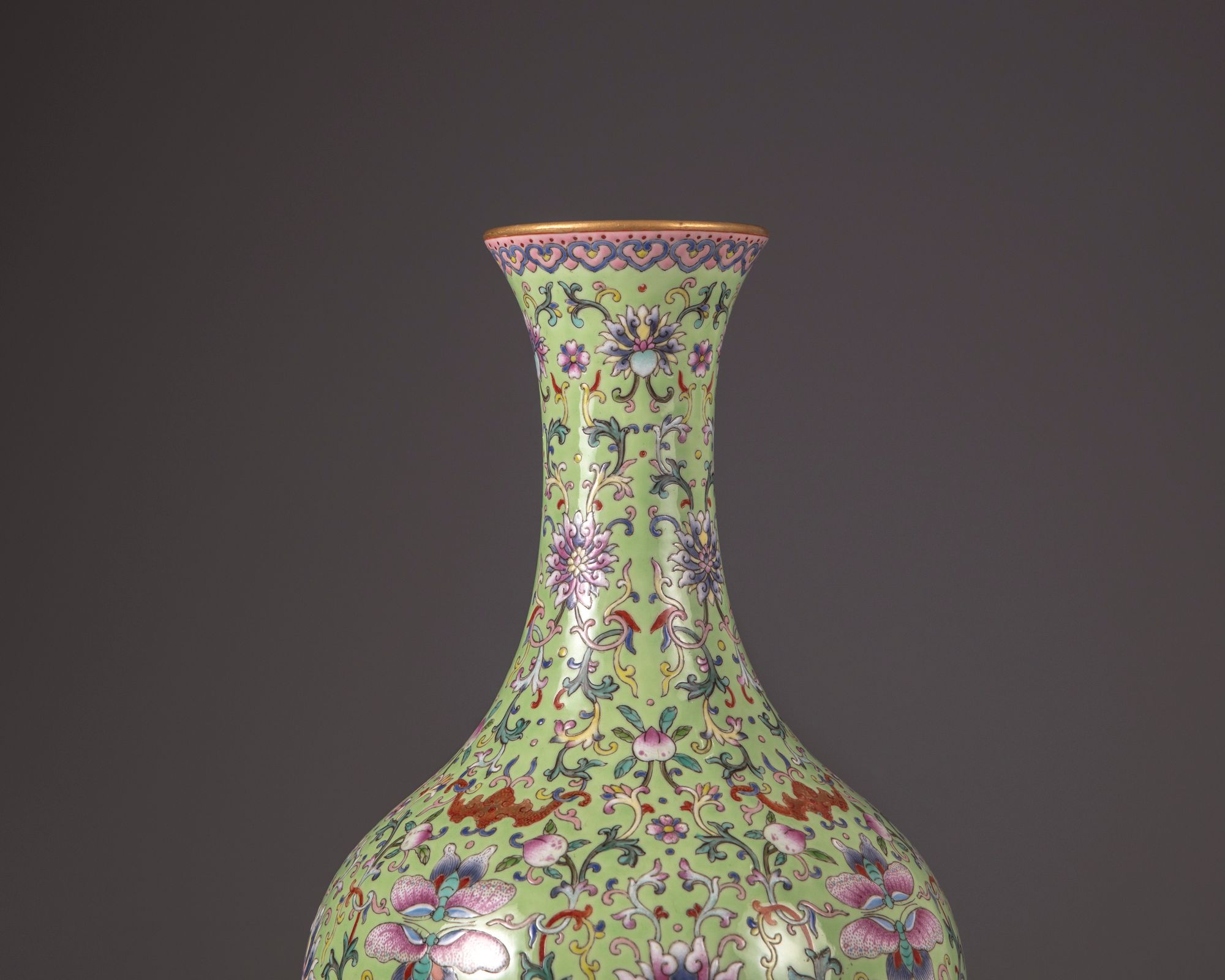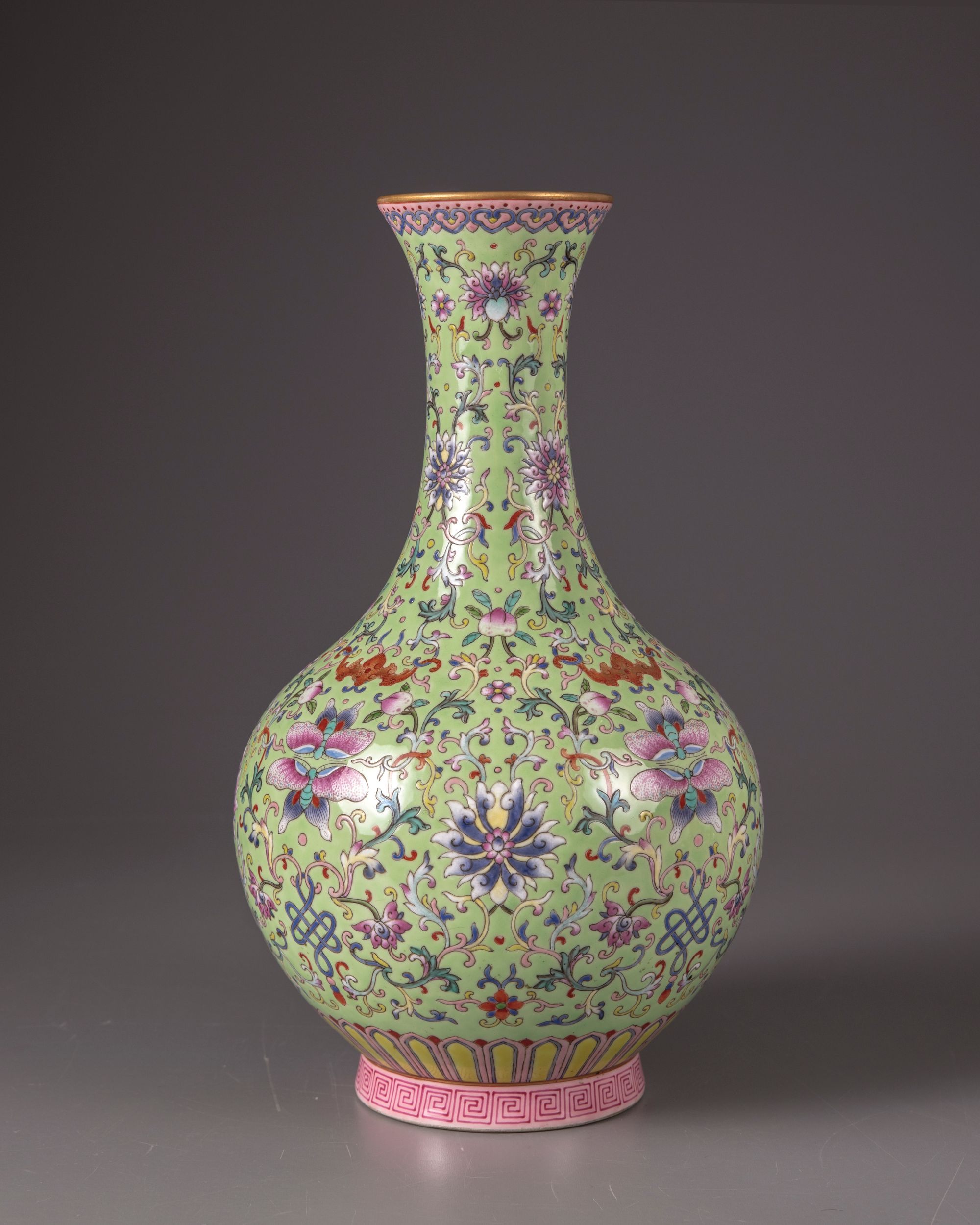The vase is decorated with confronting butterflies and Fu bats intersperd by peach branches, lotus scrolls and foliage on a lime green ground. The rim with a band of Ruyi-heads and a petal lappet border to the base with a key fret chain. With a Qianlong seal mark on a celadon ground.