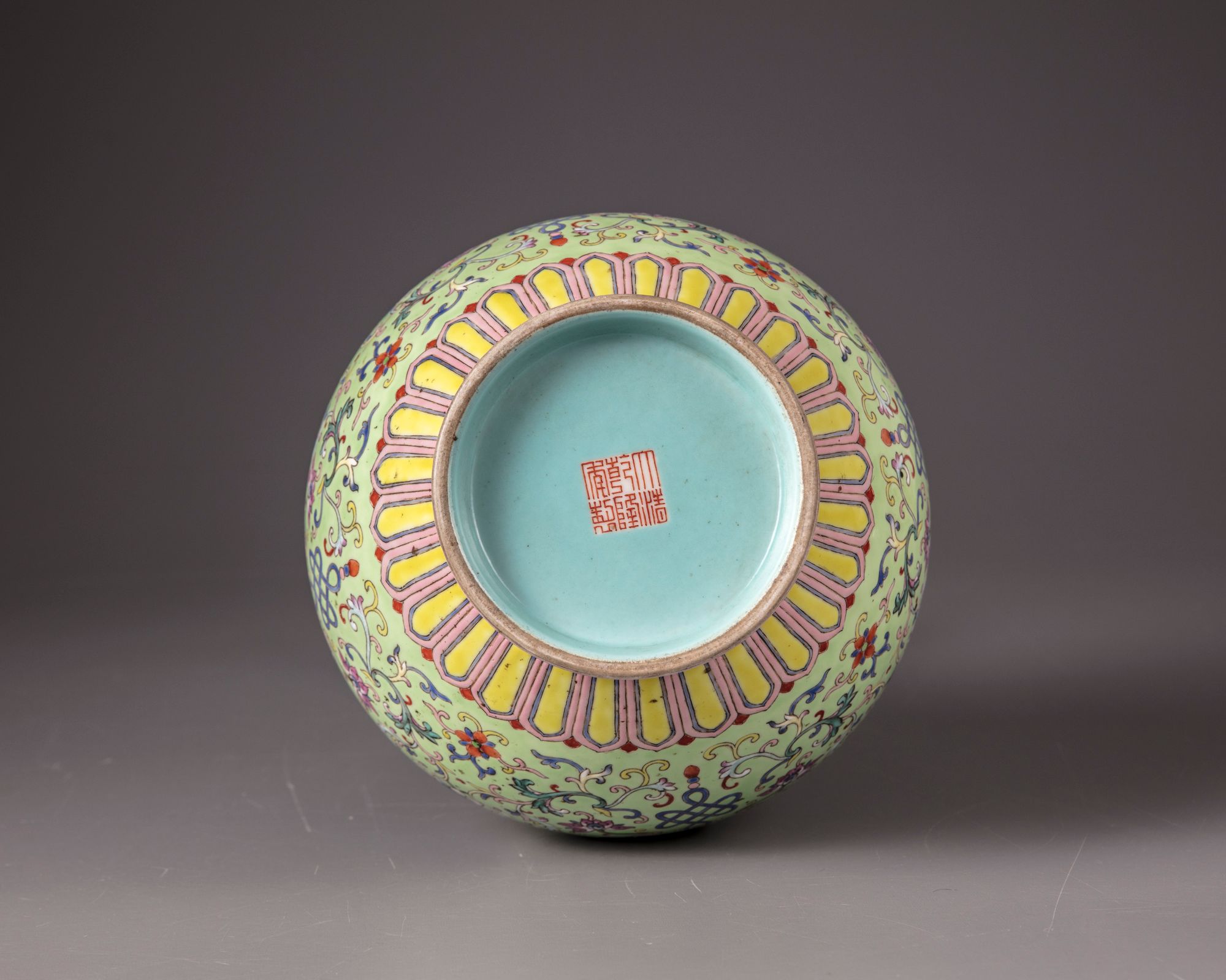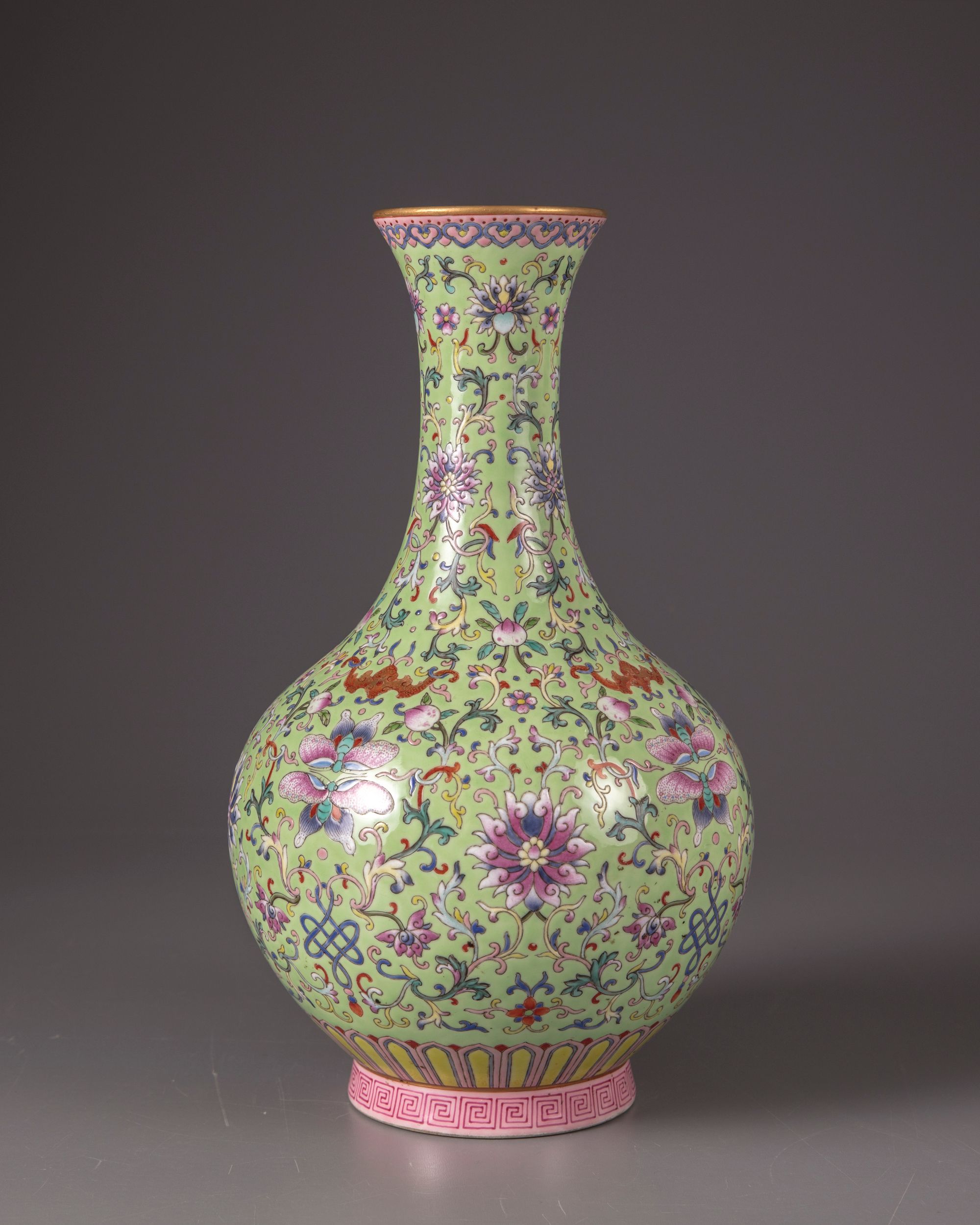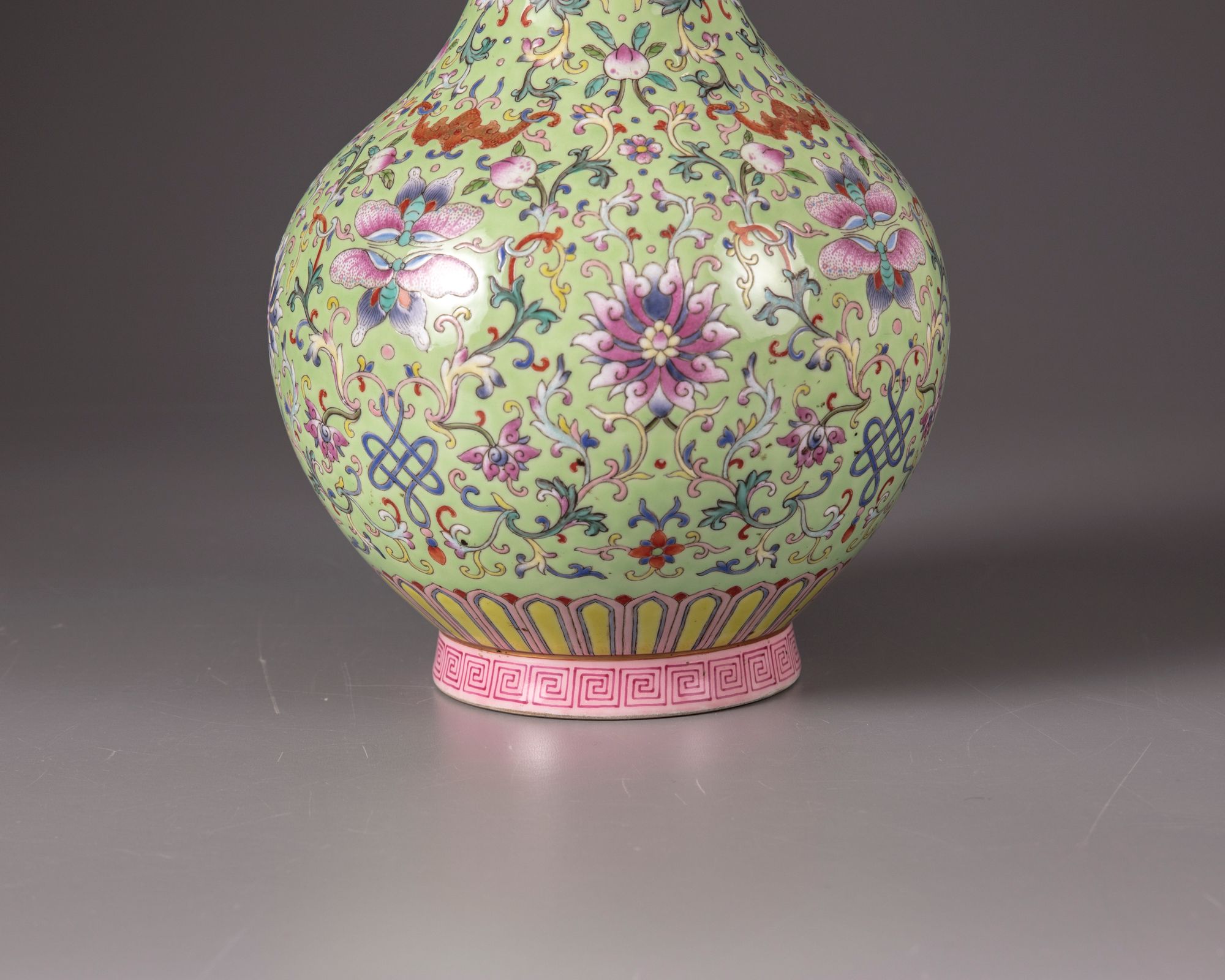 The vase is decorated with confronting butterflies and Fu bats intersperd by peach branches, lotus scrolls and foliage on a lime green ground. The rim with a band of Ruyi-heads and a petal lappet border to the base with a key fret chain. With a Qianlong seal mark on a celadon ground.