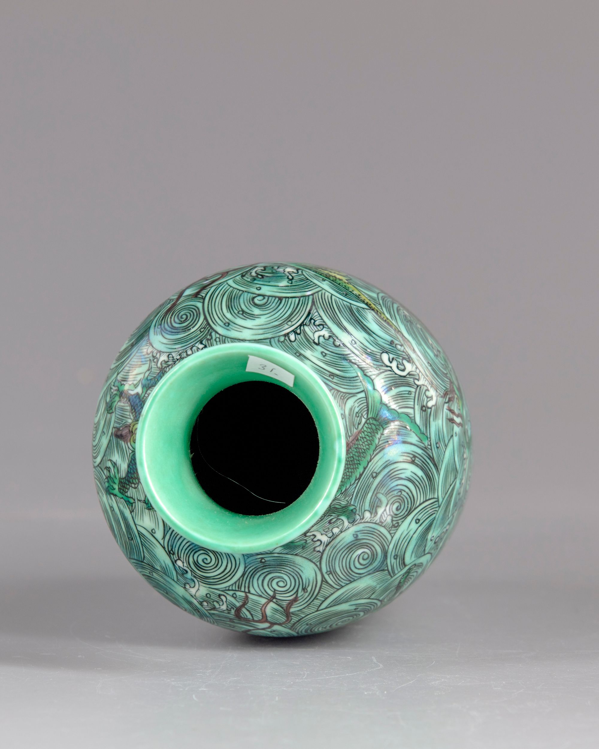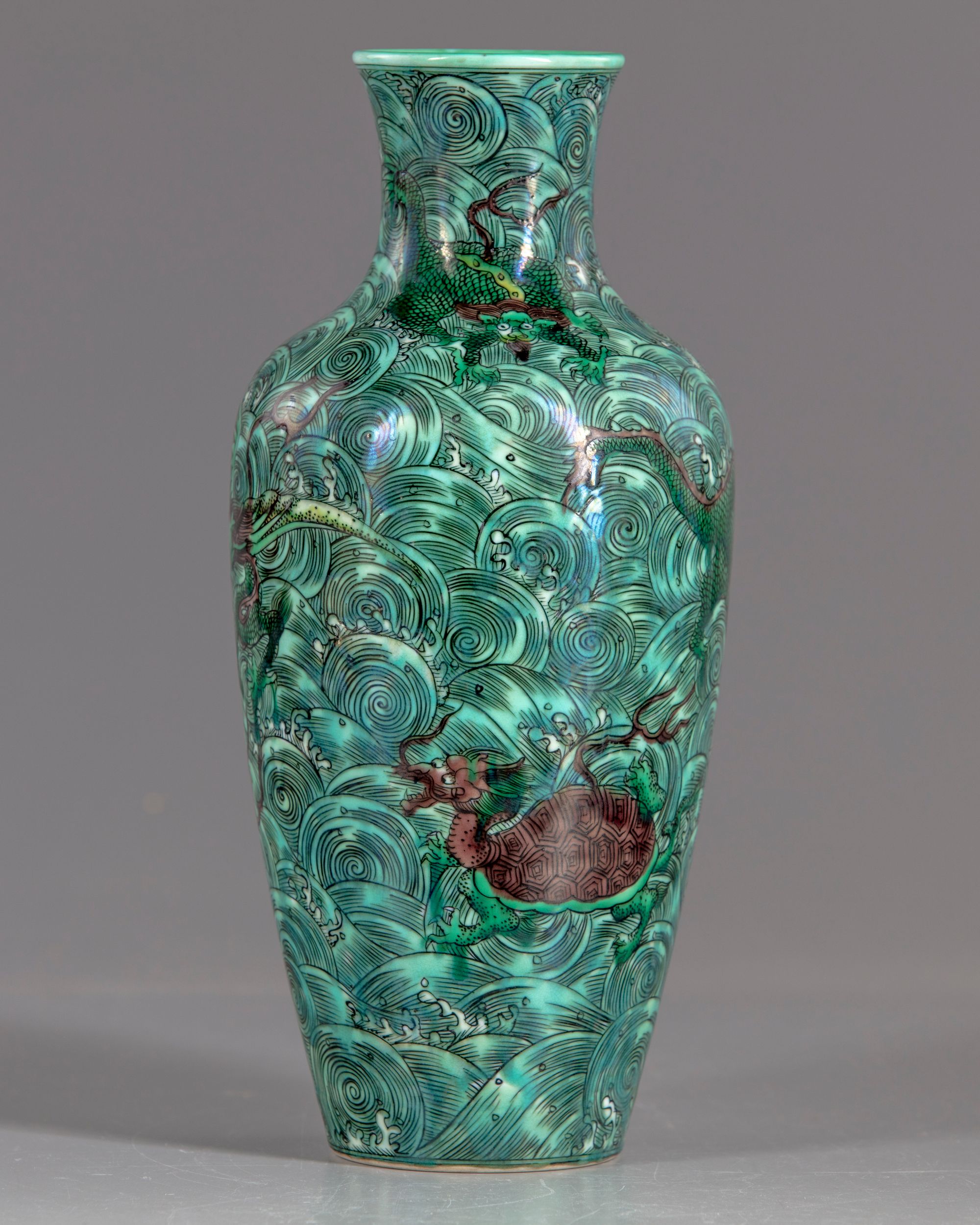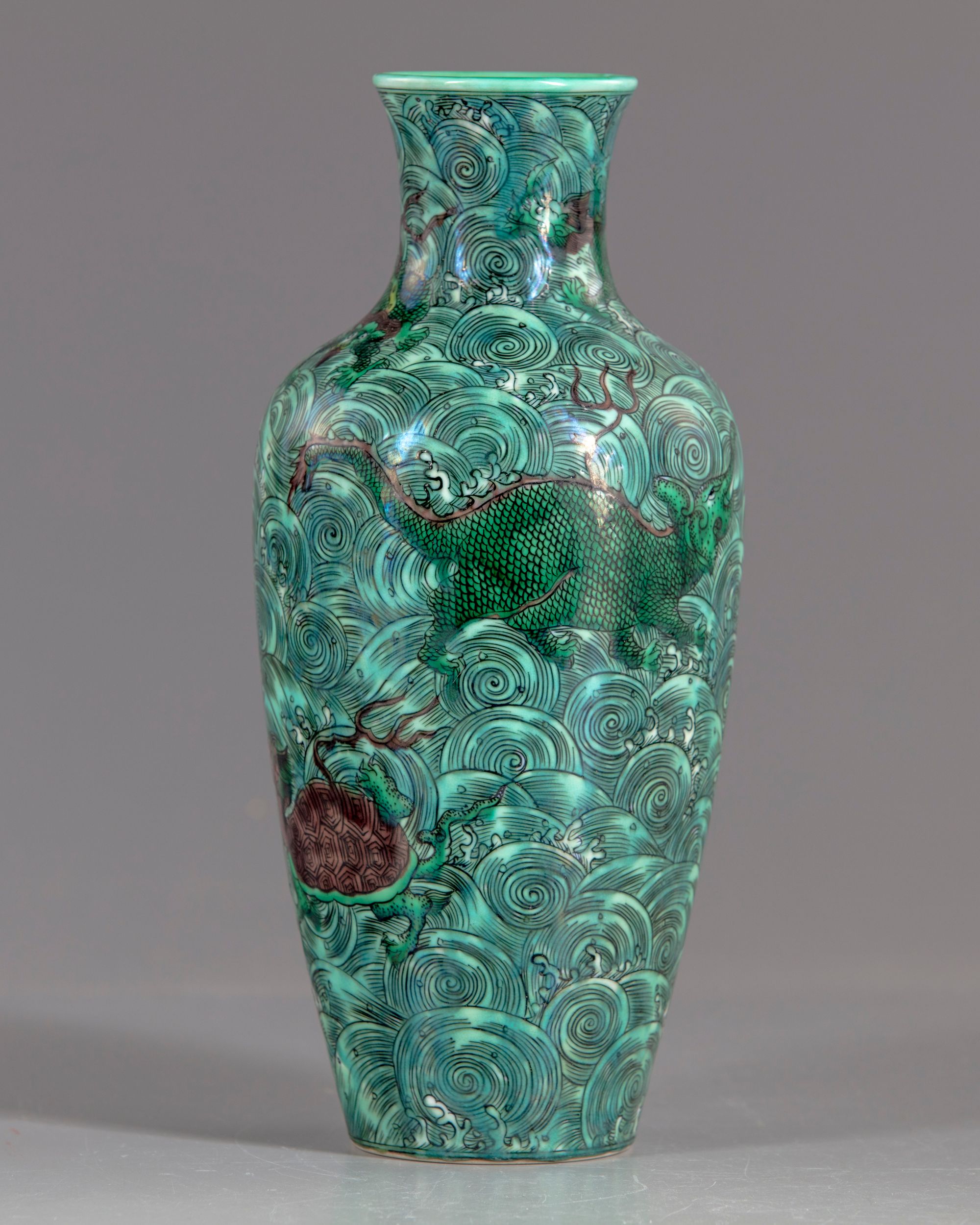 A Chinese porcelain vase, decorated with different shapes of mythical beast, flying dragon, chilong dragons and fish. All on a ground of sea waves.