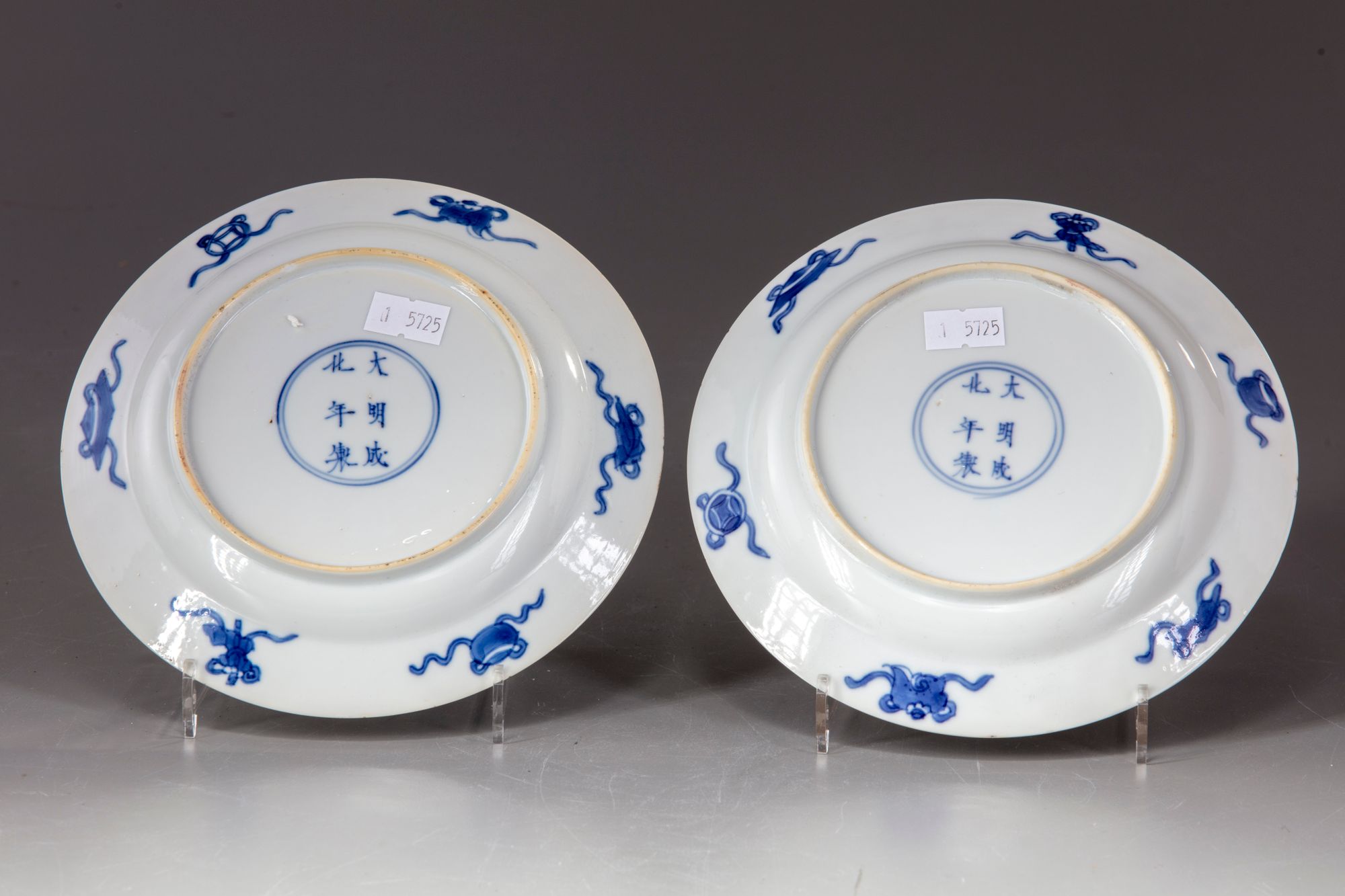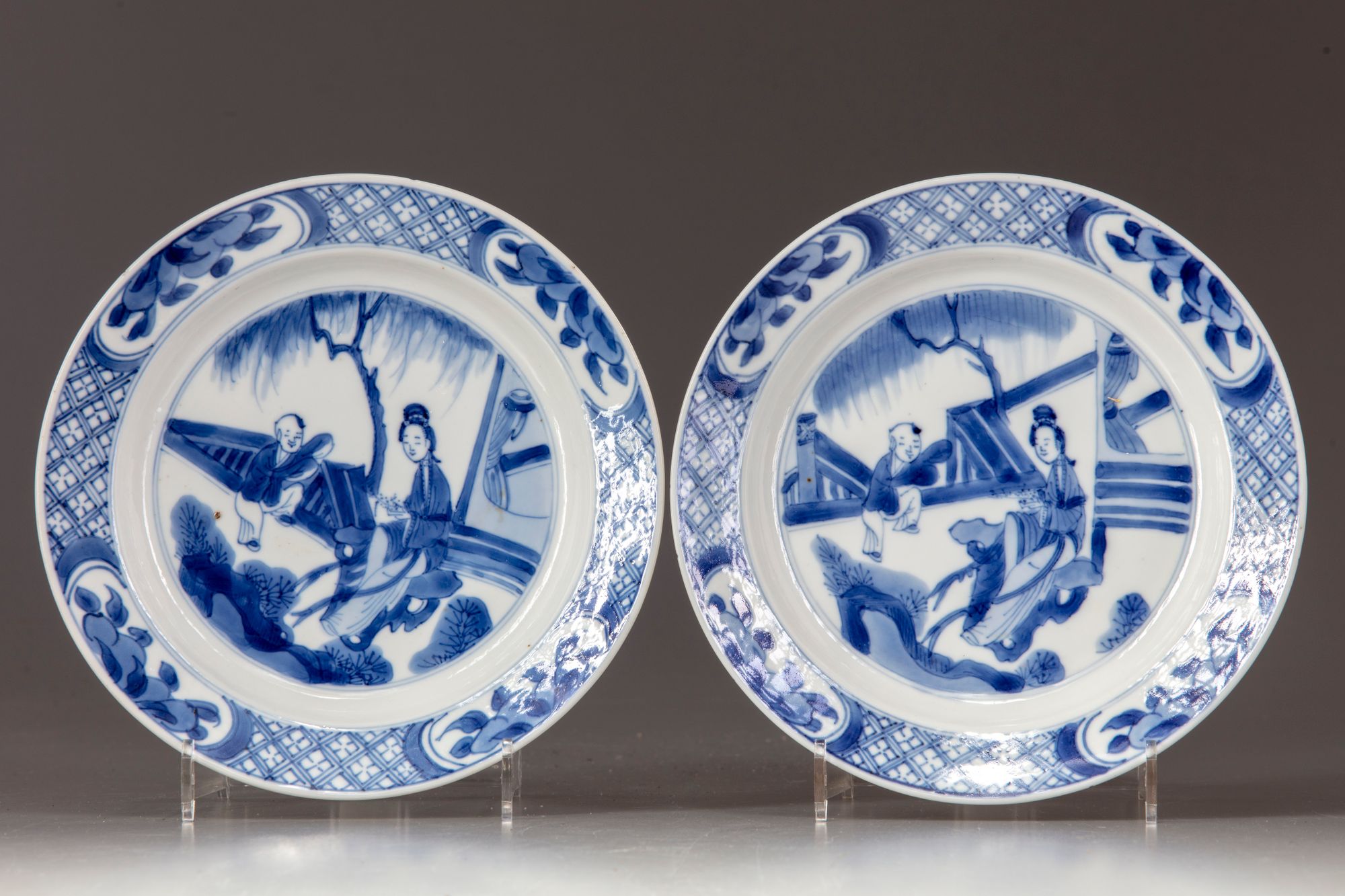 Two Chinese porcelain dishes, decorated to the centre with an elegant lady and a boy at play" long Liza and zotje", seated in a fenced garden. To the sides with a diaper band containing cartouches enclosing peaches.To the exterior with "The eight Buddhist emblems" and a Chinese Chenghua six character mark within a double circle.