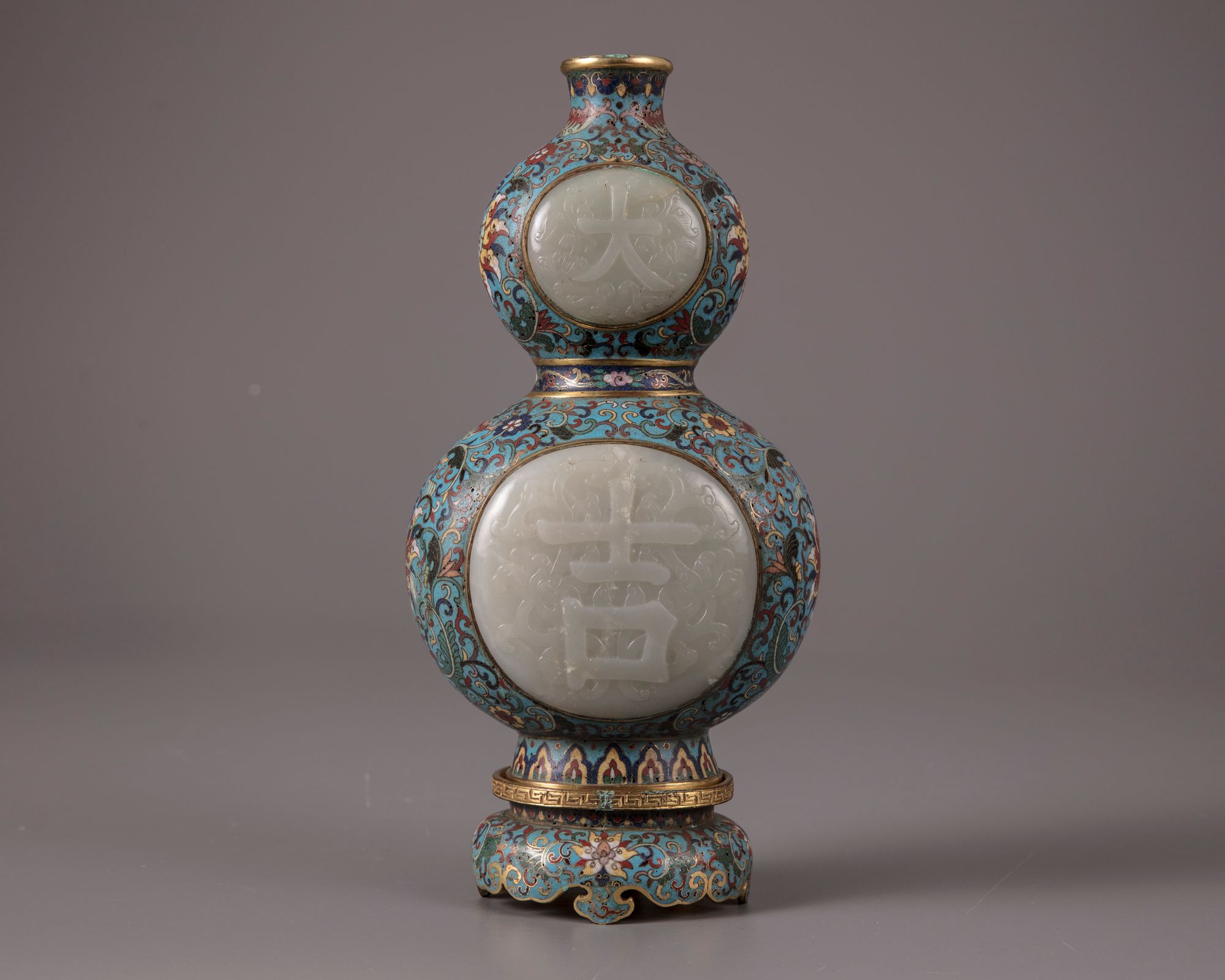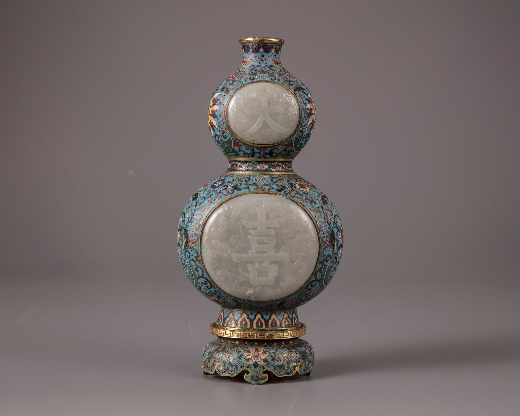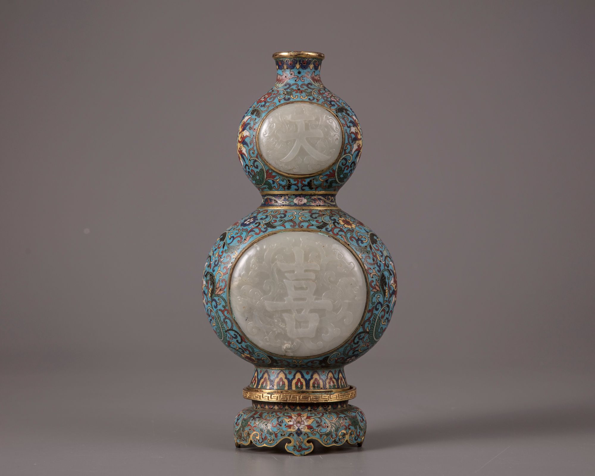 The double gourd vase is inlaid to each side with a larger and a smaller white jade panel each carved with the character 'da' and 'ji' which may be translated as 'great fortune'. The panels are set on a cloisonne enamel ground with lotus scrolls. The vase stands on a similarly decorated stand supported on ruyi-shaped feet.