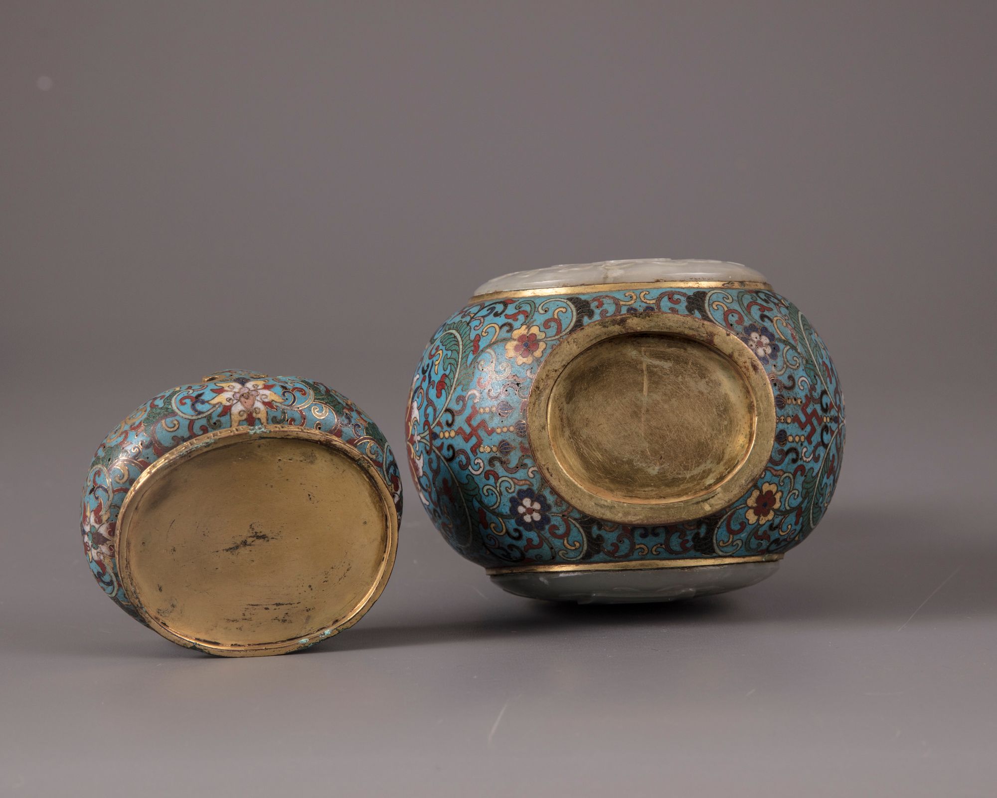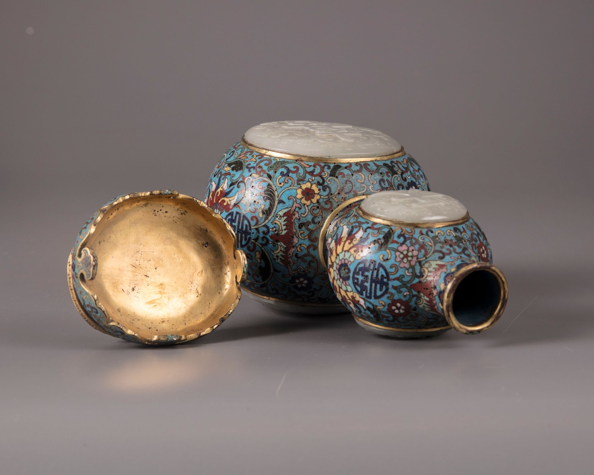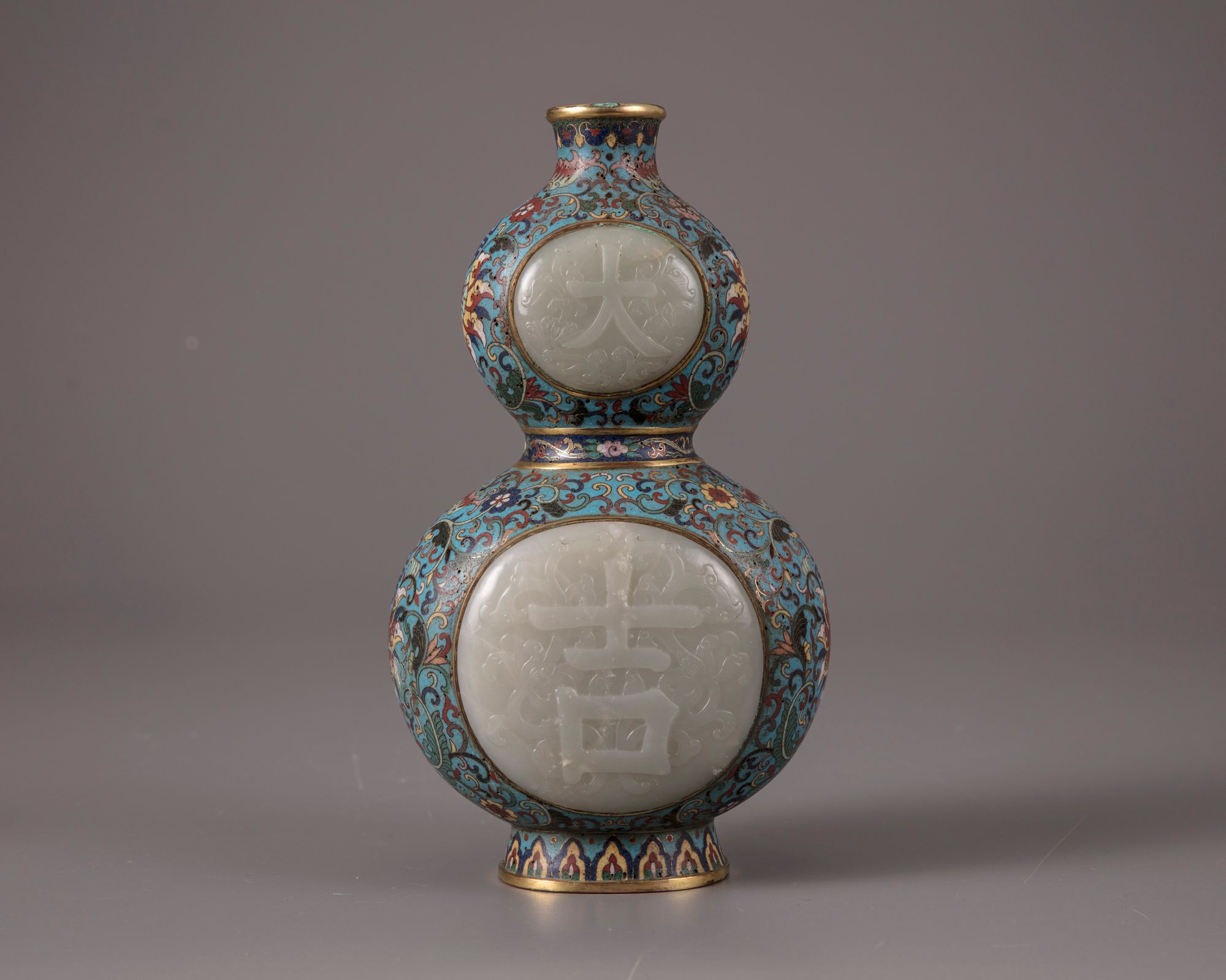 The double gourd vase is inlaid to each side with a larger and a smaller white jade panel each carved with the character 'da' and 'ji' which may be translated as 'great fortune'. The panels are set on a cloisonne enamel ground with lotus scrolls. The vase stands on a similarly decorated stand supported on ruyi-shaped feet.