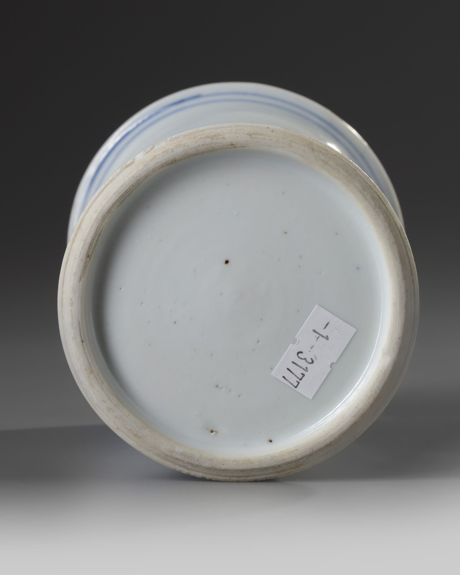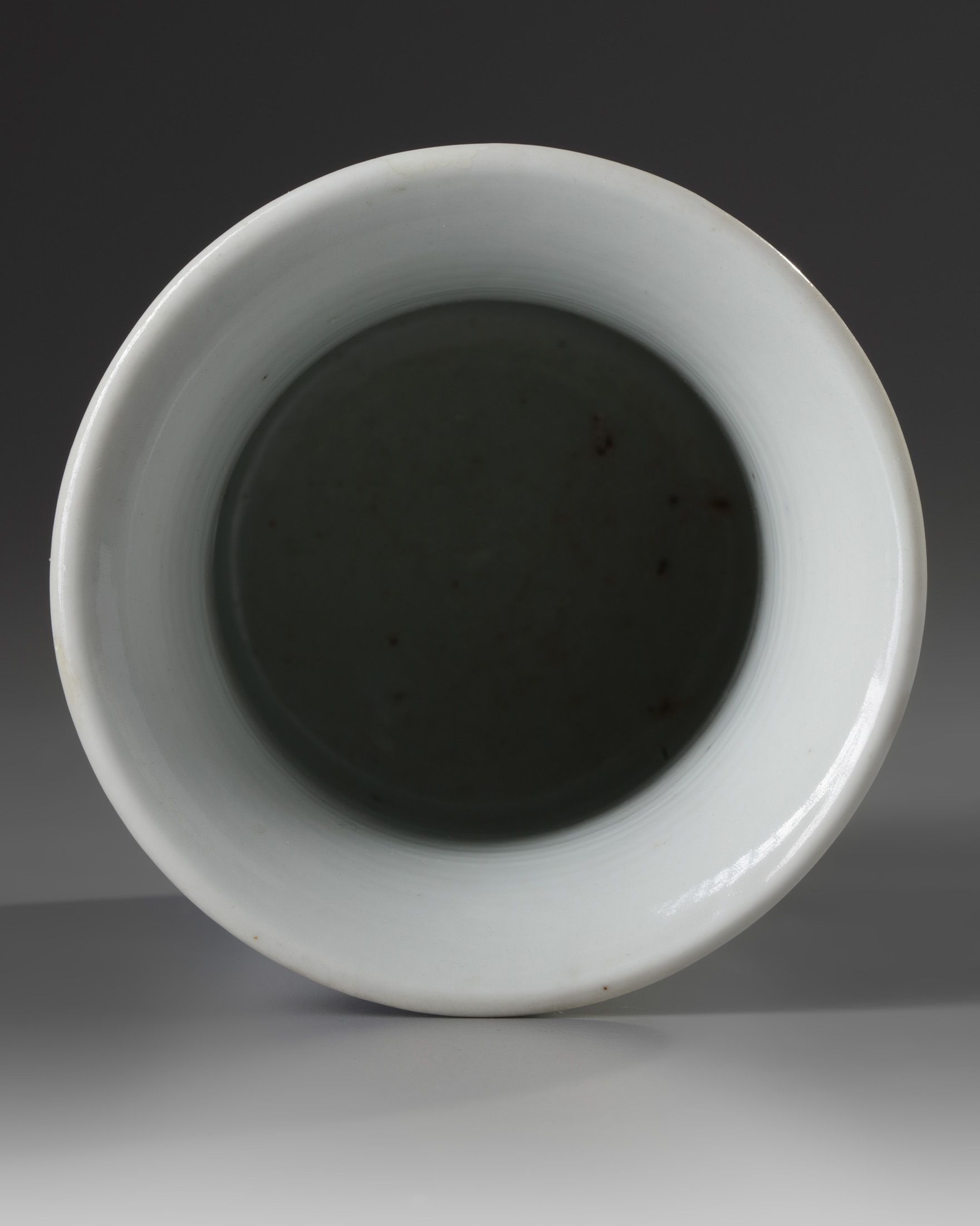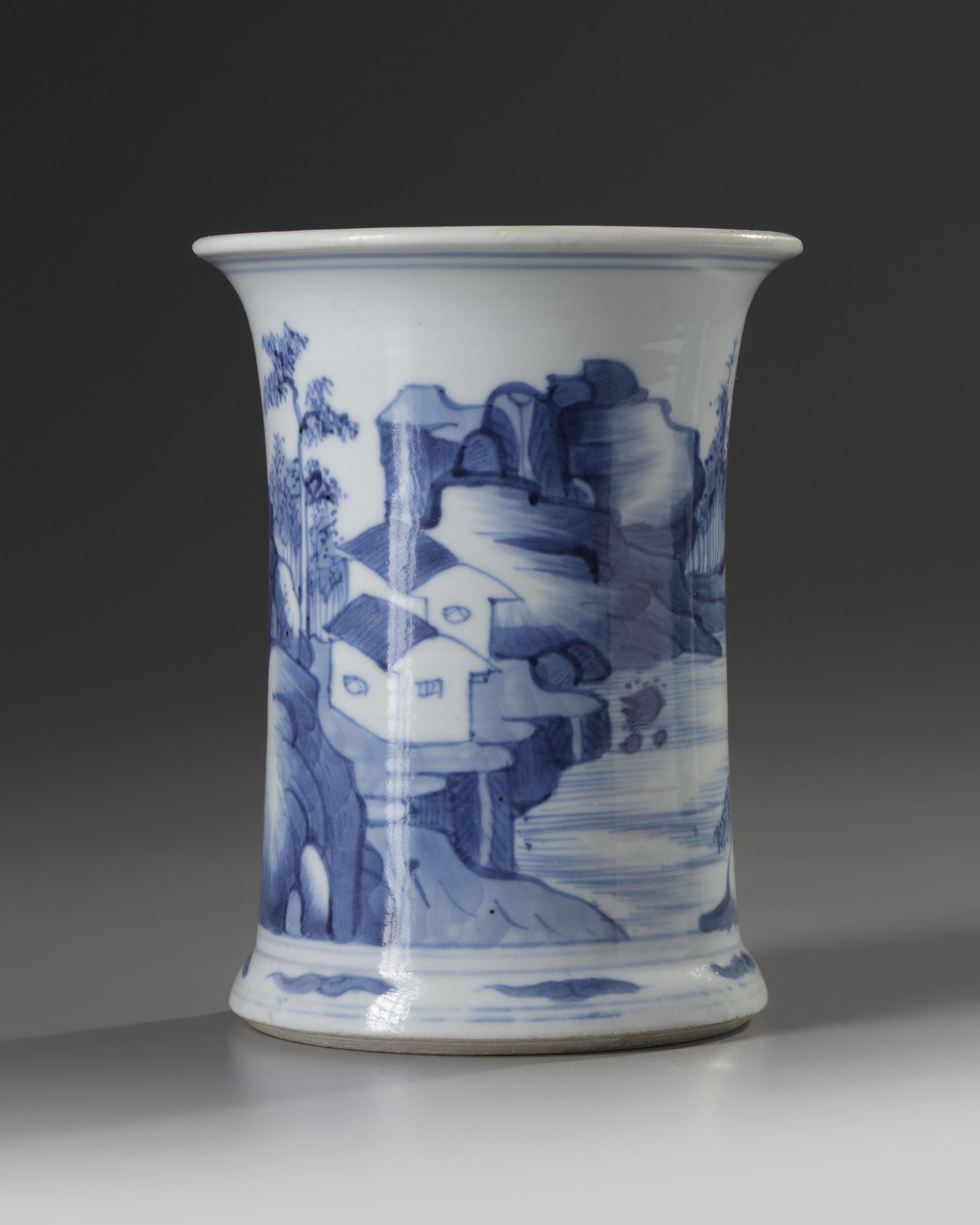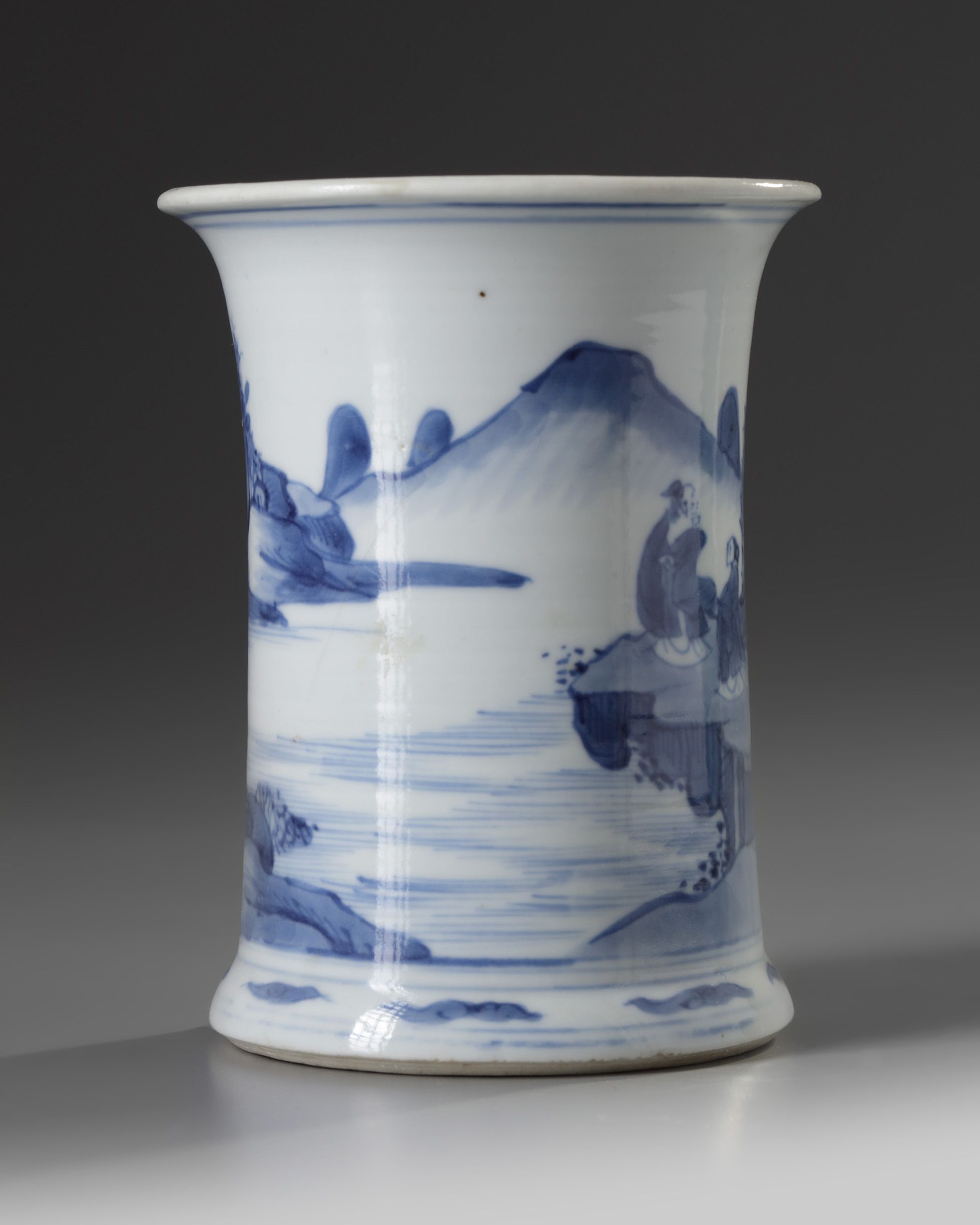 The short trumpet-shaped vvessel with a stepped foot and flaring rim is decorated with two scholars on a river’s edge amongst, trees, houses, and rocks. The foot is decorated with a band of cloud scrolls.