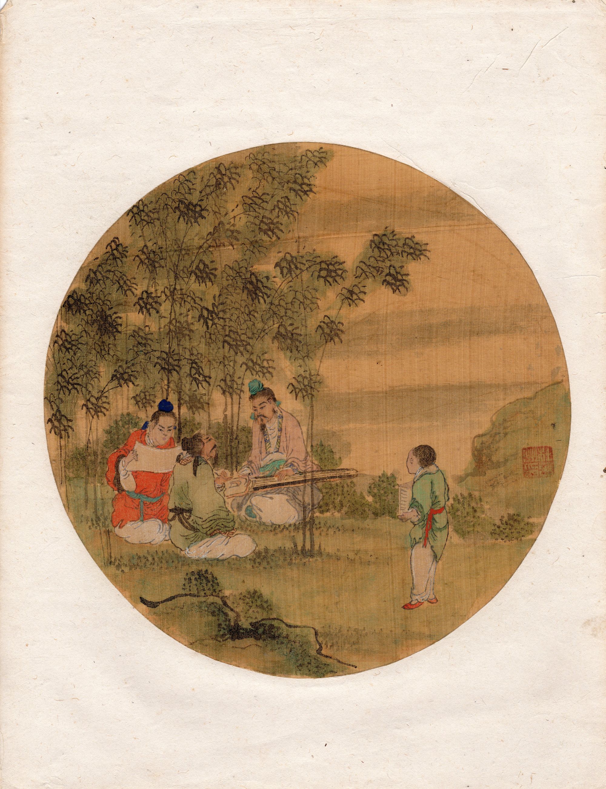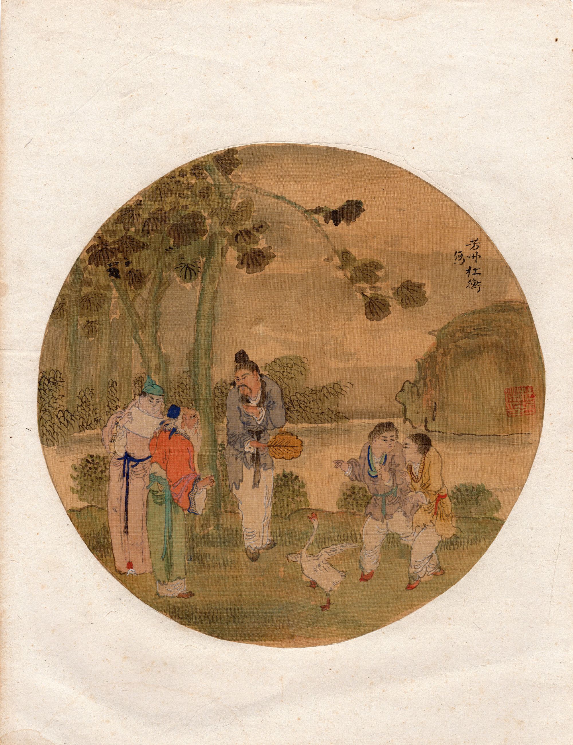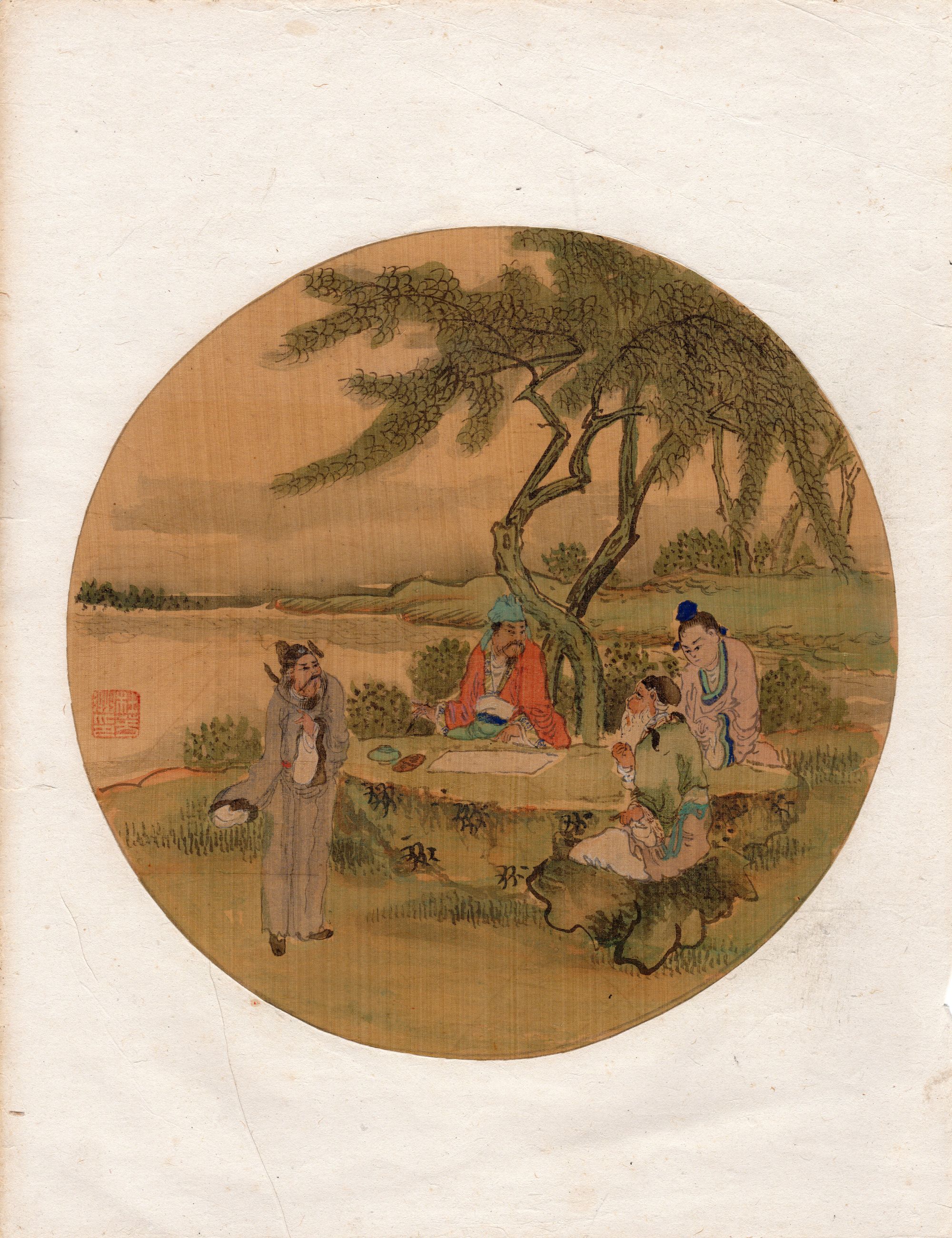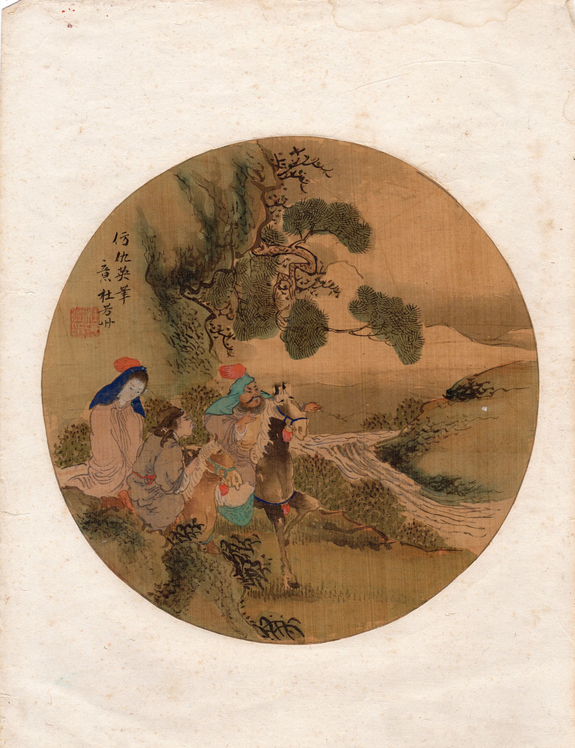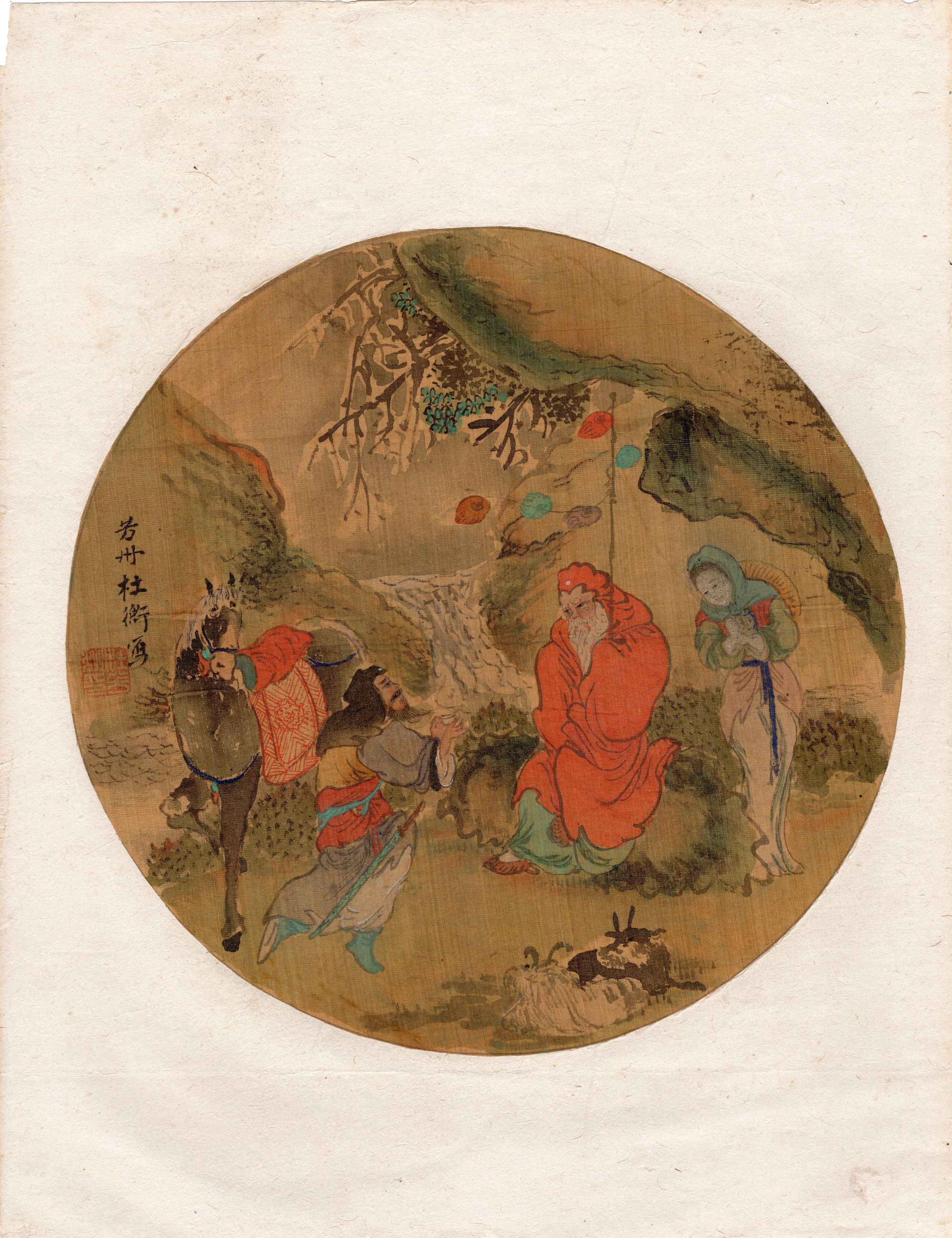 Ink and colour on silk. Album leaves mounted on paper. Each painting depicts scholars, monks, ladies and boys in various landscapes. One painting is signed in Du Fangzhou in imitation of Qiu Ying (a Ming dynasty artist), some paintings are variously signed by the artist, each painting with a seal reading 'Du Fangzhou yin'.