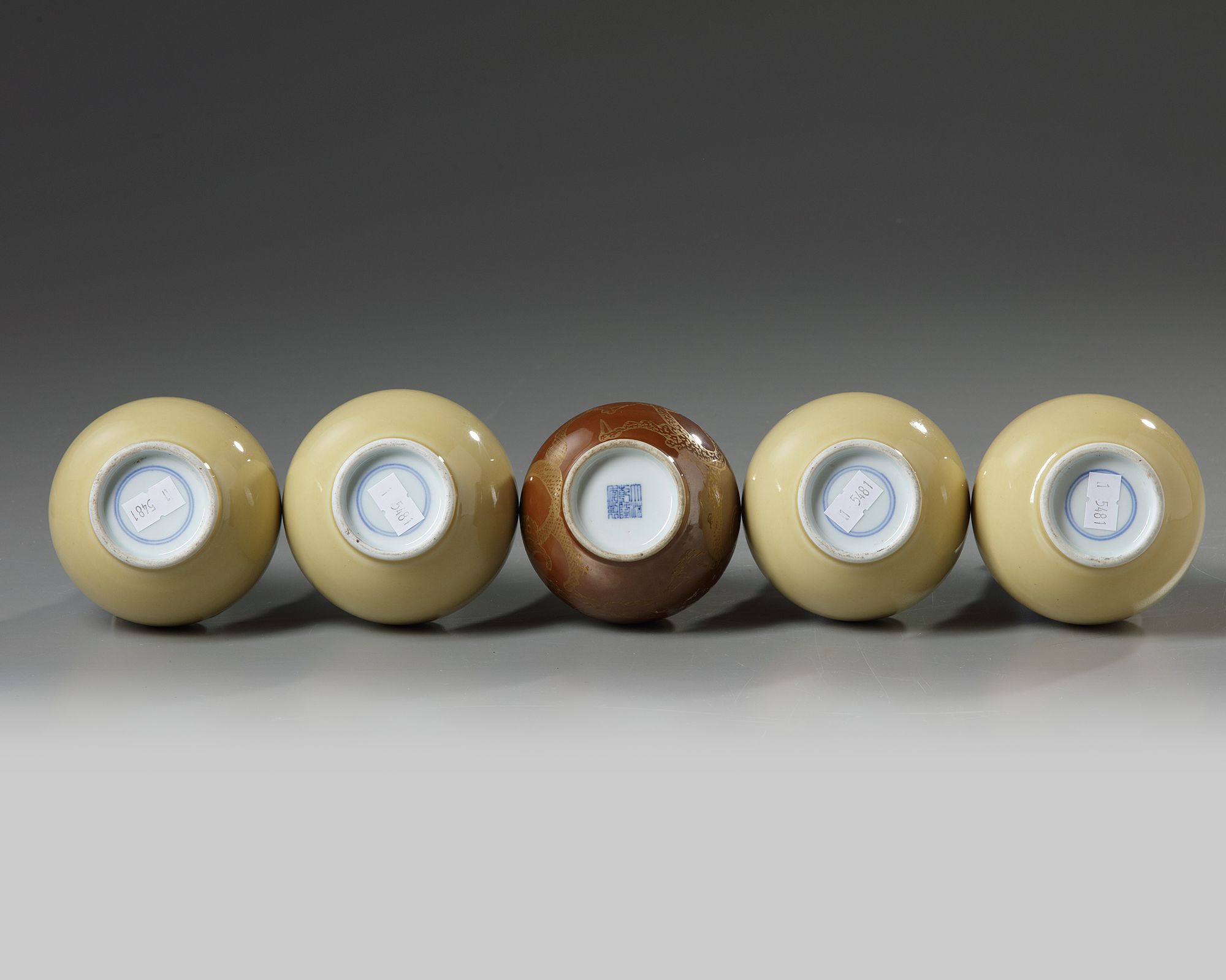 Four blue and white and cafe au lait vases, each is decorated to the bulbous upper section with foliate cartouches enclosing flowers, rising to a slender neck with flower sprays. The globular body is covered with a café au lait glaze. The fifth vase is decorated with a gilt dragon around the body and the neck on a brown glazed ground, with a Qianong seal mark. The café au lait vases 17.00 cm high. The other vase 14.00 cm. high.