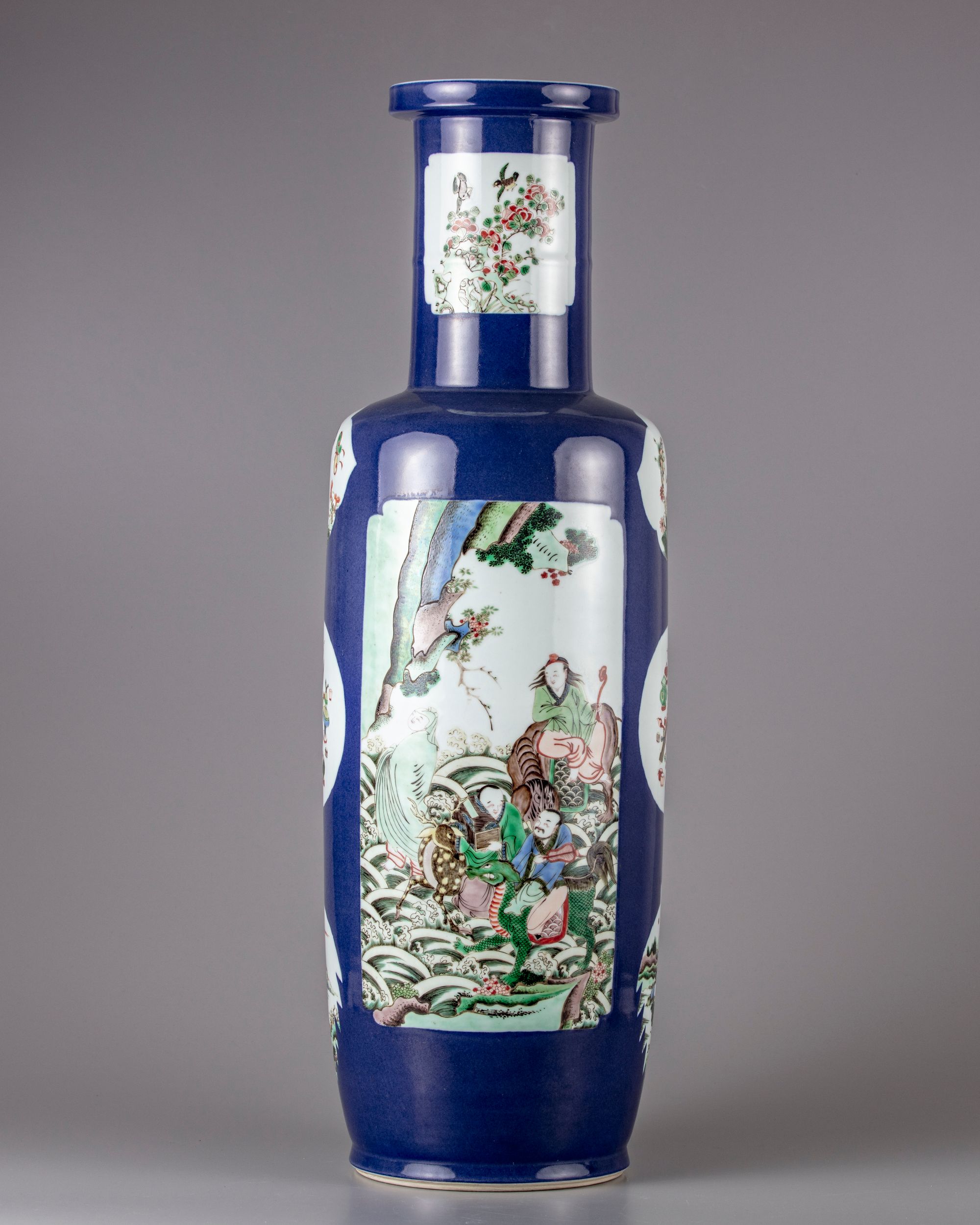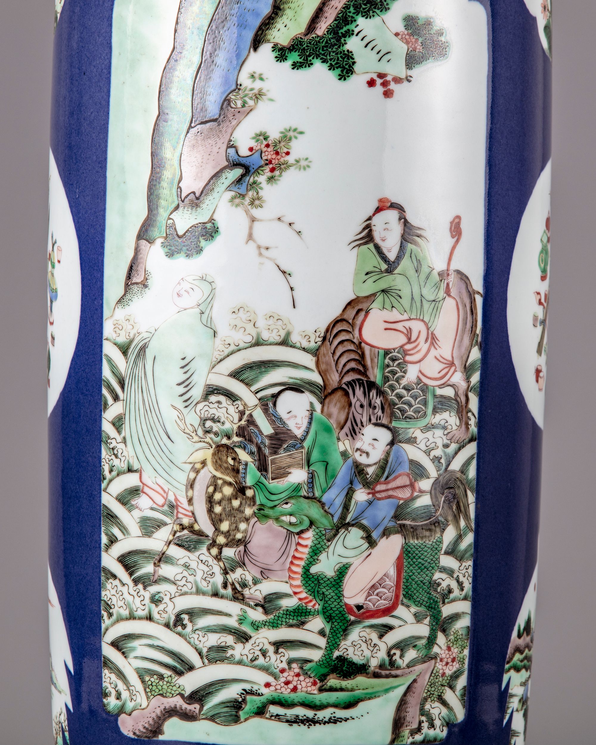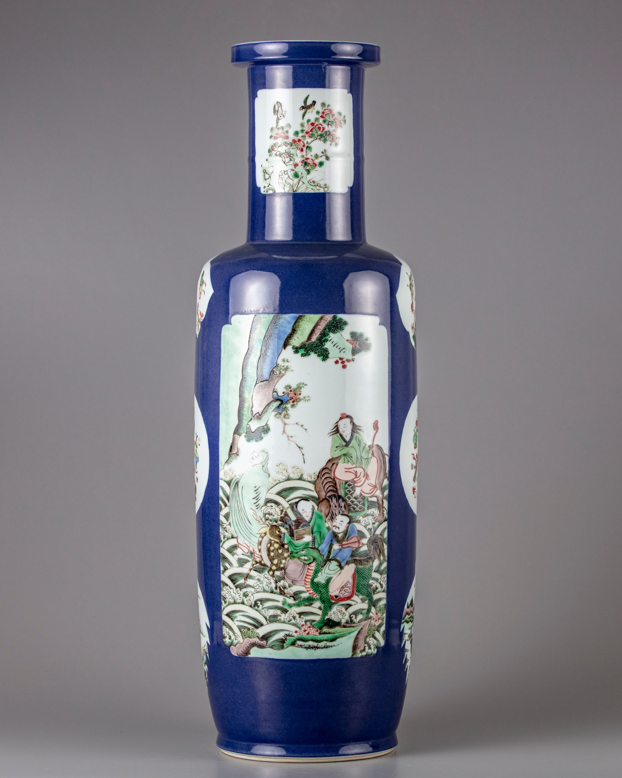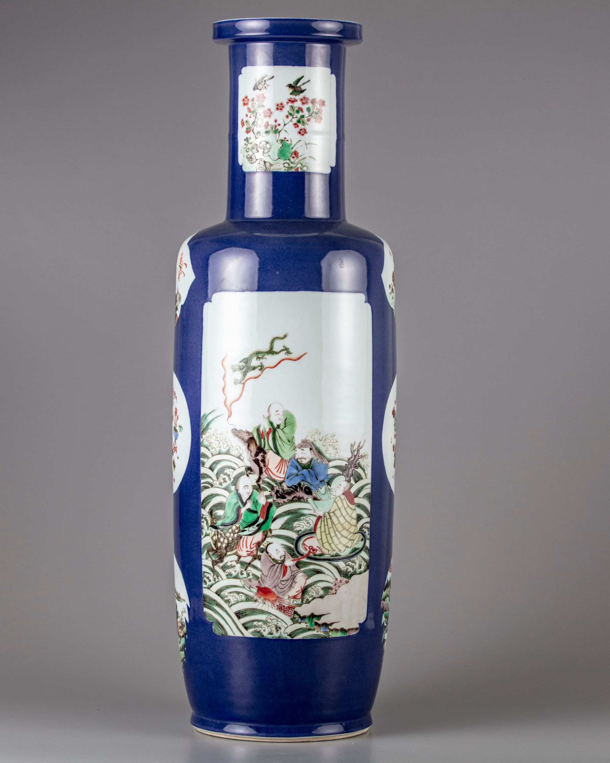 The rouleau vase is decorated to the body with two large rectangular panels enclosing immortals in a landscape, Further painted with two quatrefoil panels with butterflies at flight above flower sprays, two circular panels with precious objects and two artichoke shaped panels with a landscape.The neck is decorated with two square panels enclosing two birds at flight above flower sprays.The bottom with a Kangxi six character mark.