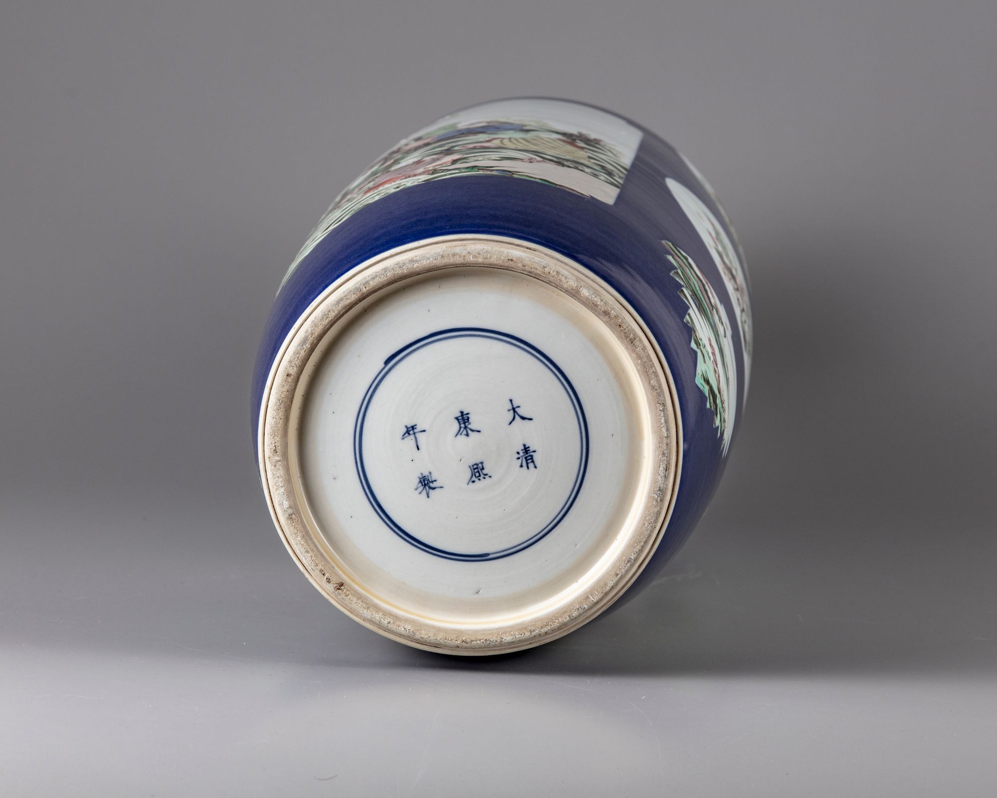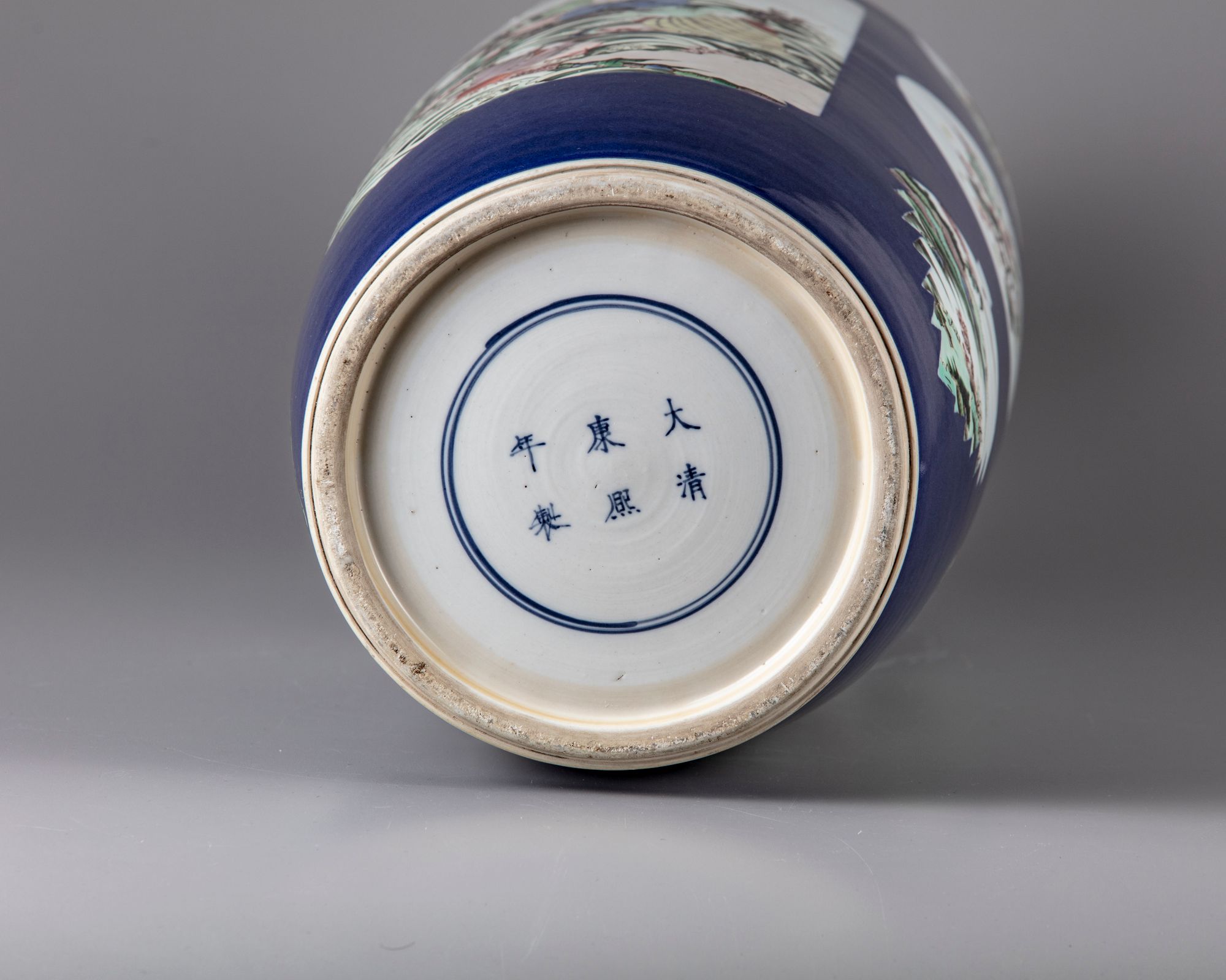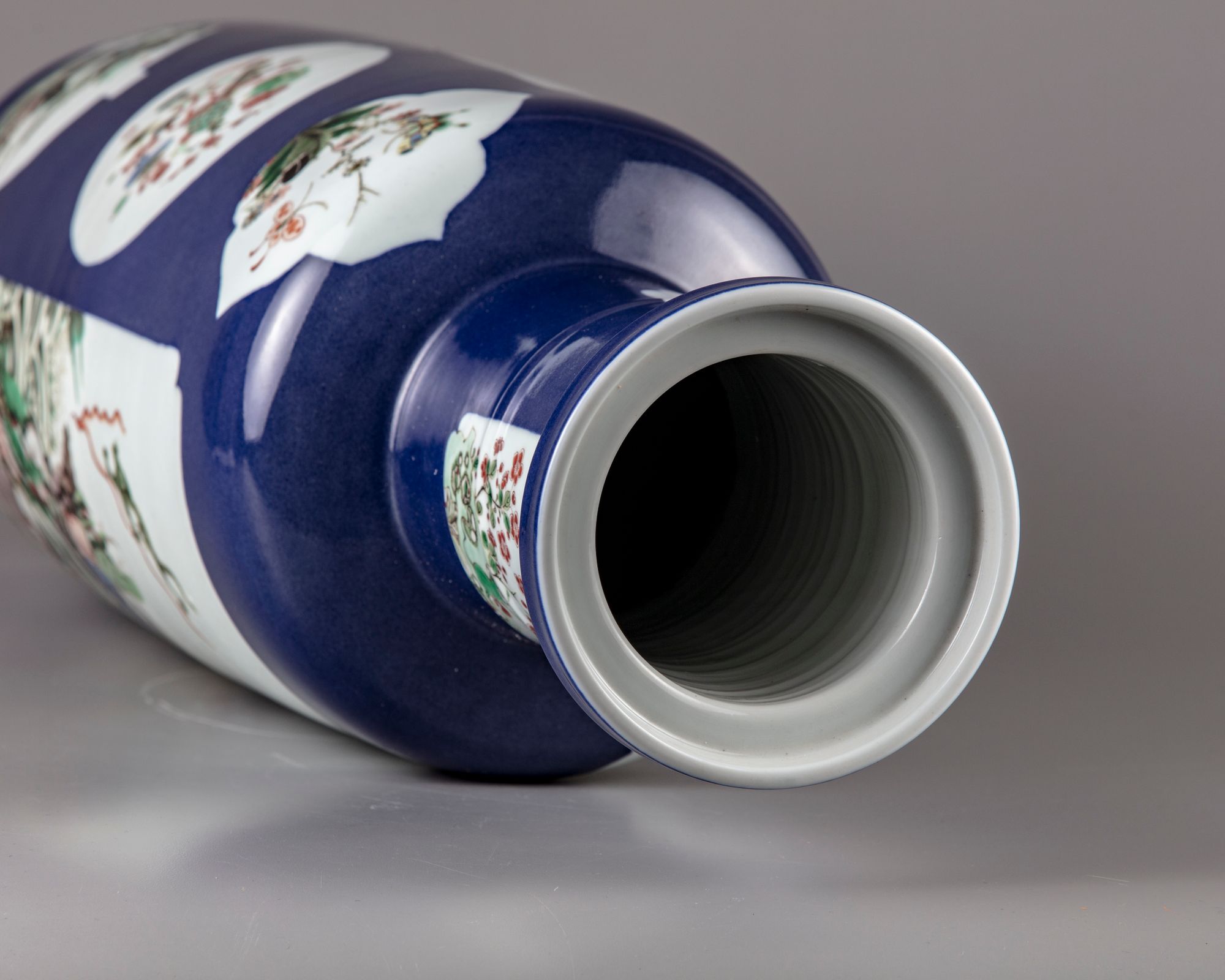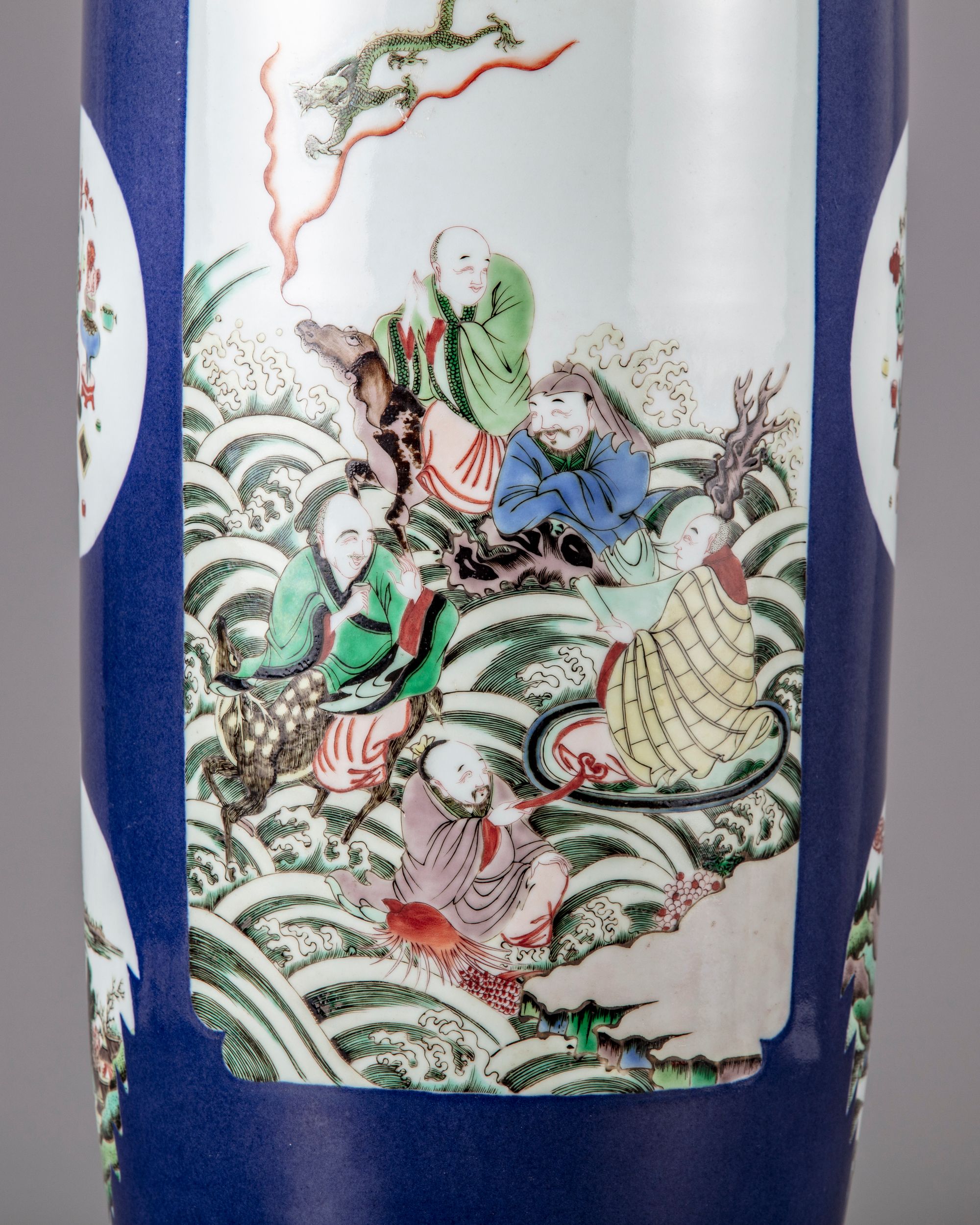 The rouleau vase is decorated to the body with two large rectangular panels enclosing immortals in a landscape, Further painted with two quatrefoil panels with butterflies at flight above flower sprays, two circular panels with precious objects and two artichoke shaped panels with a landscape.The neck is decorated with two square panels enclosing two birds at flight above flower sprays.The bottom with a Kangxi six character mark.