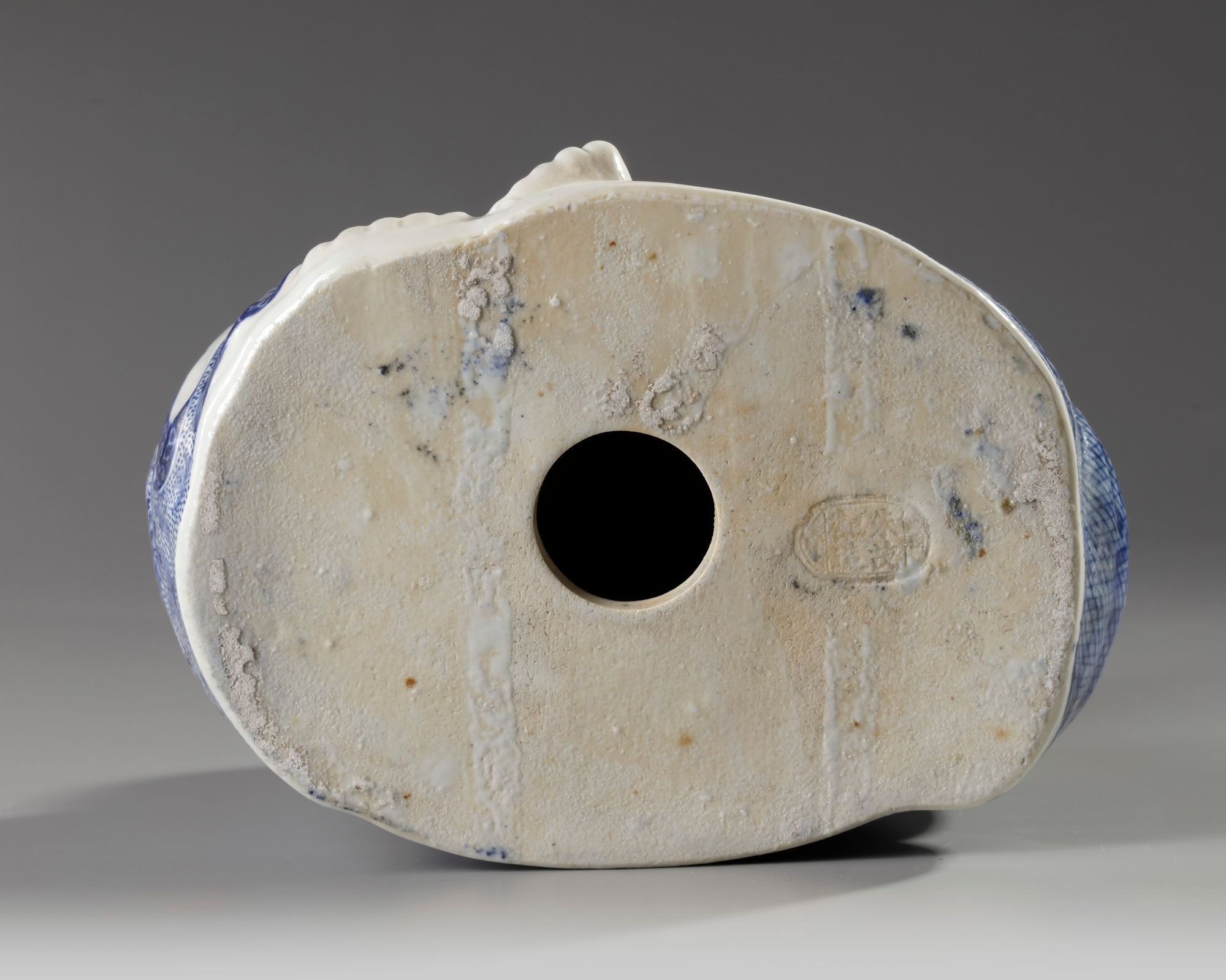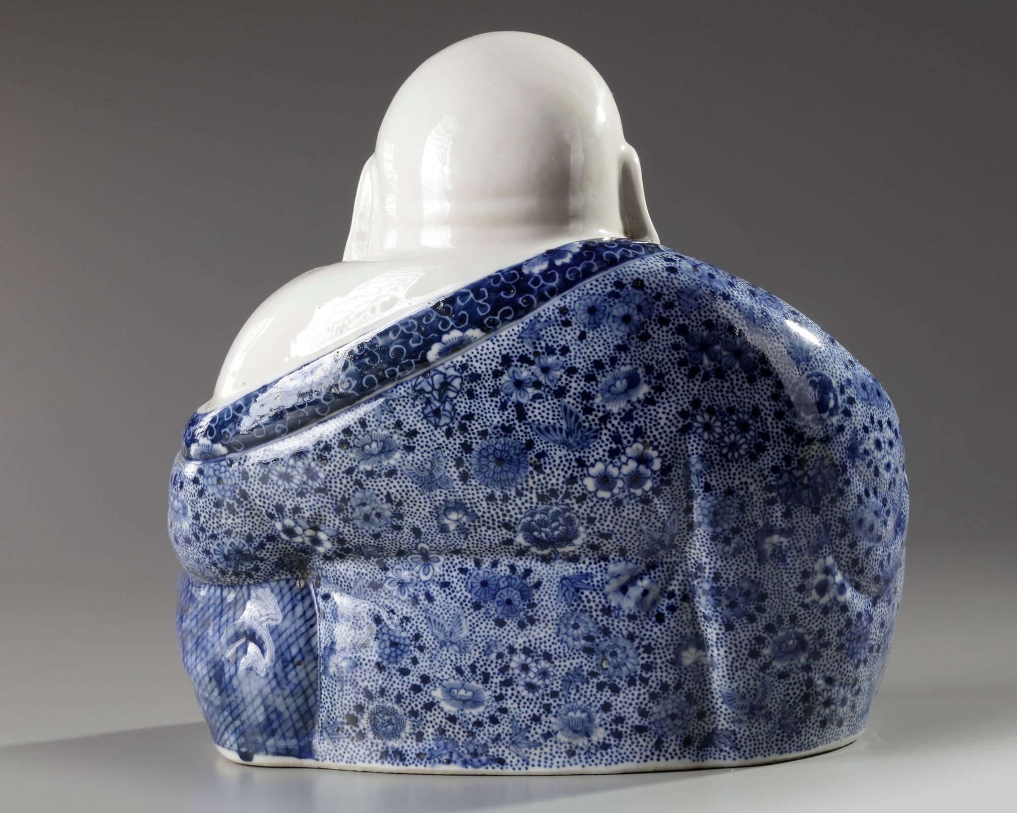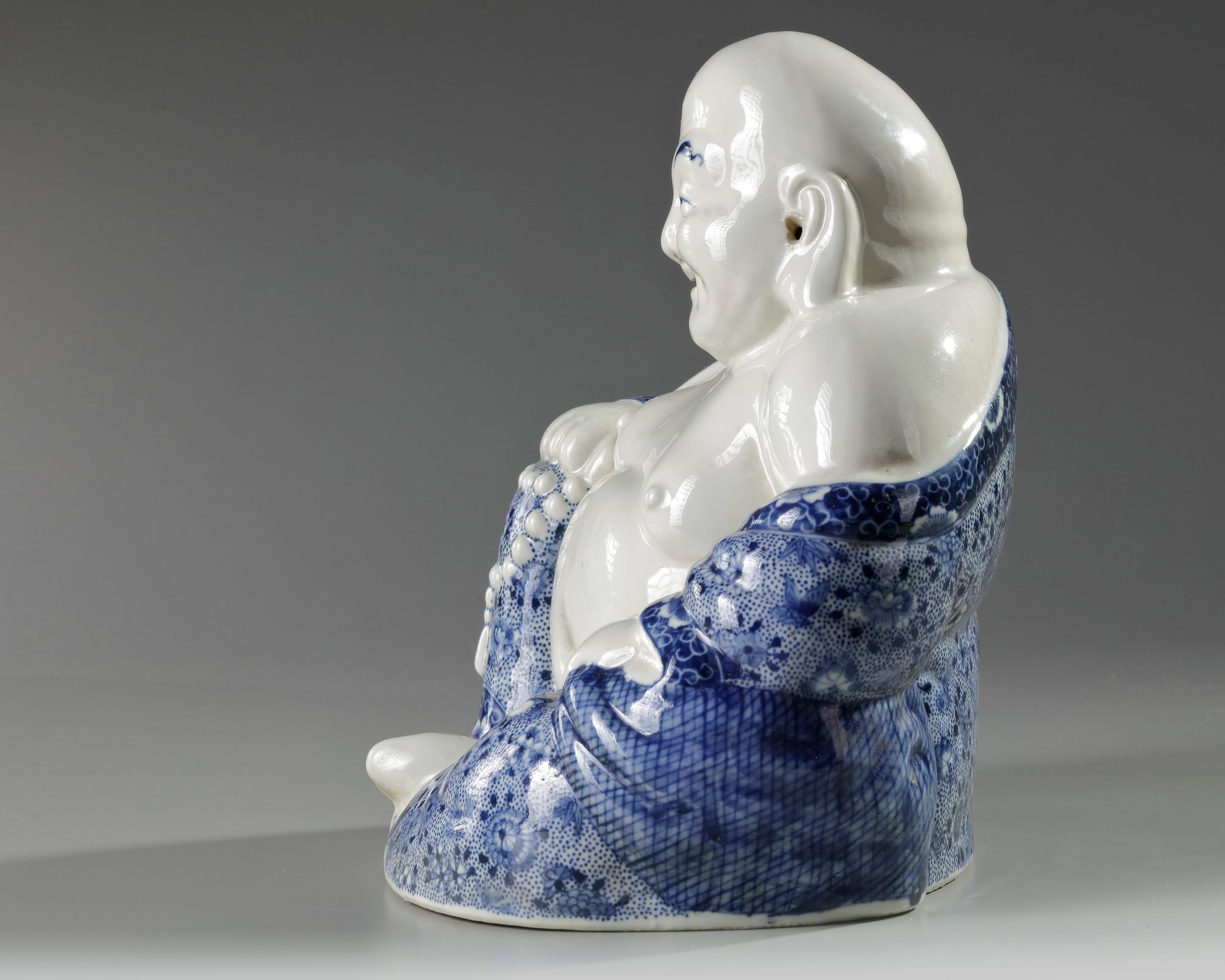 The smiling figure is modelled with pendulous earlobes. He wears a long robe which is open at the chest and decorated with flowers sprays on a seeded ground. He is holding prayer beads in one hand and a burlap sack in the other. The underside with a stamped mark reading 'Jiangxi Zhu Maoji zao' (Made by Zhu Maoji in Jiangxi).