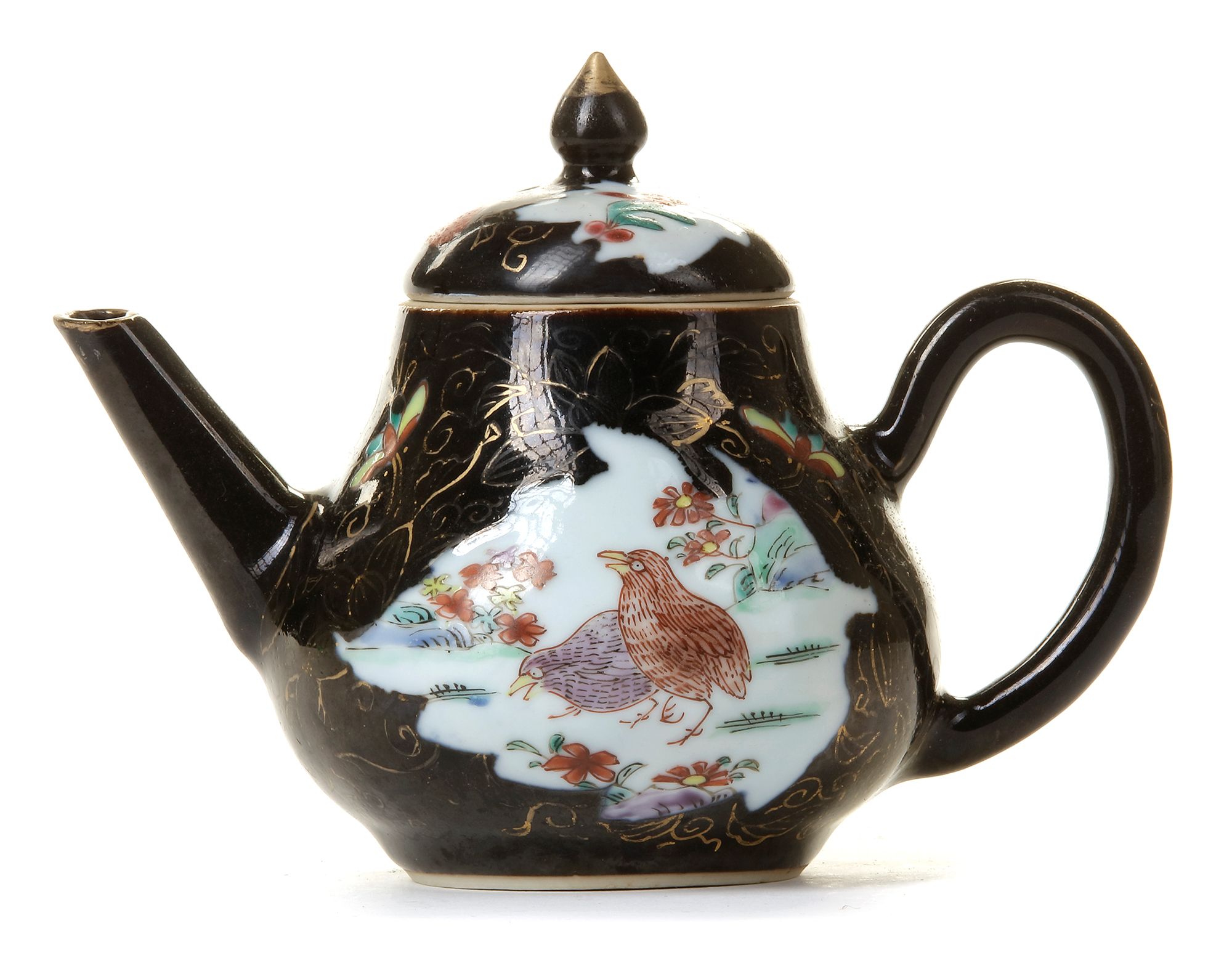 Decorated with two leaf-shaped panels enclosing two quails amongst flowers, all reserved on a black-glazed ground decorated with gilt and famille rose butterflies.
