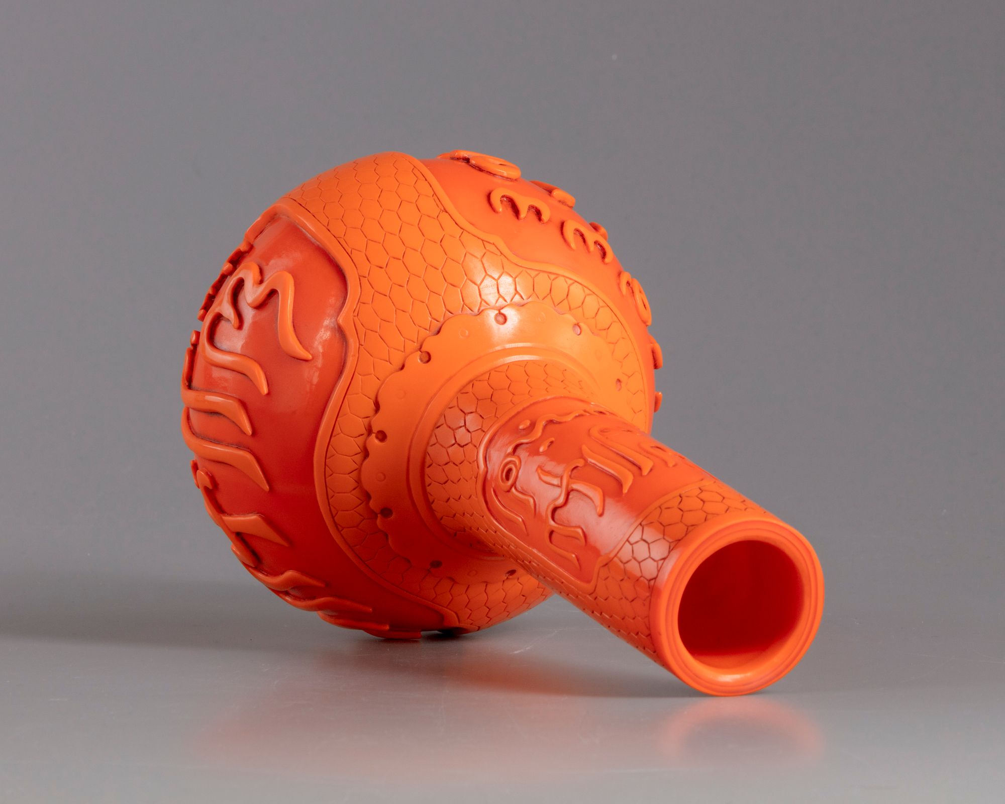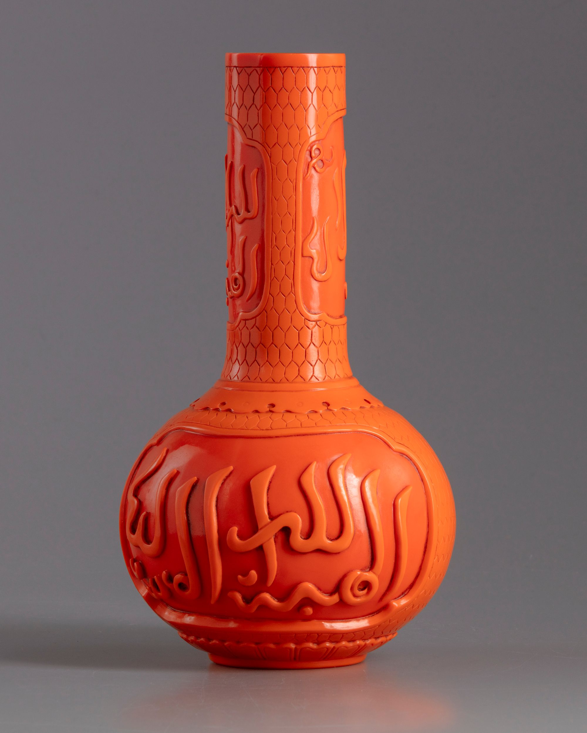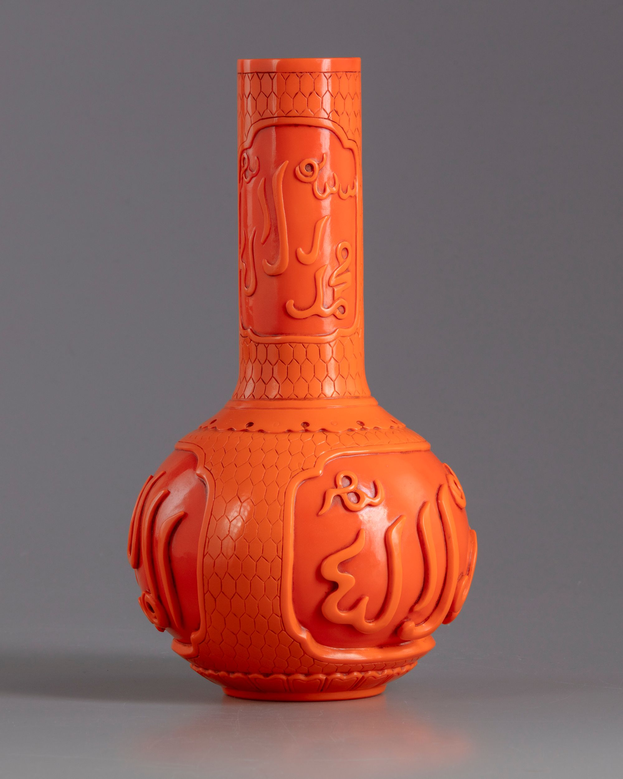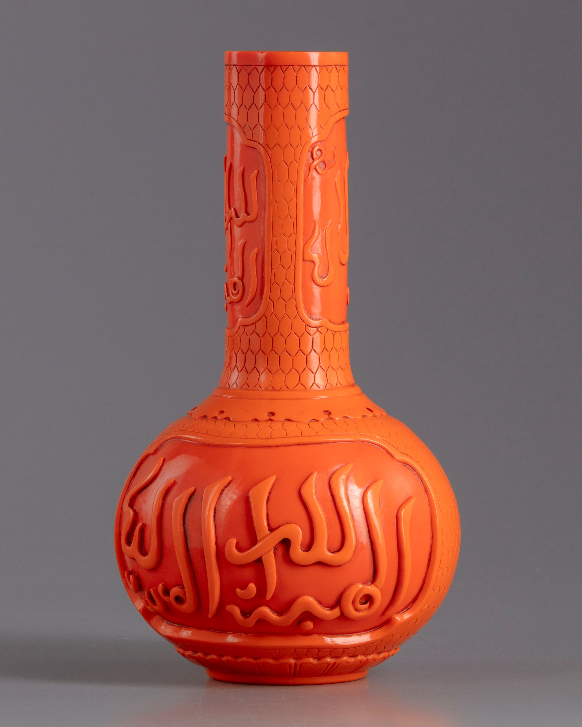 A Chinese orange peking glass vase , carved to the neck and the body each with two panels enclosing Arabic inscription.
