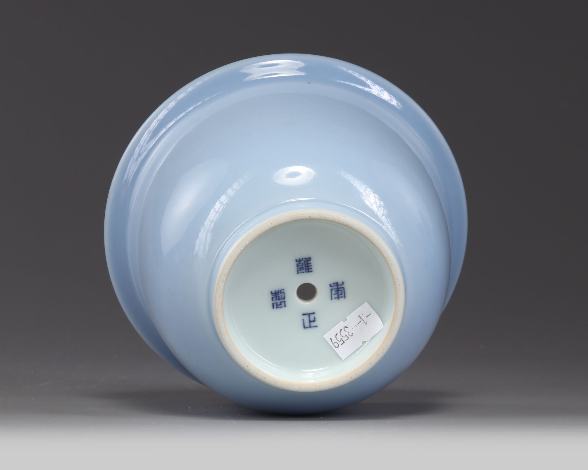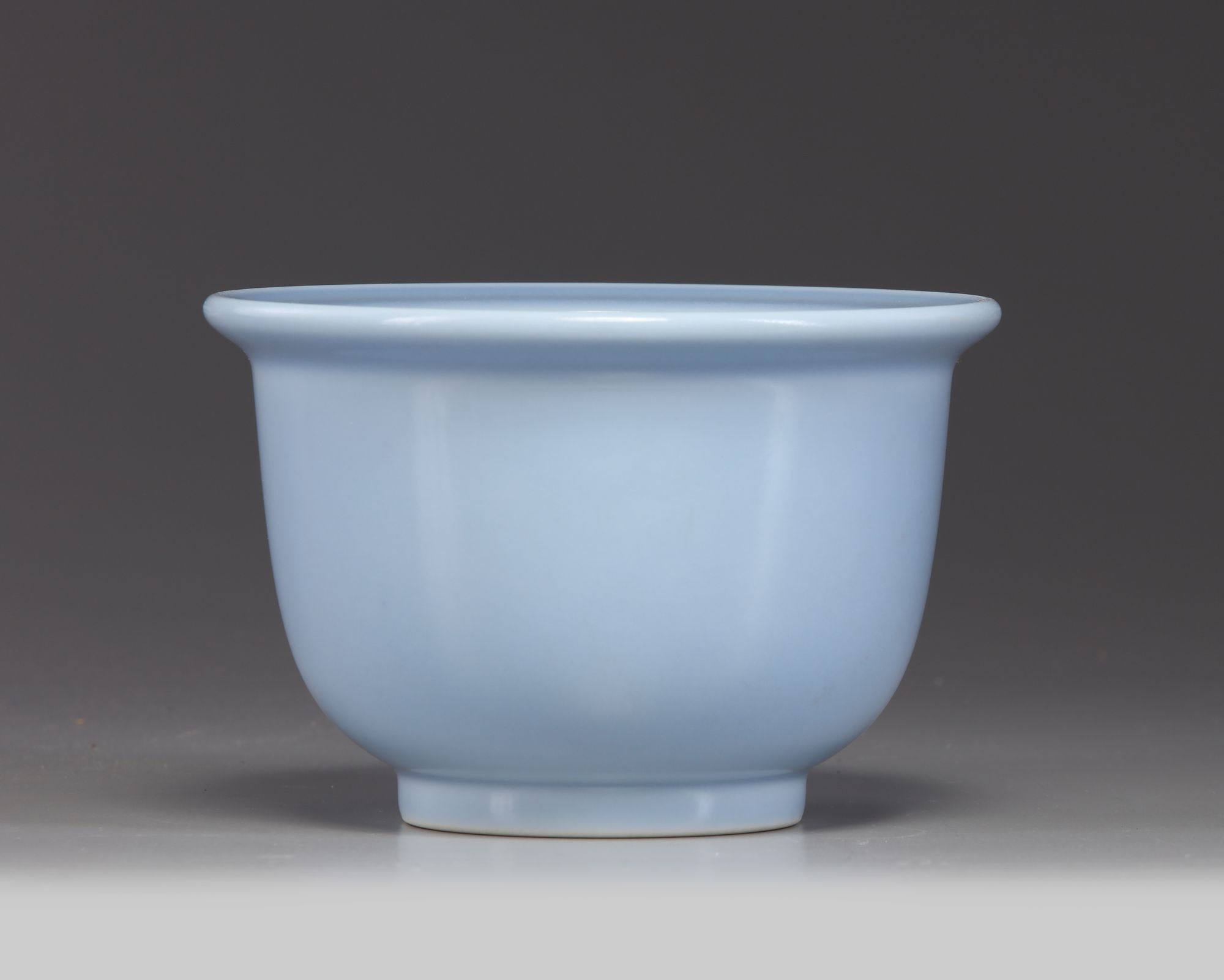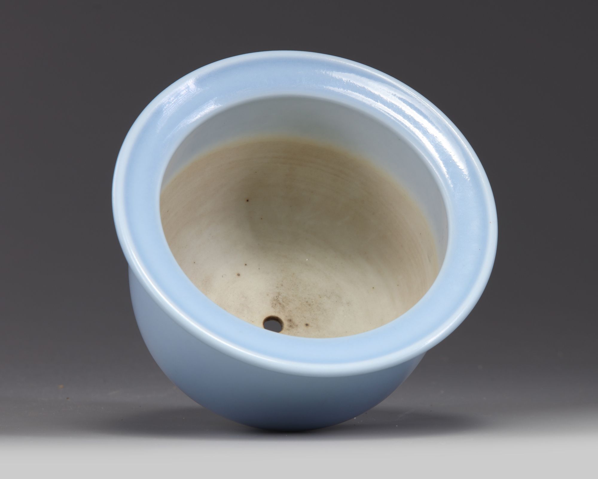 The small jardinière is covered to the exterior with a pale lavender blue glaze. The base is glazed white with an apocryphal Yongzheng mark around the aperture.