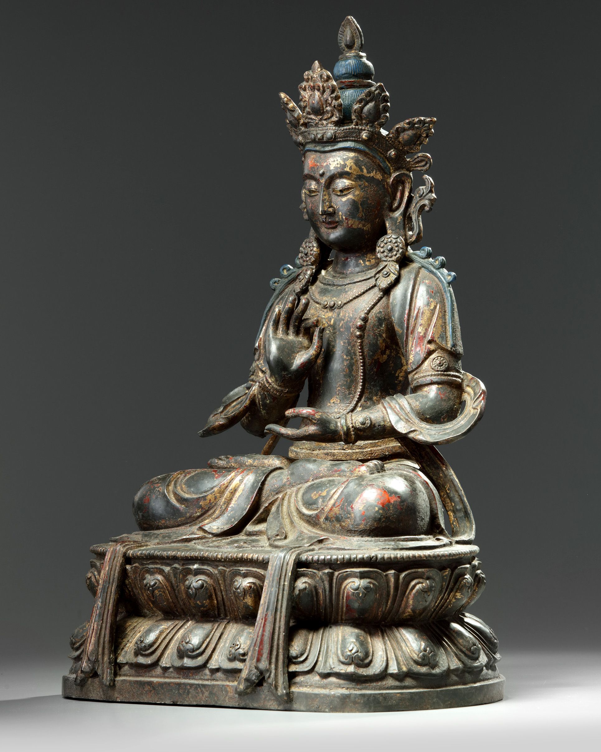 The figure is modelled with a serene expression and hair piled high behind a diadem. The figure is heavily bejeweled and wears celestial scarves, with hands in vitarka mudra, all on a double lotus base.