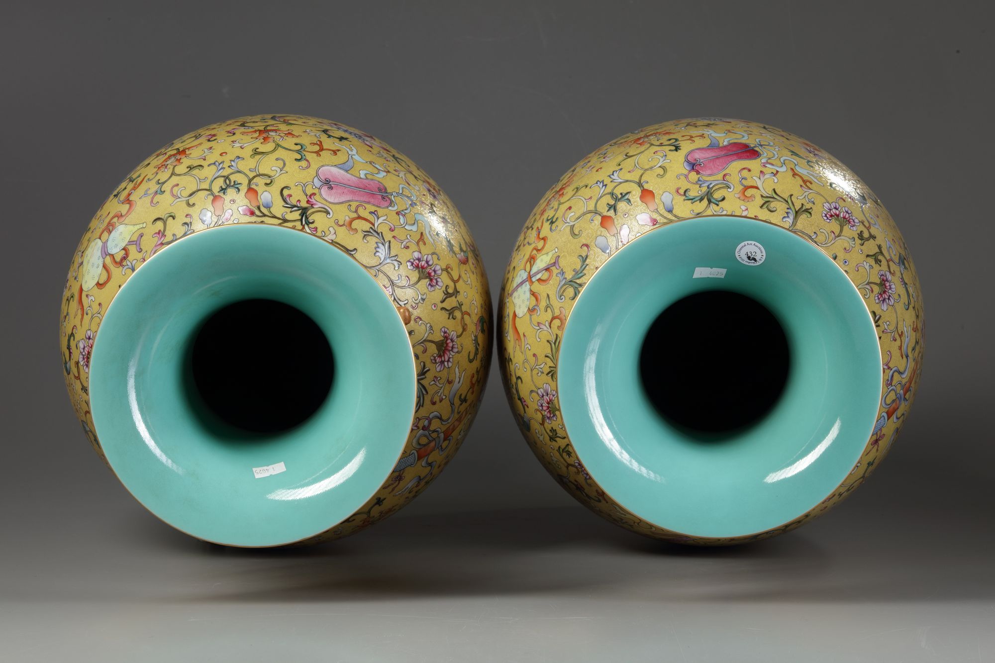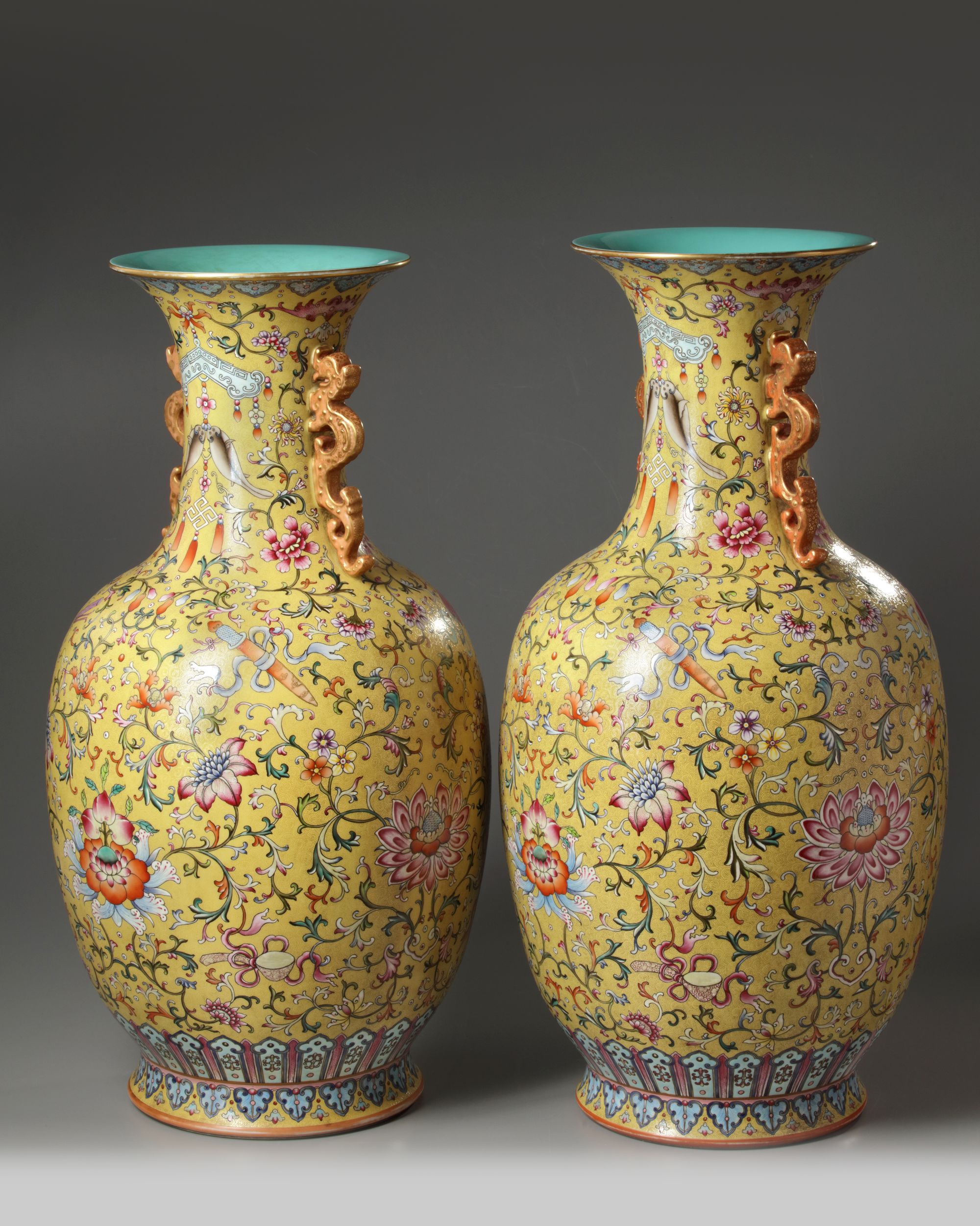 The massive vases mightily constructed with an ovoid body sweeping up to a waisted neck and flared rim, the exterior luxuriantly decorated in the famille-rose palette with large stylised flower heads, including lotus, iris and honeysuckle, all wreathed by feathery foliate scrolls, a cluster of peaches issuing from one large bloom in the centre, the floral blooms interspersed with beribonned anbaxian emblems, including a double-gourd, a fan, a sword and a basket of flowers, all above an upright elongated ruyi-shaped lappet border encircling the base, the neck decorated on both sides with a stylised floral bloom suspending a chime with a double-fish and a tasselled wan symbol attached to it, the neck flanked by a pair of scroll handles in the form of a stylised dragon, all between three bands of various petal lappet bands encircling the rim, base and splayed foot respectively, the footrim bordered with an iron-red 'classic scroll' band, the opulent design delicately picked out in white and shaded tones of rose-pink, blue, green and red and reserved on a ground of brilliant lemon-yellow ground finely engraved with dense sgraffiato feathery arabesques, the interior and base enamelled turquoise, the base inscribed with a Qianlong four character mark with a double square.