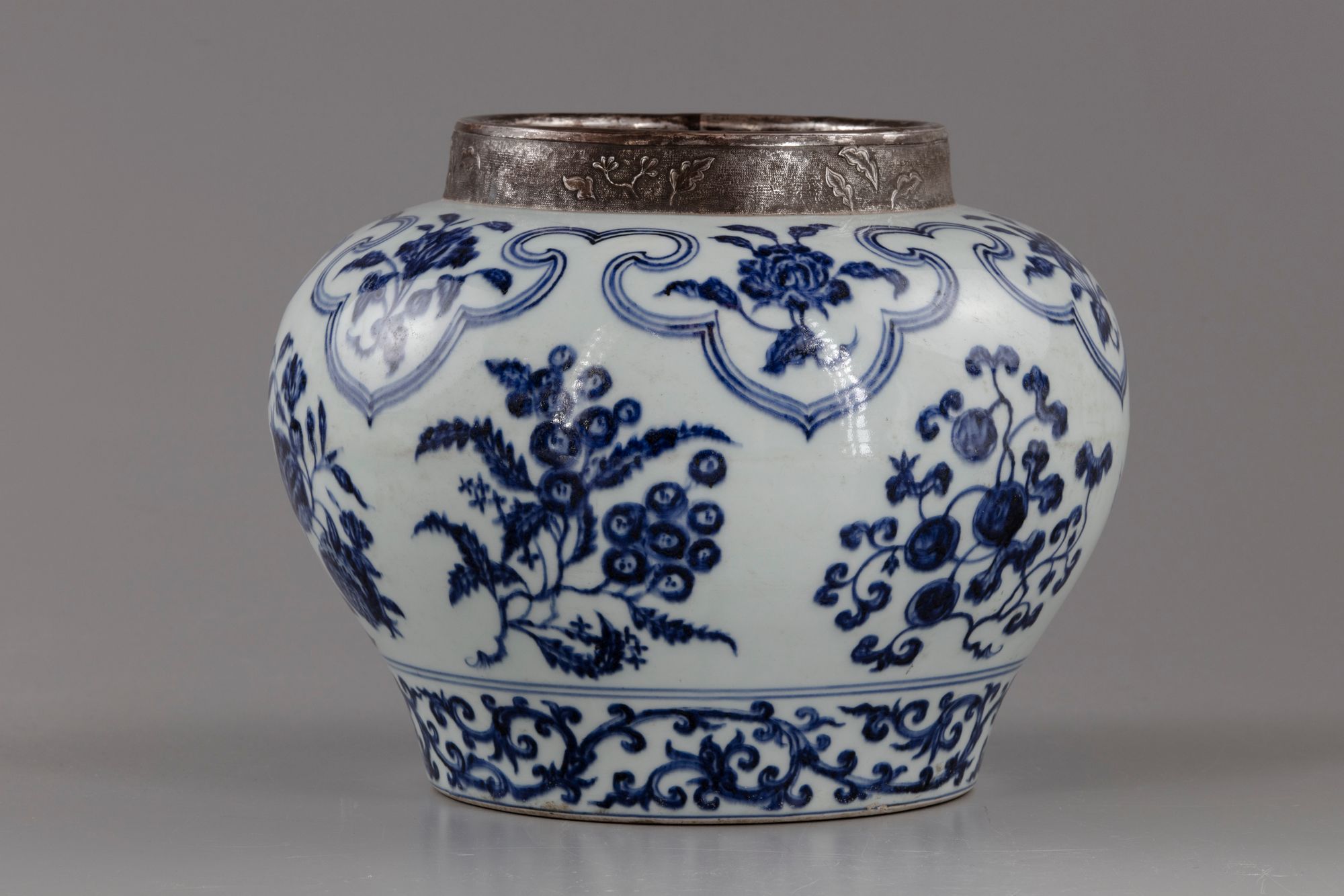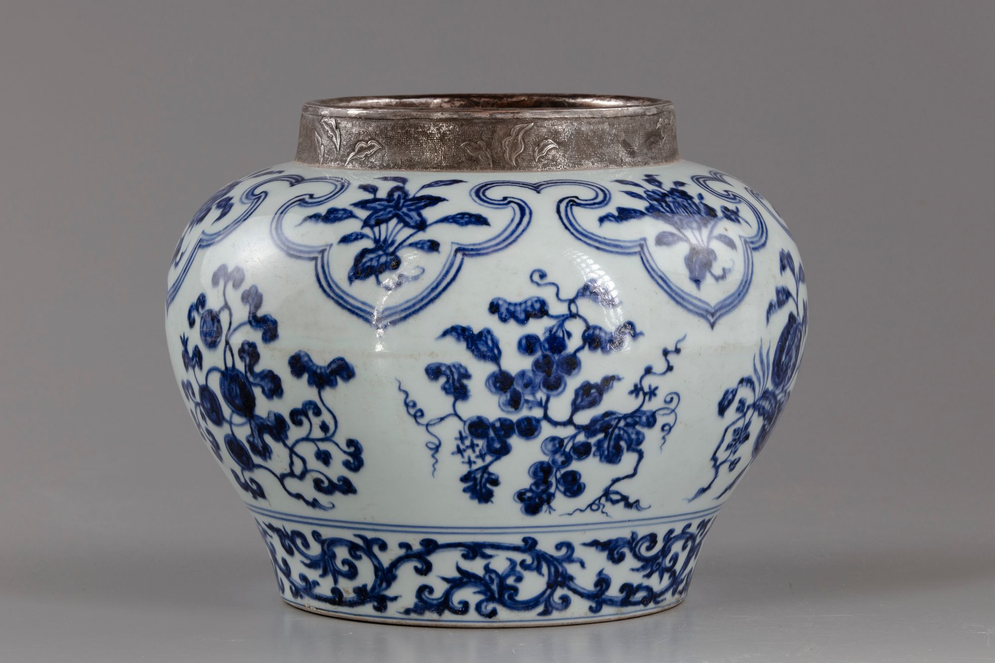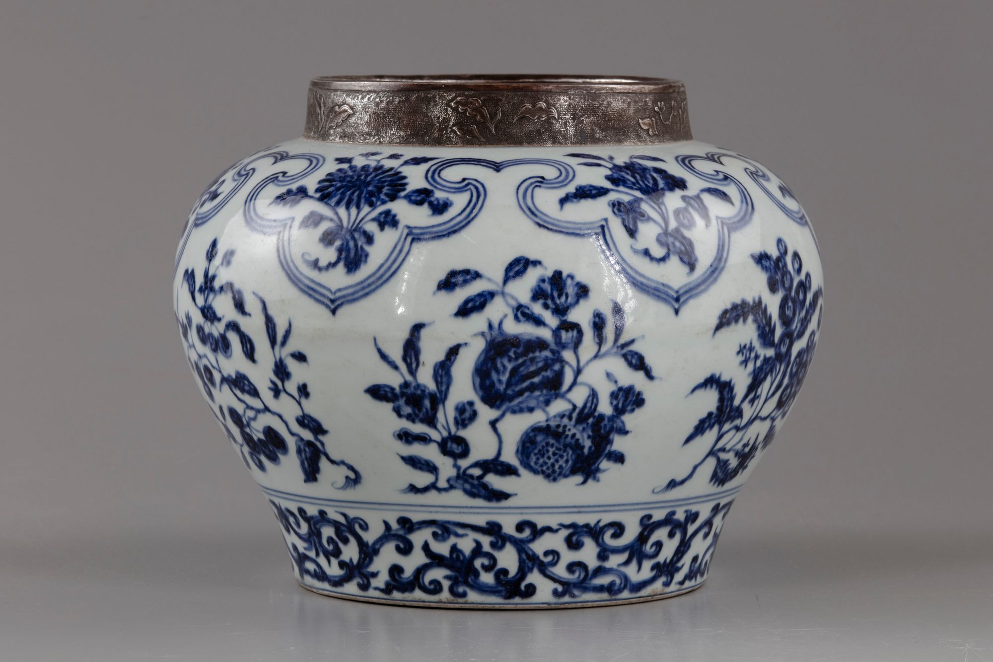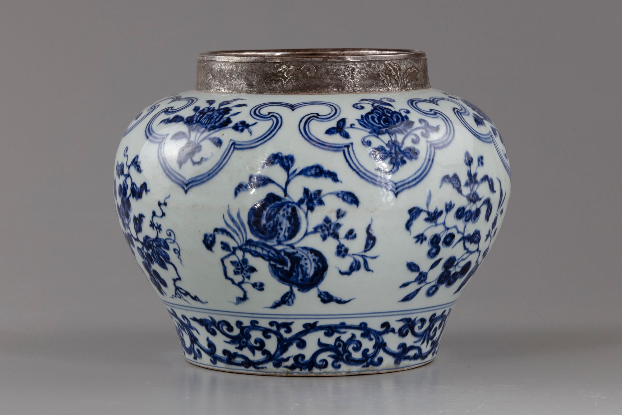 The vessel is boldly painted in underglaze blue with fruiting branches of pomegranate, peaches, cherry and other fruits, to the shoulder with ruyi heads band enclosing flower sprigs