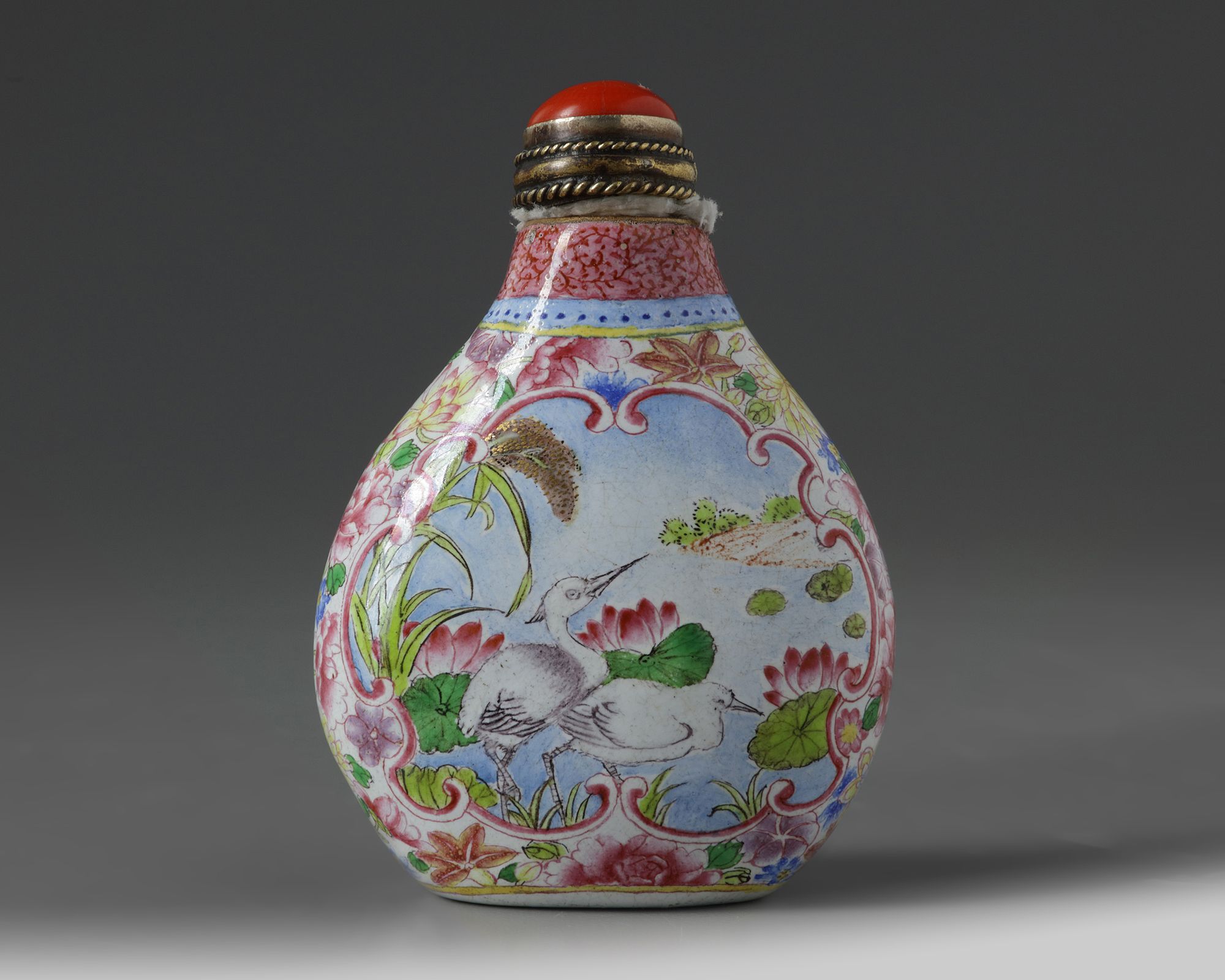 The bottle is decorated to one side with cranes and lotus the other side with a pair of mandarin ducks, all separated by a millefleur ground. The base with an apocryphal Qianlong mark.